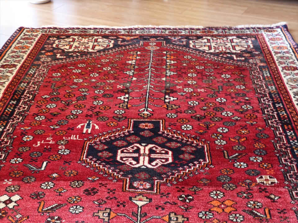 | 赤い六角メダリオンは、途中で赤の色が変化していて、これは染めのロットが違う毛糸を織り交ぜて使ったためと思われます。小さなモチーフがややすき間をあけて織り込まれていて、全体的にゆったりとした印象。モチーフが過密でうるさい感じではないところが、このラグのいいところです。特徴は、中央の左よりに、男性がひとり立っていて、ペルシャ文字でサインが織り込まれています。 |