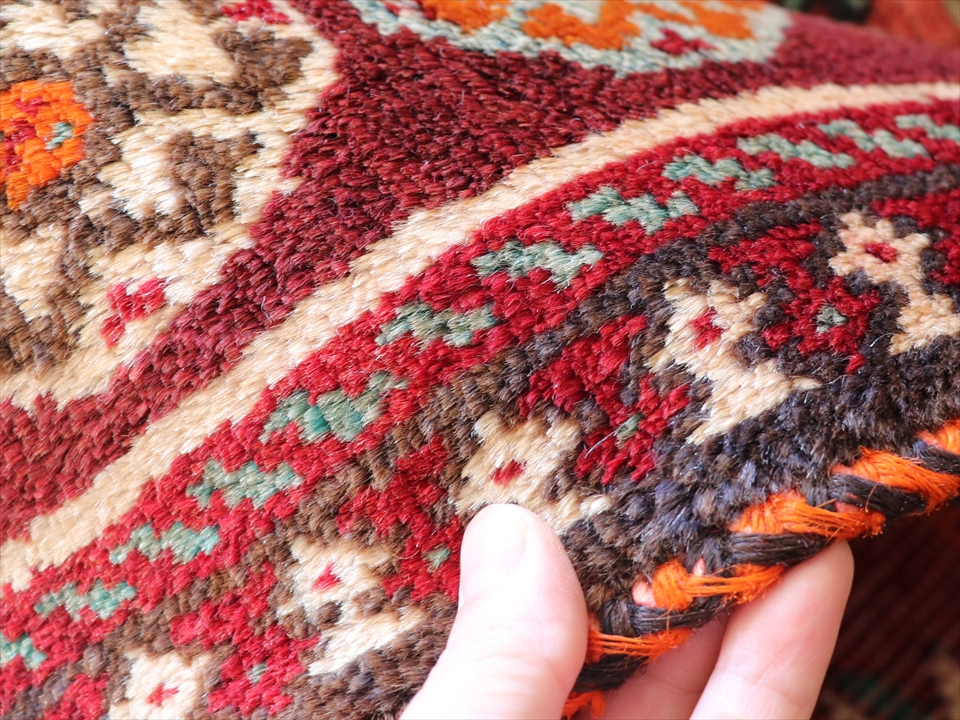 | 毛足(パイル)は短めに刈り込まれていて、ベースを含めたラグの厚みは1cm前後。織られてから、使わずに保管されていたようで、ほとんど色あせがなくきれいな色を残しています。水色やグリーンは、長い間紫外線にあたっていると、少しつ褪色してグレーっぽくなることが予想されます。 |