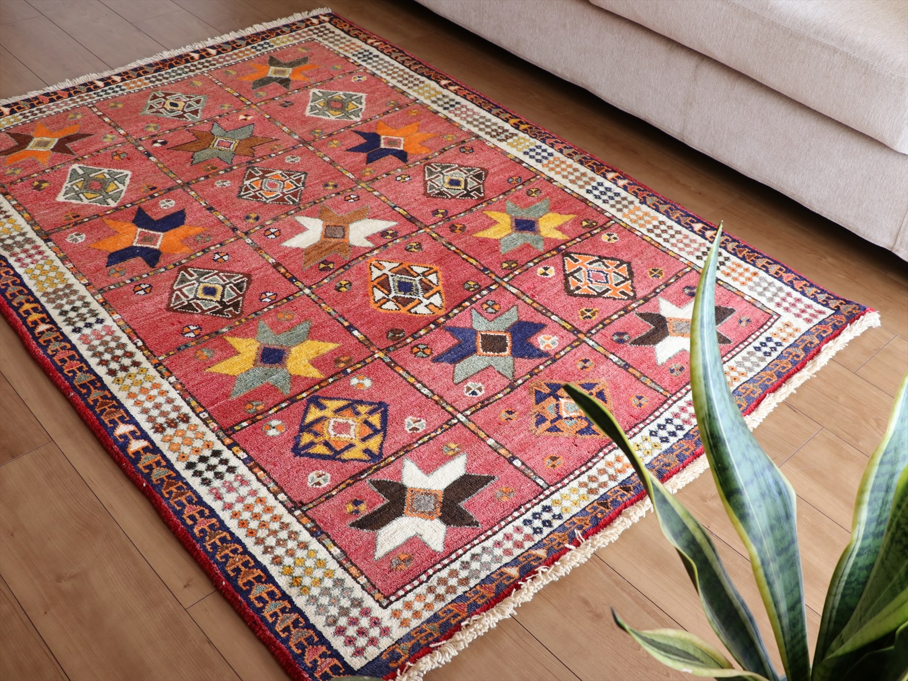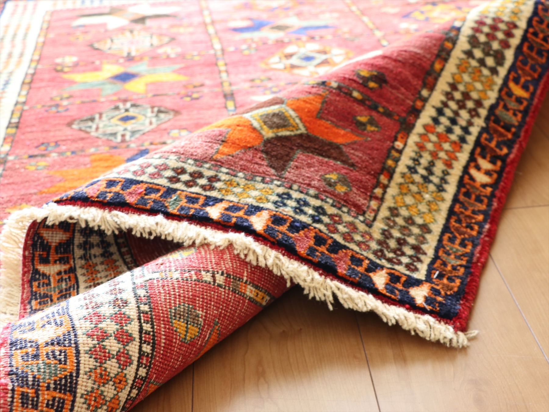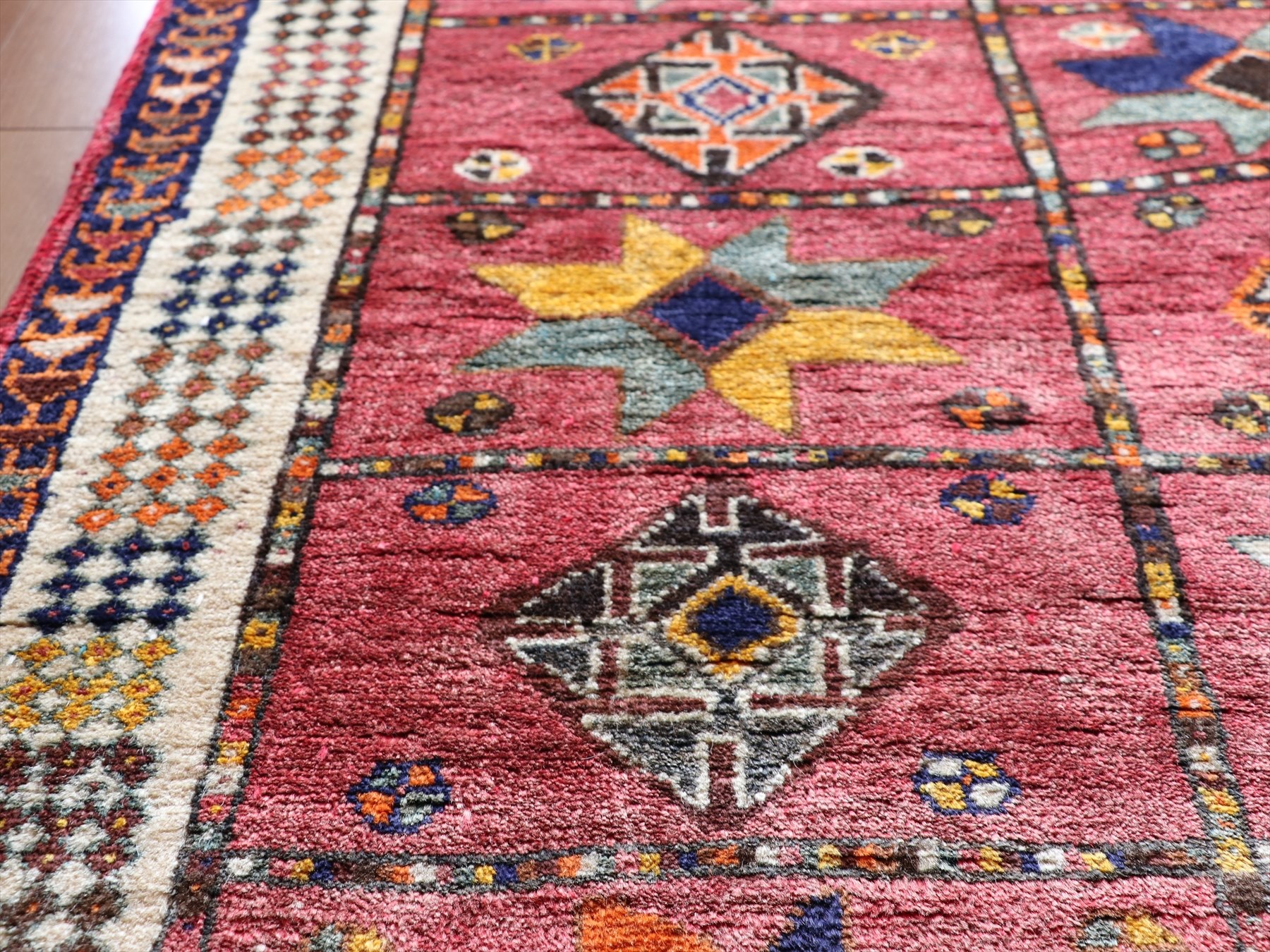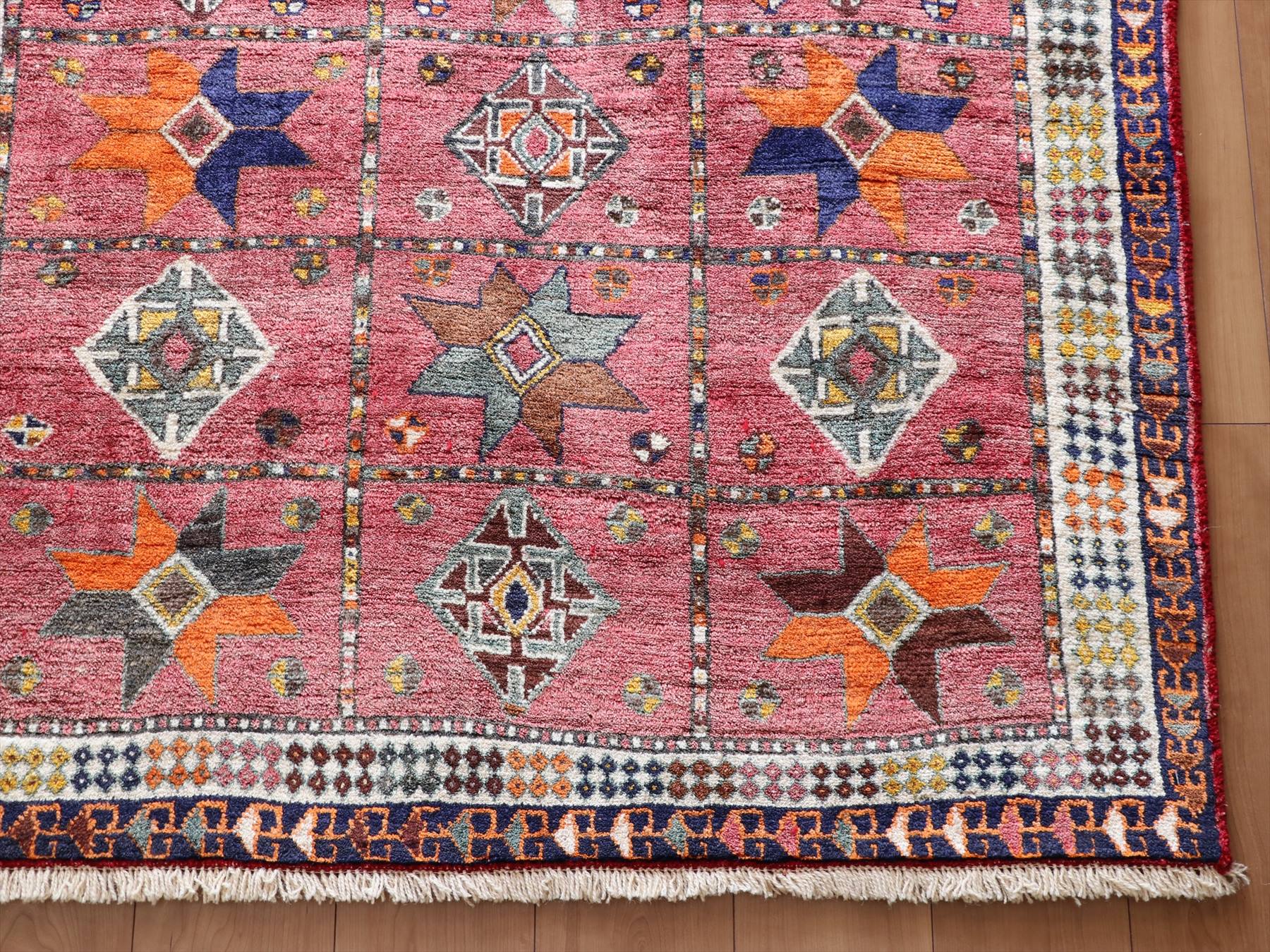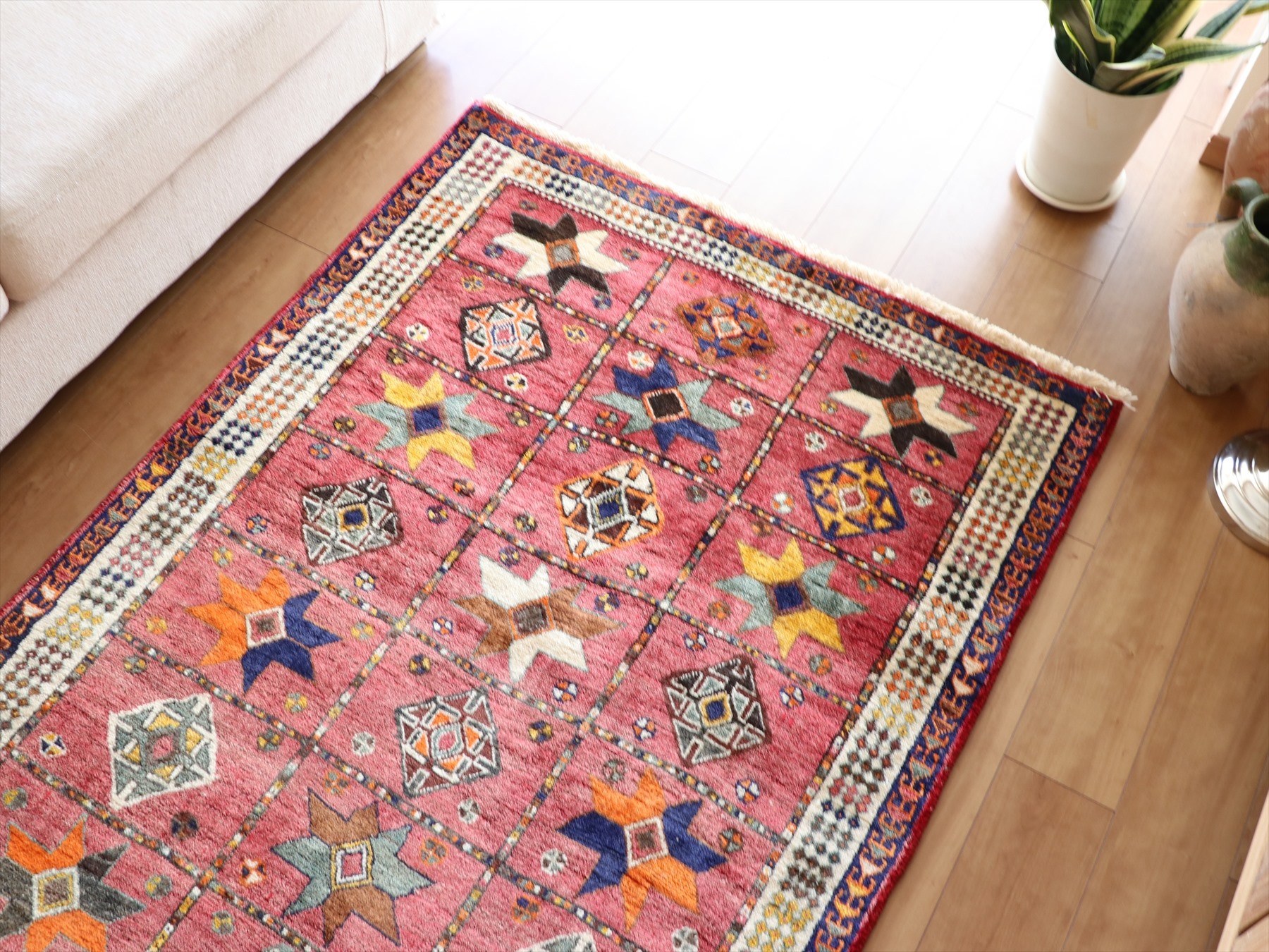 | 色褪せてピンクっぽく変化したレッドに、色取り取りの風車のようなモチーフが織りこまれています。ぶ厚い織りのギャッベを織ることで知られる、イラン南部の遊牧民・カシュカイ族の伝統柄です。 |
