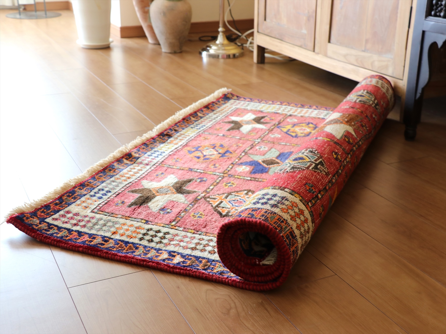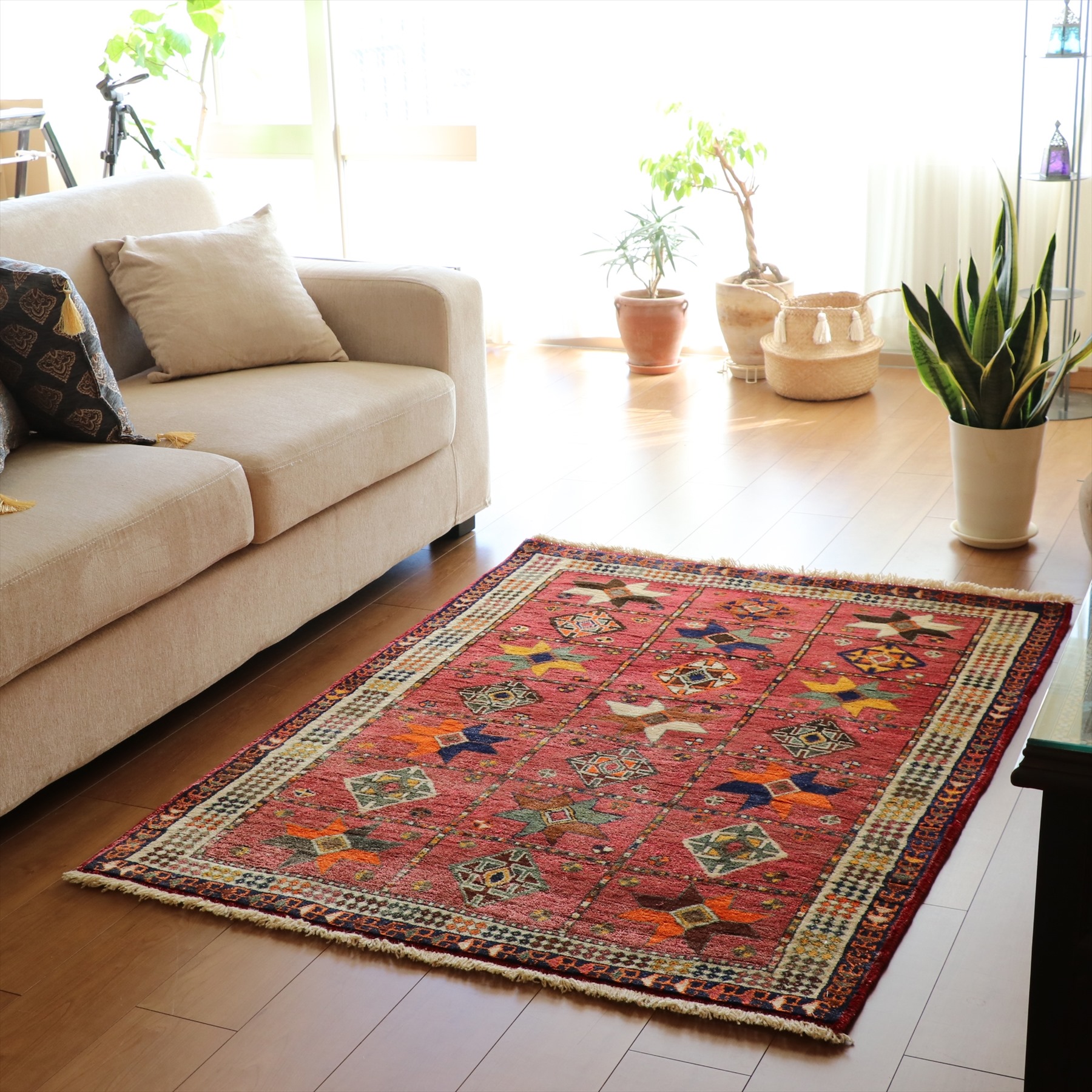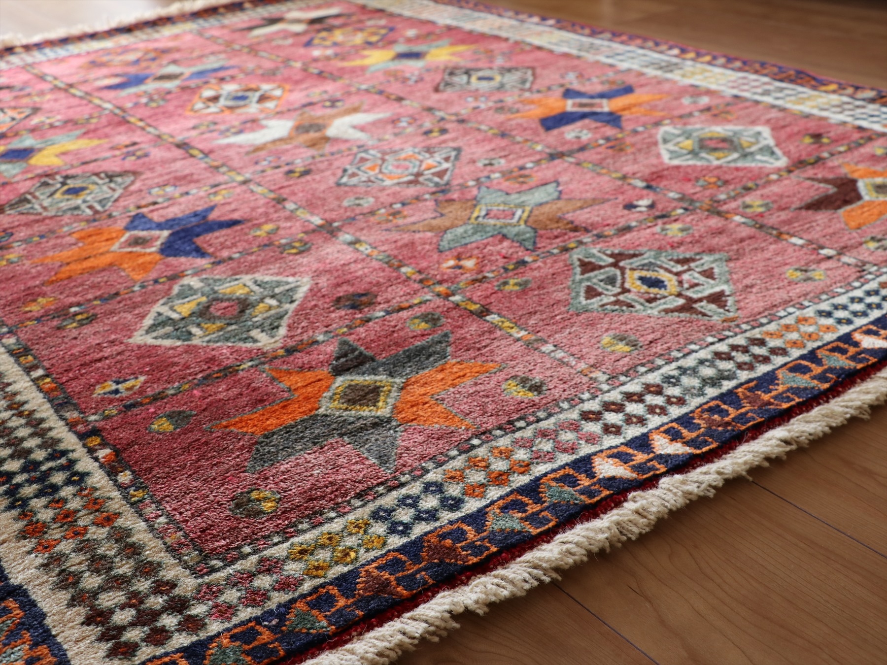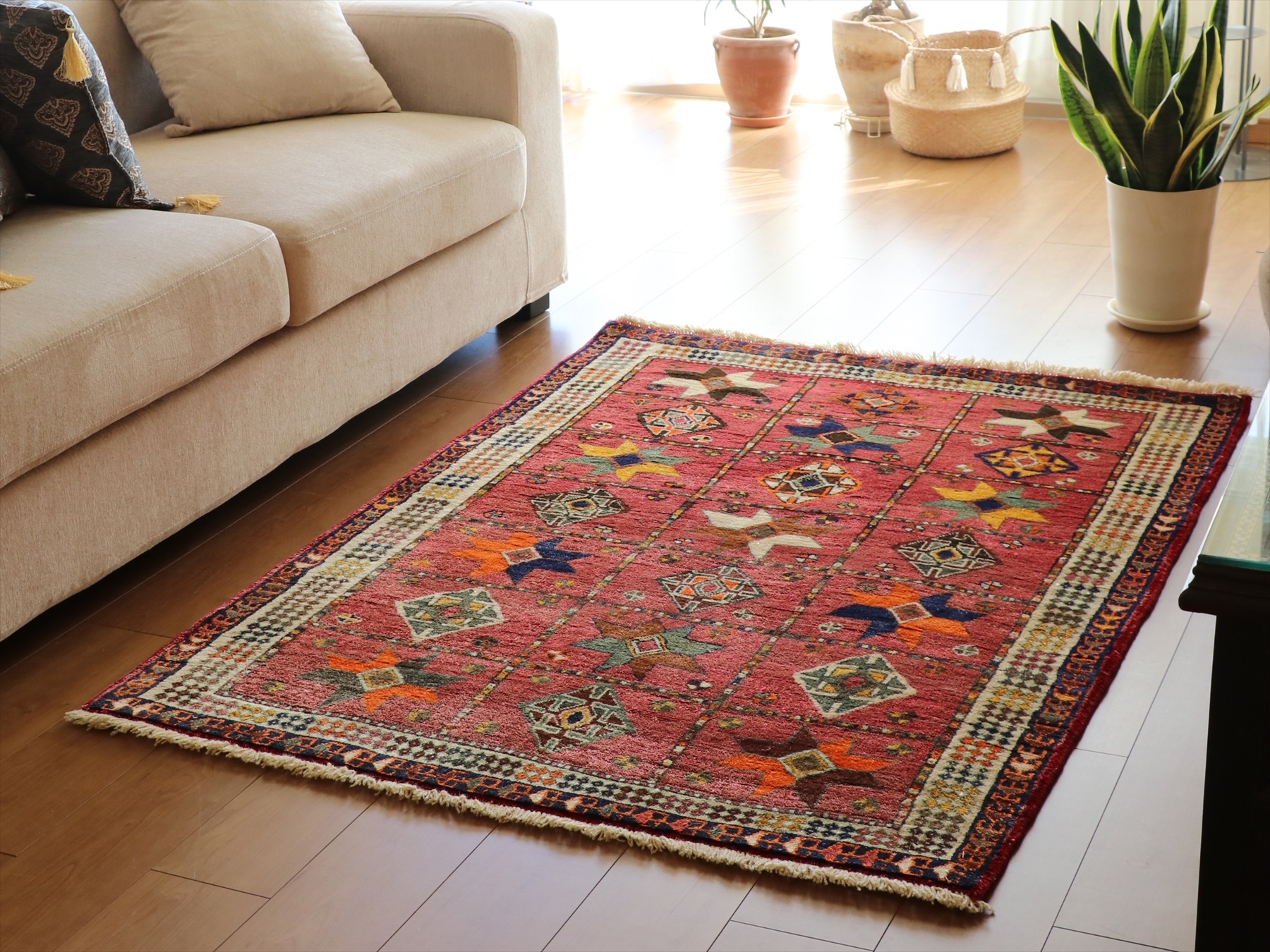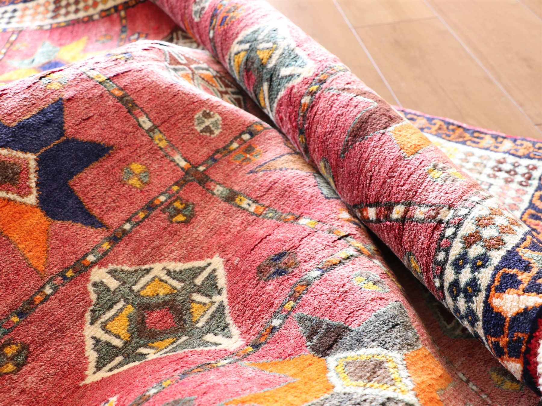 | 色褪せてピンクっぽく変化したレッドに、色取り取りの風車のようなモチーフが織りこまれています。ぶ厚い織りのギャッベを織ることで知られる、イラン南部の遊牧民・カシュカイ族の伝統柄です。 |