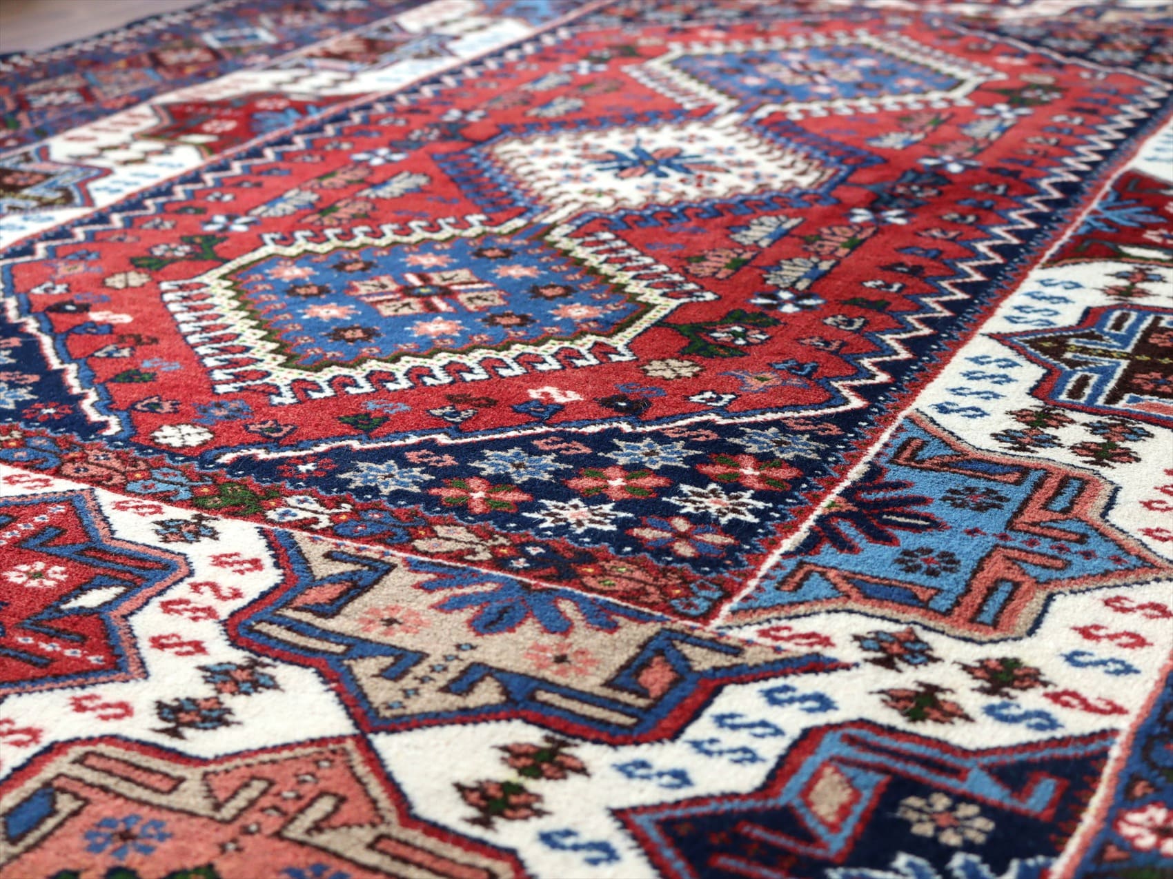 | センターには3つのドラゴンの爪をもつメダリオン織られ、その周りのアイボリーのフィールドには、幾何学模様が色を変えながら連なるように並んでいます。ボーダー部分はダイヤと小花が、やはり色を変えながら織られていて全体的に華やかです。 ヤラメ(Yalameh)とは、ギャベを織るカシュカイ族の中でも早い段階で定住生活に入ったグループで、現在では古都イスファハンからシーラーズの間のエリアに点在して多く暮らしています。トルコ語に近い言語を話し、じゅうたんのデザインもまたキリムに似た幾何学モチーフが使われています。 |