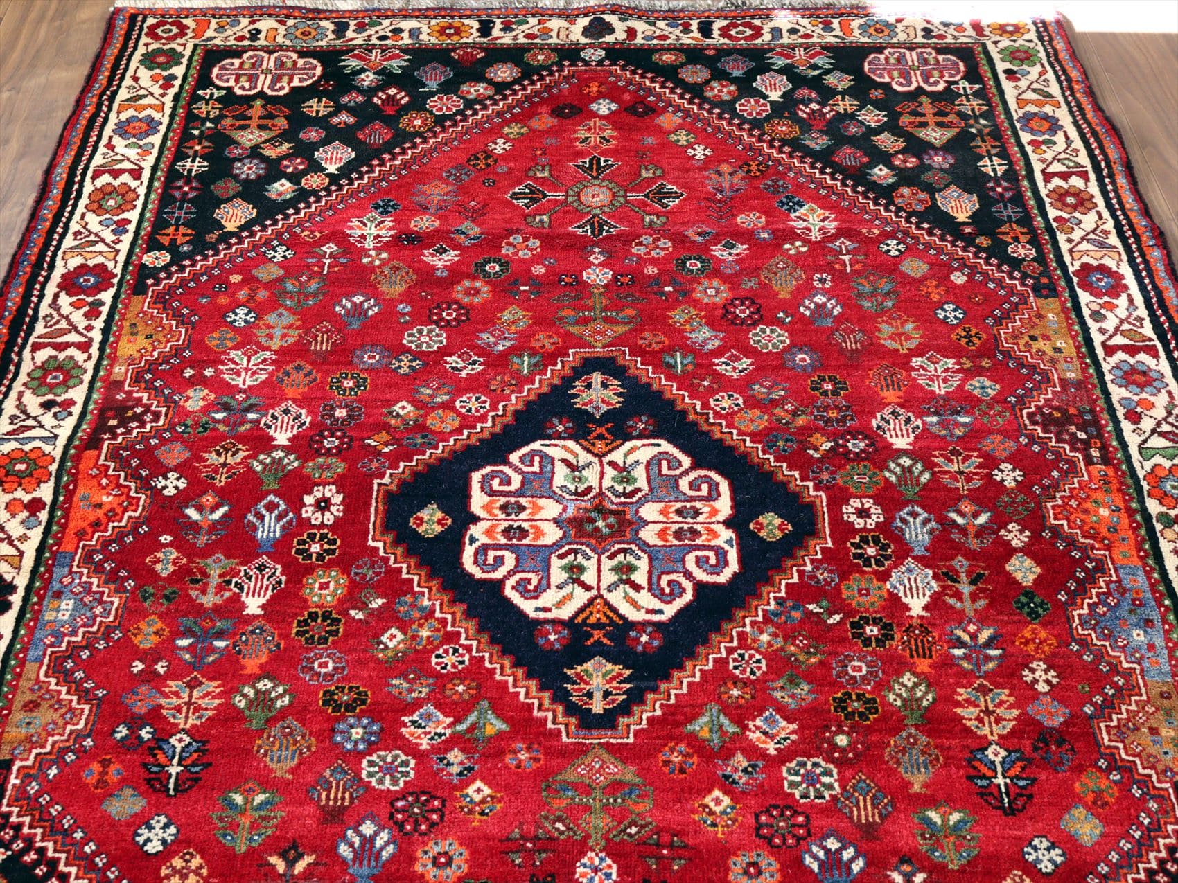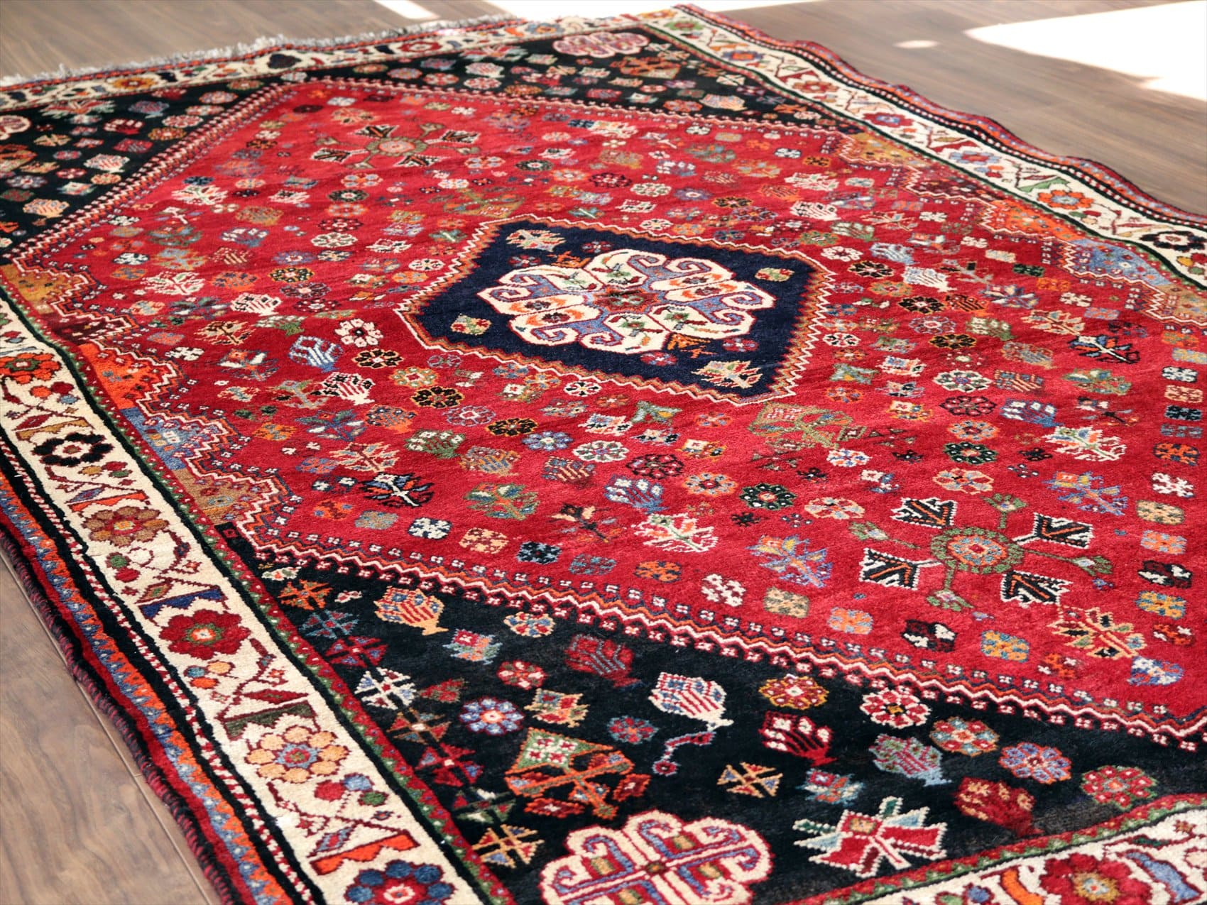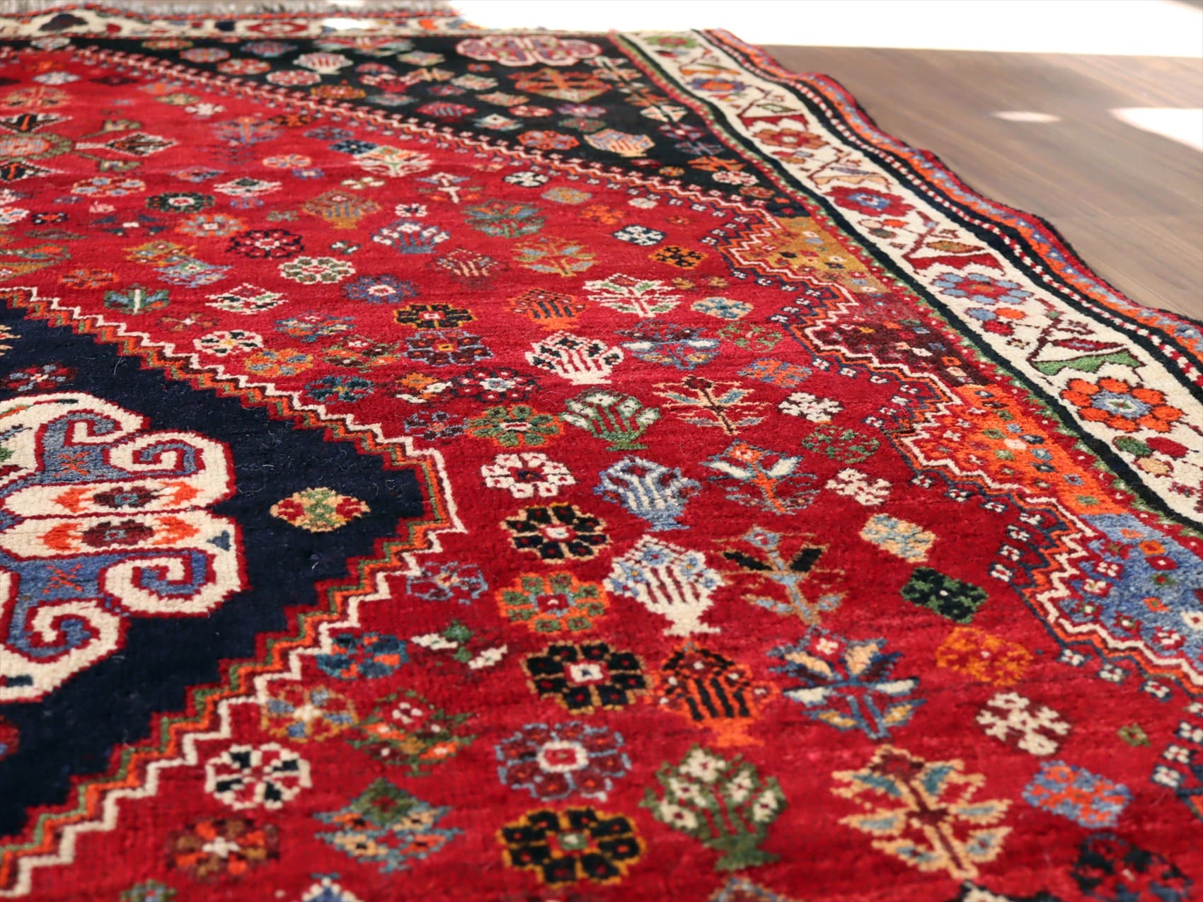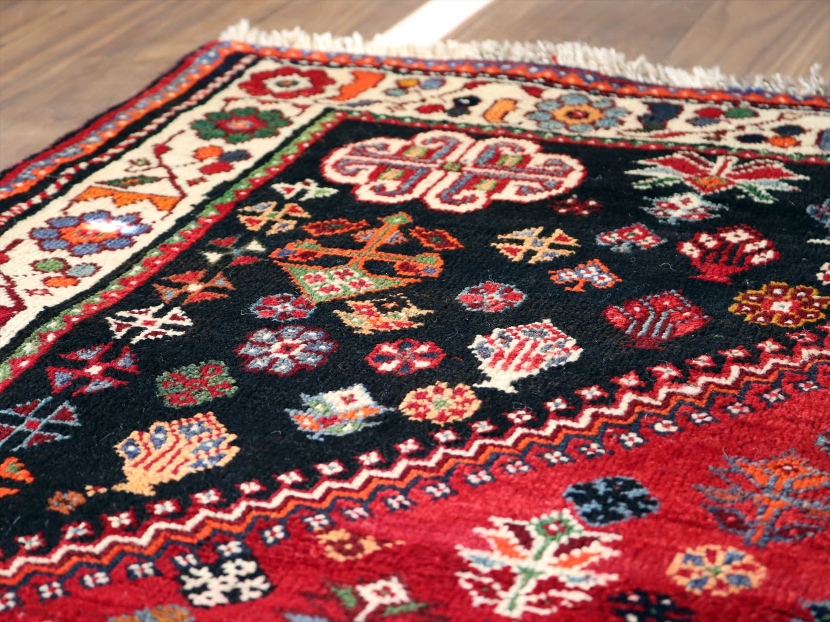 | 赤い六角メダリオンの中央に、濃紺のダイヤが織られたカシュカイ族のじゅうたんでよく目にする伝統的なデザイン。コーナーは黒っぽく見えますが、こげ茶の色が使われているようです。 ギャベを織ることで知られるカシュカイ族。カシュカイ族は比較的大きな部族で、いくつものグループに分かれて広いエリアを遊牧しているのですが、同じ部族だけあって織られる絨毯のデザインは似ているものが多いのです。六角形のメダリオンデザインは、カシュカイカーペットの中でもっともポピュラーなパターンでサファビー王朝時代に数多く織られています。 |