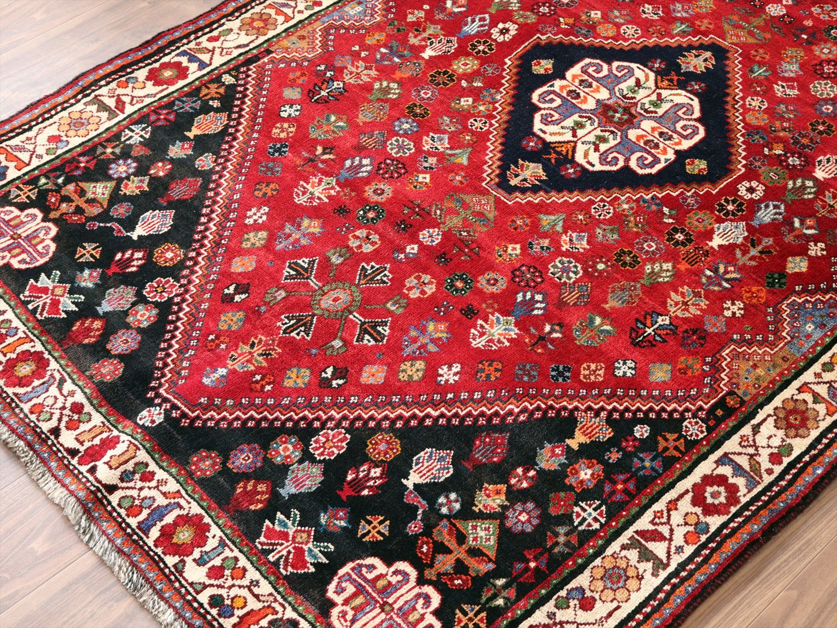 部族絨毯 トライバルラグ218×134cm カシュカイ族の手織りラグ 赤い六角メダリオン