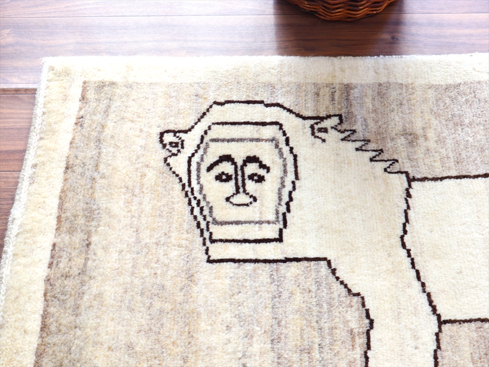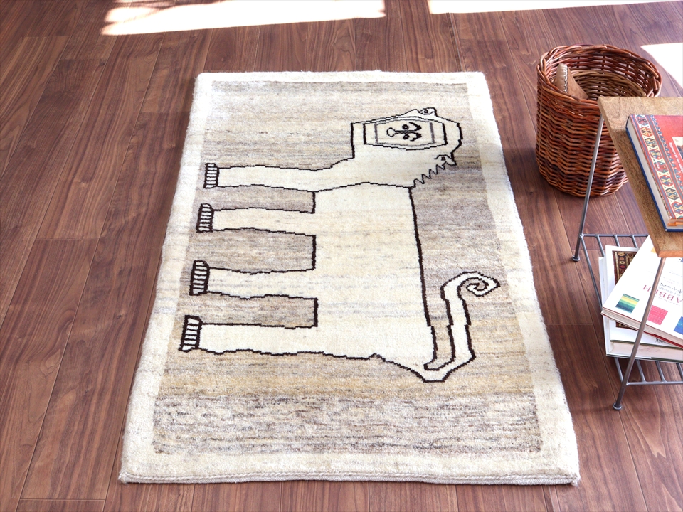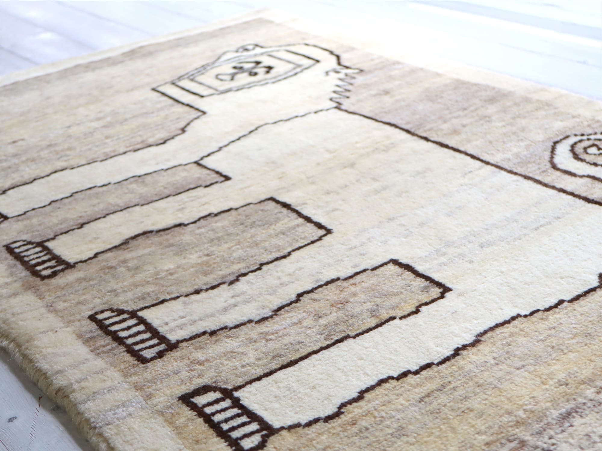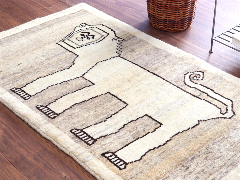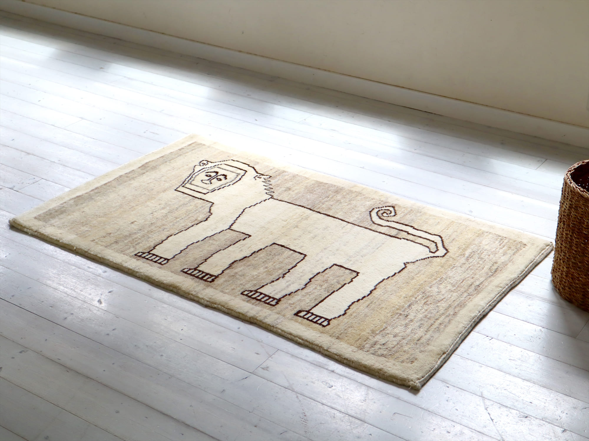 | 染めていない羊毛のアイボリーやグレーなどのナチュラルカラーのみを用いて、愛らしい表情で織り込まれたライオン。ライオンはギャッベを織るカシュカイ族の象徴ともされていて、古い時代には実際に見たことがなくても想像を働かせてライオンを表現していました。そのため、これはライオンなの?というユニークなものがたくさん登場したのです。こちらのピースは現代になってから、古い時代のライオンデザインを模して織られたものです。 |