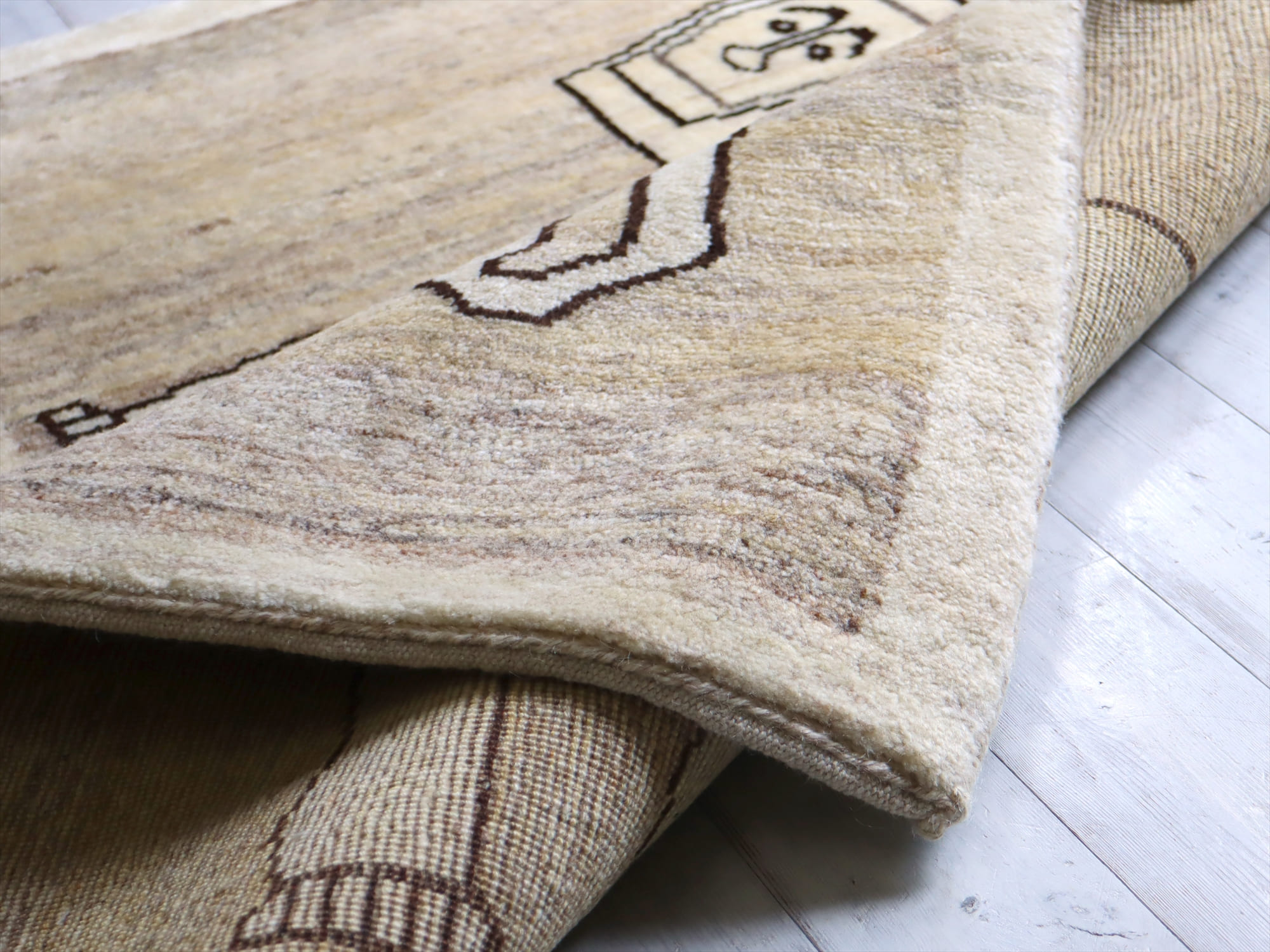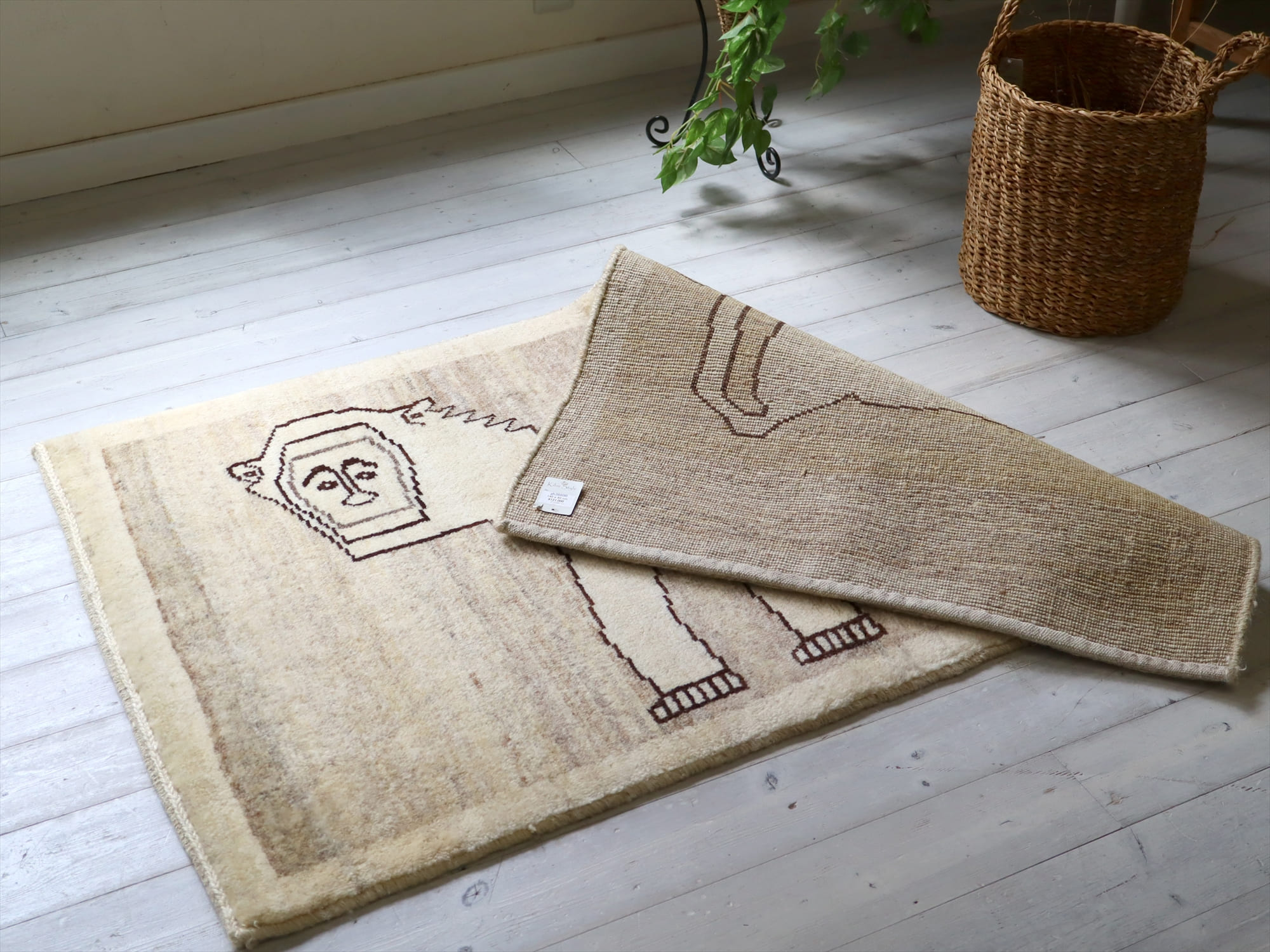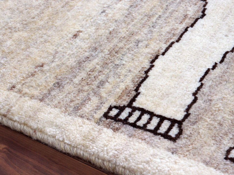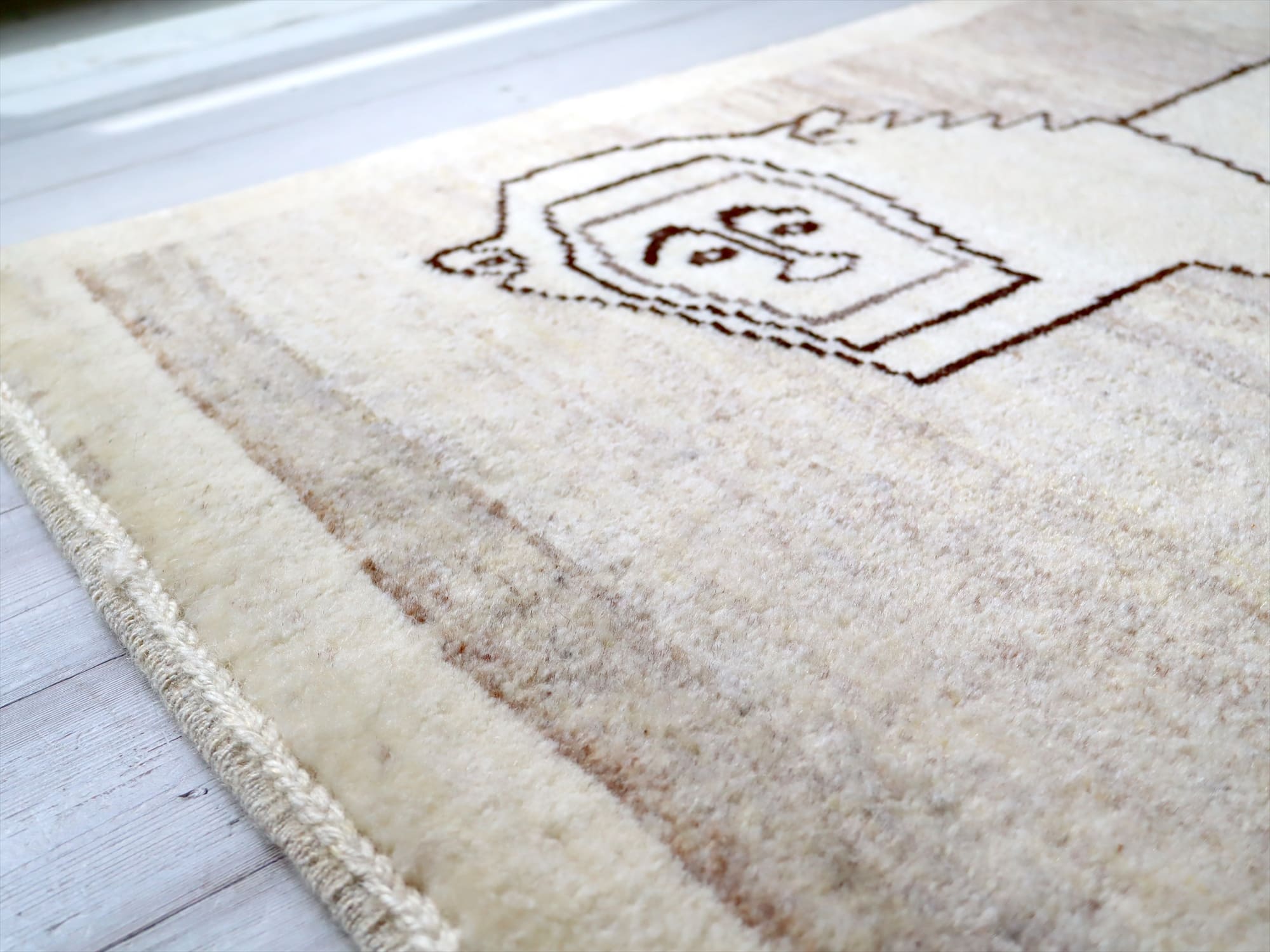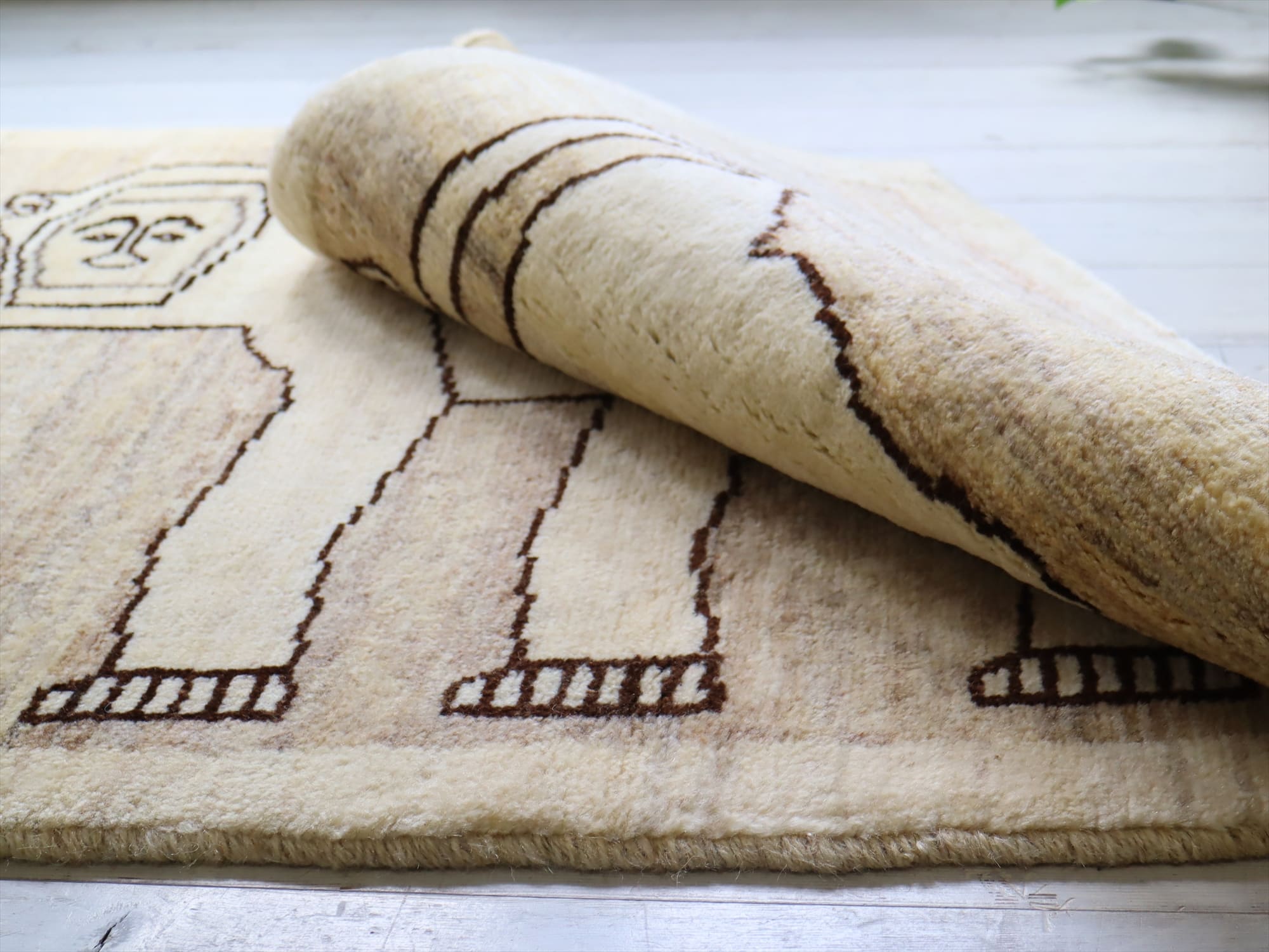 | 染めていない羊毛のアイボリーやグレーなどのナチュラルカラーのみを用いて、愛らしい表情で織り込まれたライオン。ライオンはギャッベを織るカシュカイ族の象徴ともされていて、古い時代には実際に見たことがなくても想像を働かせてライオンを表現していました。そのため、これはライオンなの?というユニークなものがたくさん登場したのです。こちらのピースは現代になってから、古い時代のライオンデザインを模して織られたものです。 |
