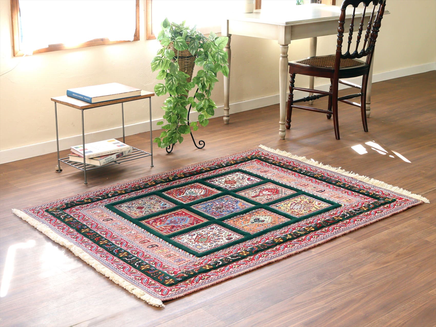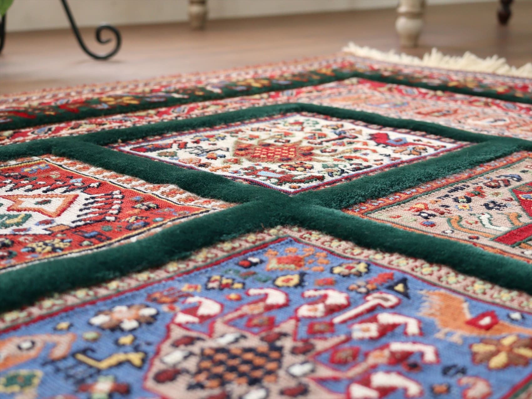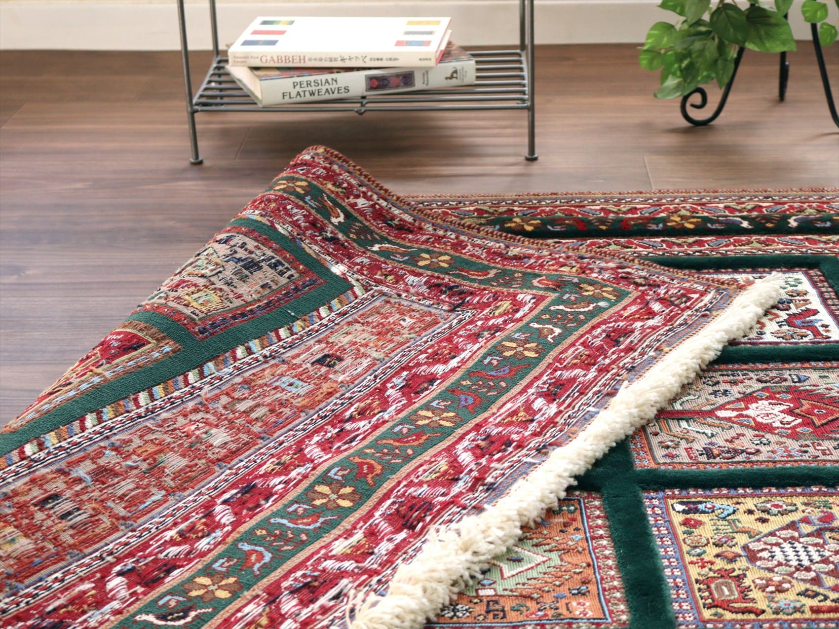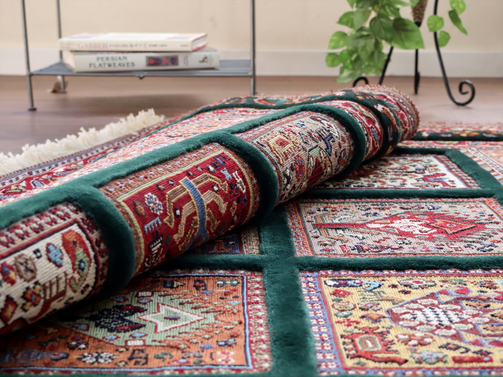 | ベース部分が手の込んだスマックになっていて、しっかりとしたハリがあるキリムです。グリーンの部分は、パイル(毛足)のある織りで、立体感があります。 |