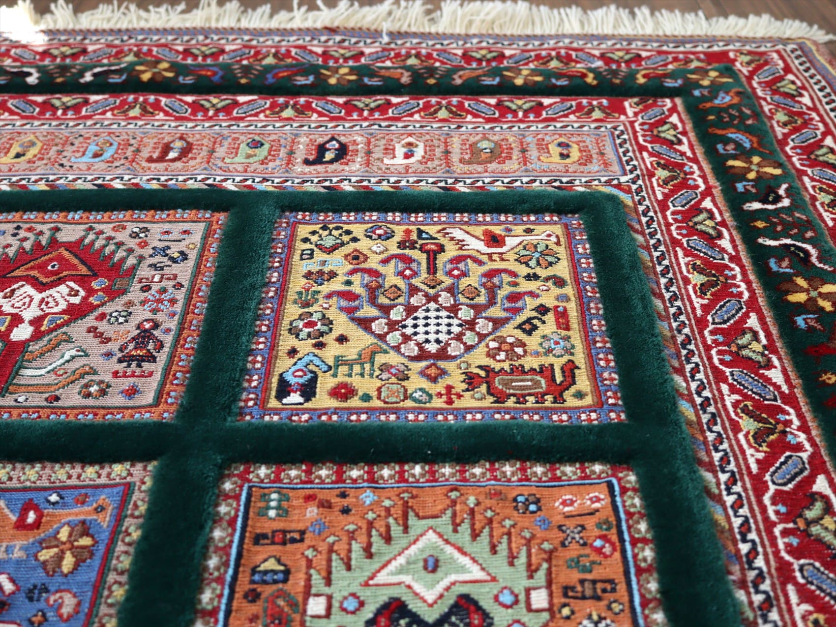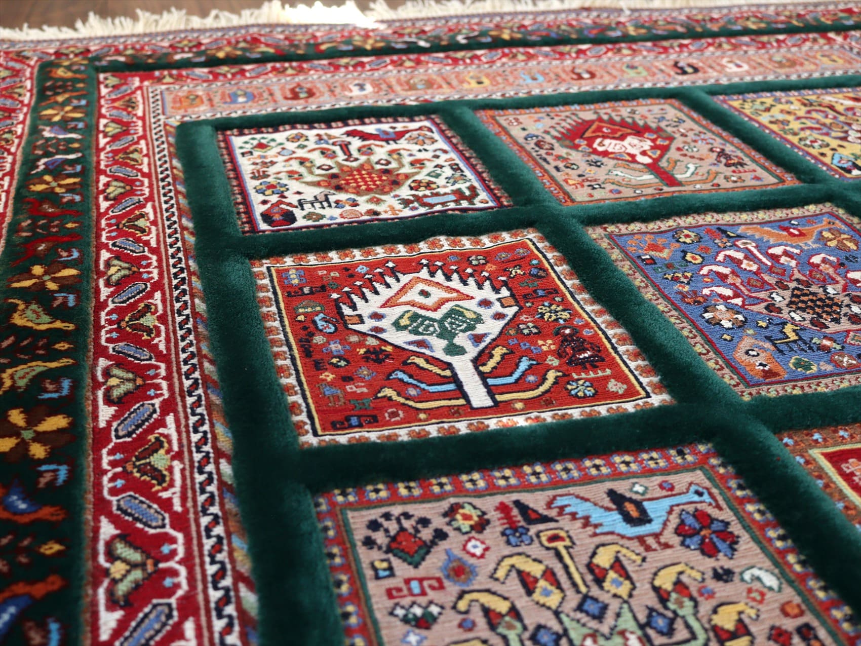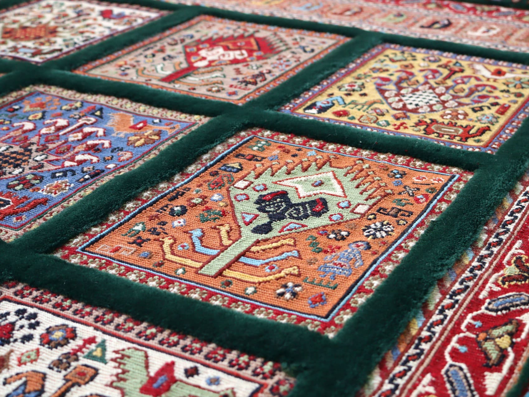 | タイルの中にはひとつひとつ異なった幾何学モチーフが、色を変えながら細かく丁寧に織り込まれていて見事です。額縁の絨毯部分にも、鳥の向かい合う様子が連なるように織られていてこだわりの詰まった1枚。 刺繍のような織り地のスマックをベースに、立体感のあるカーペット織りでモチーフをレリーフのように織り込んだ、職人技とも言える緻密な織りをご堪能ください。 |