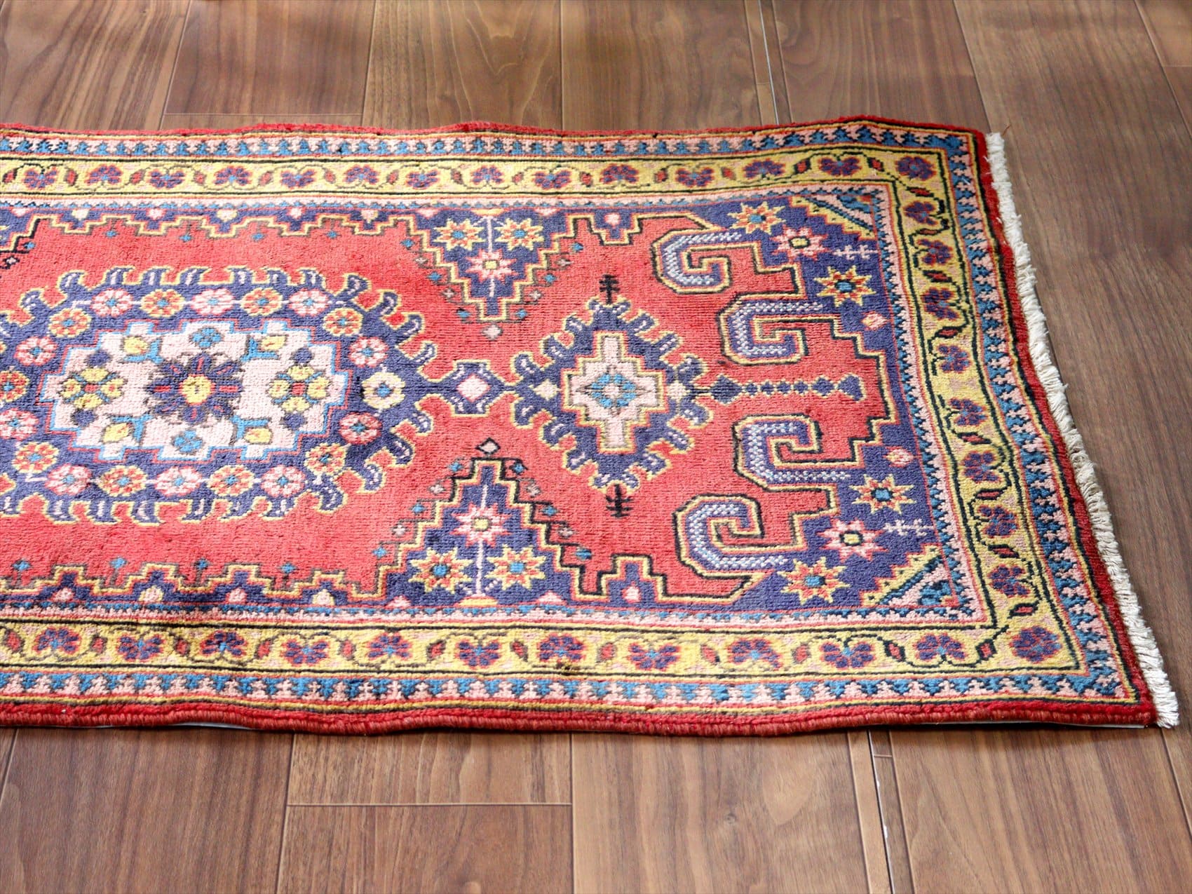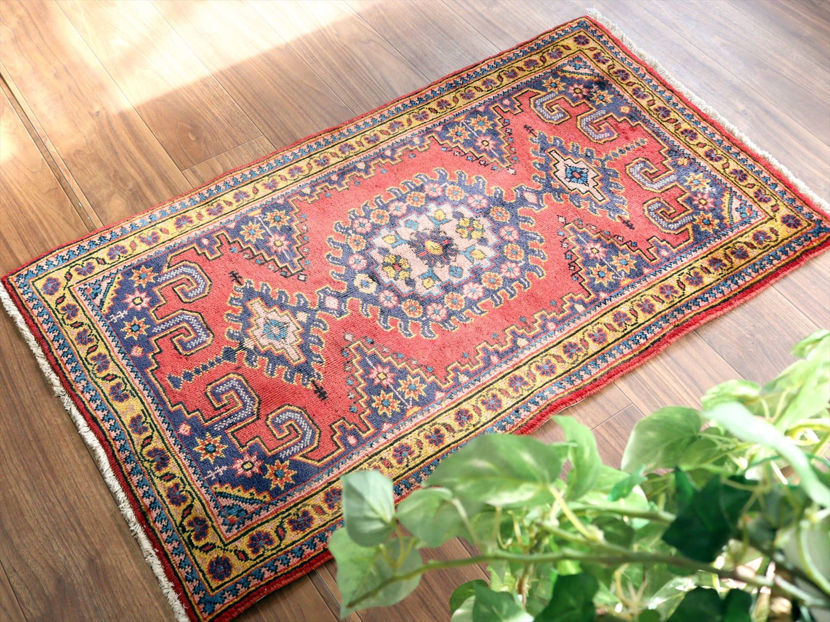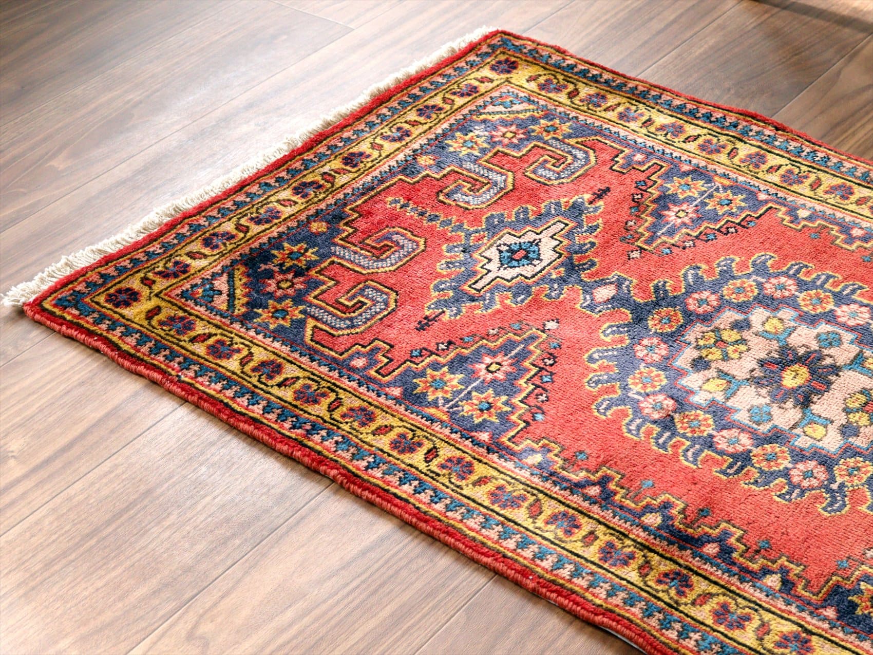 | イランの首都テヘランから西へ300kmほど離れたハマダン地方で織られたカーペットです。曲線で描かれた花模様の華やかなペルシャじゅうたんと異なり、直線的な幾何学モチーフで構成されています。レッド、ネイビー、イエローと使われている色そのものは、鮮やかではありますが、どの色も淡い色合いで表現されていて落ち着きのある1枚に。 |