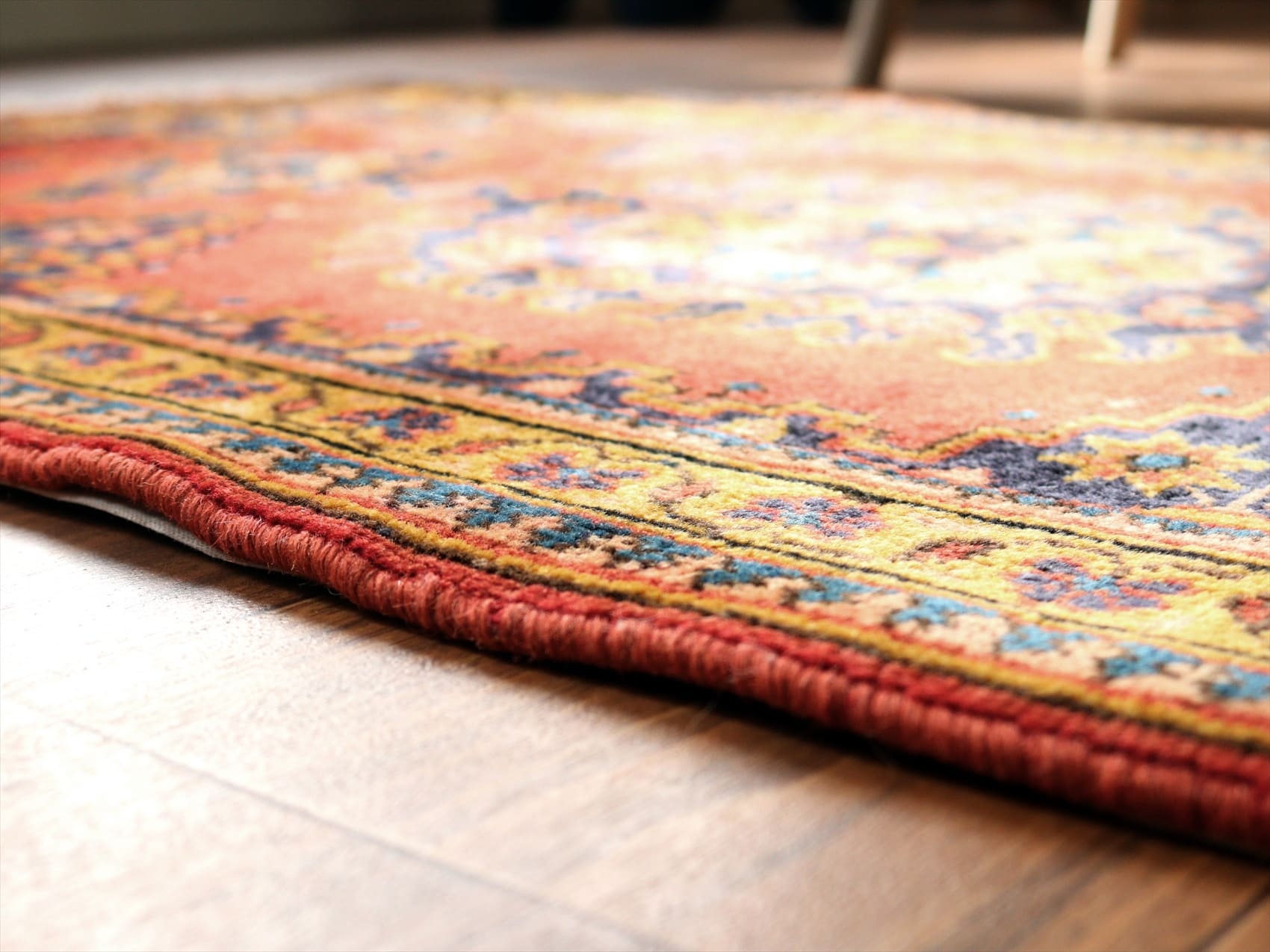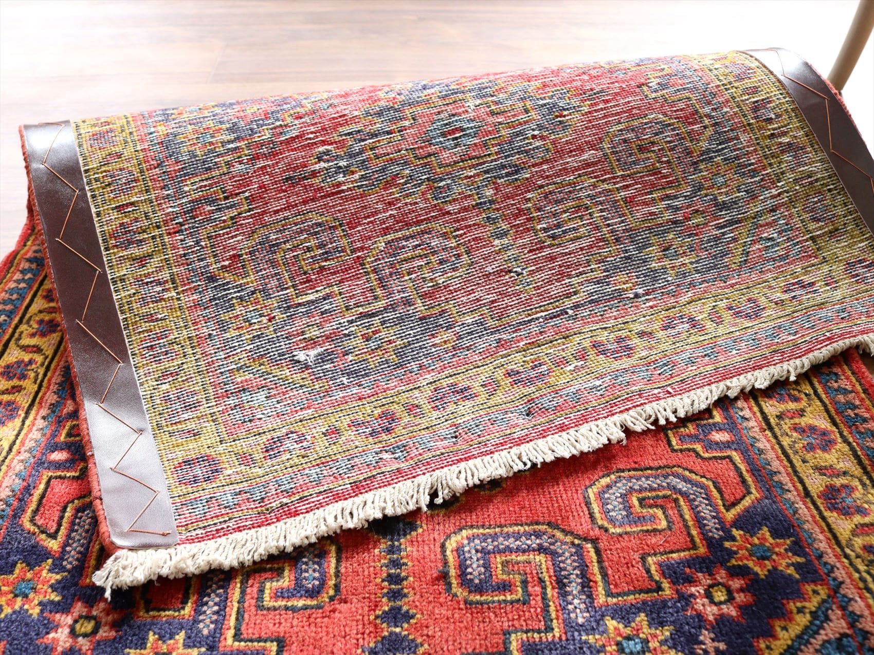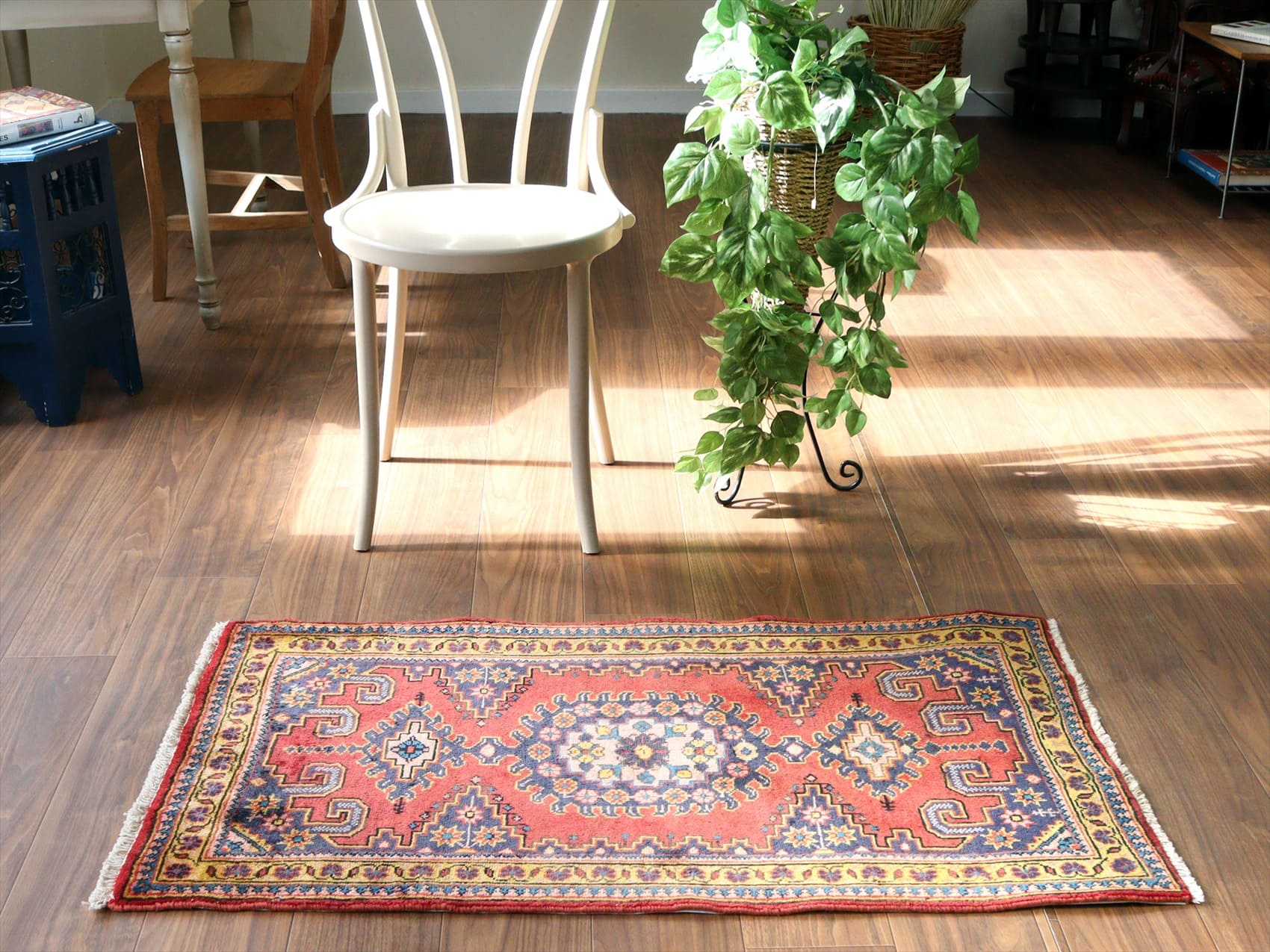 | イランの首都テヘランから西へ300kmほど離れたハマダン地方で織られたカーペットです。曲線で描かれた花模様の華やかなペルシャじゅうたんと異なり、直線的な幾何学モチーフで構成されています。レッド、ネイビー、イエローと使われている色そのものは、鮮やかではありますが、どの色も淡い色合いで表現されていて落ち着きのある1枚に。 |