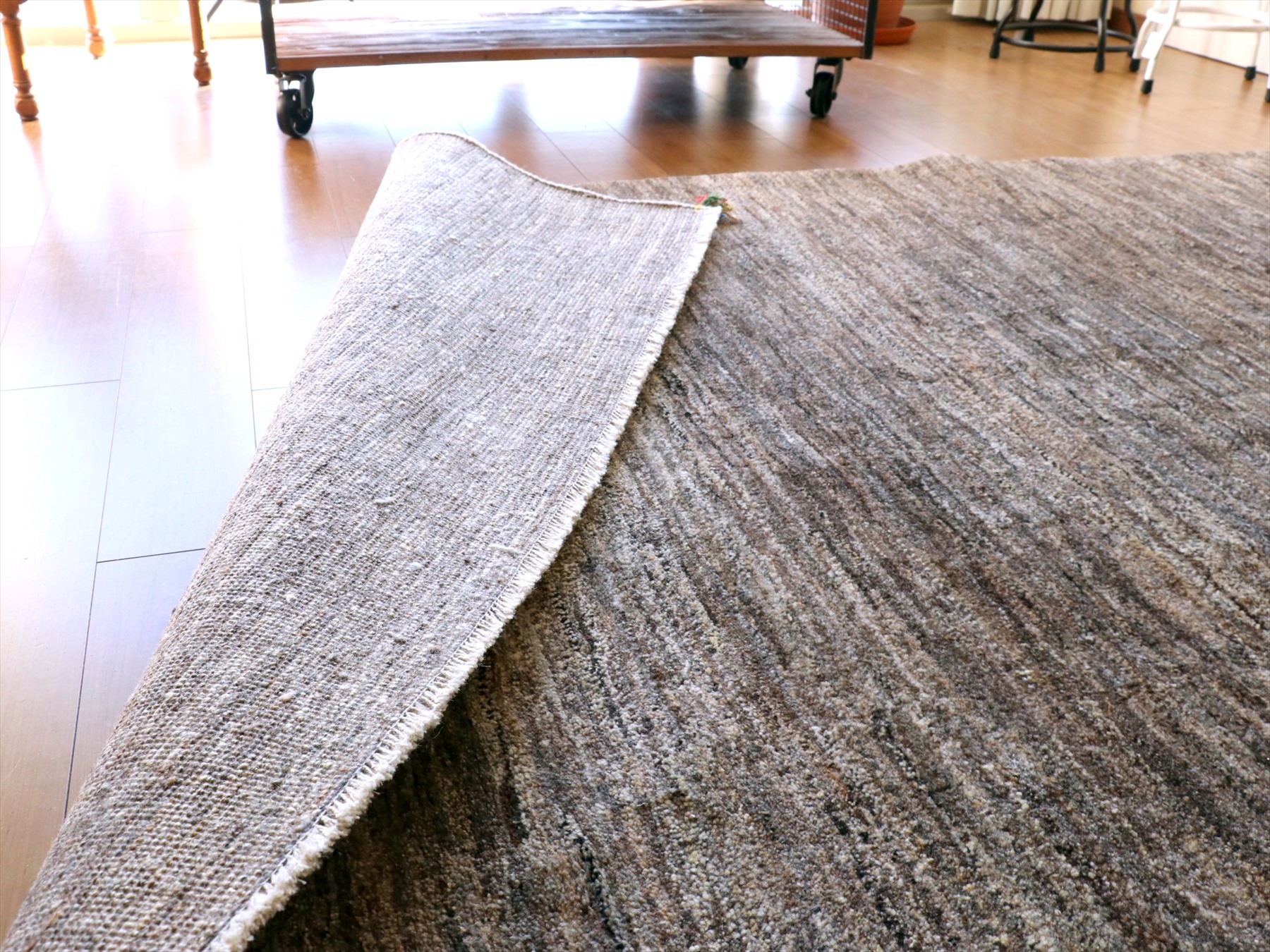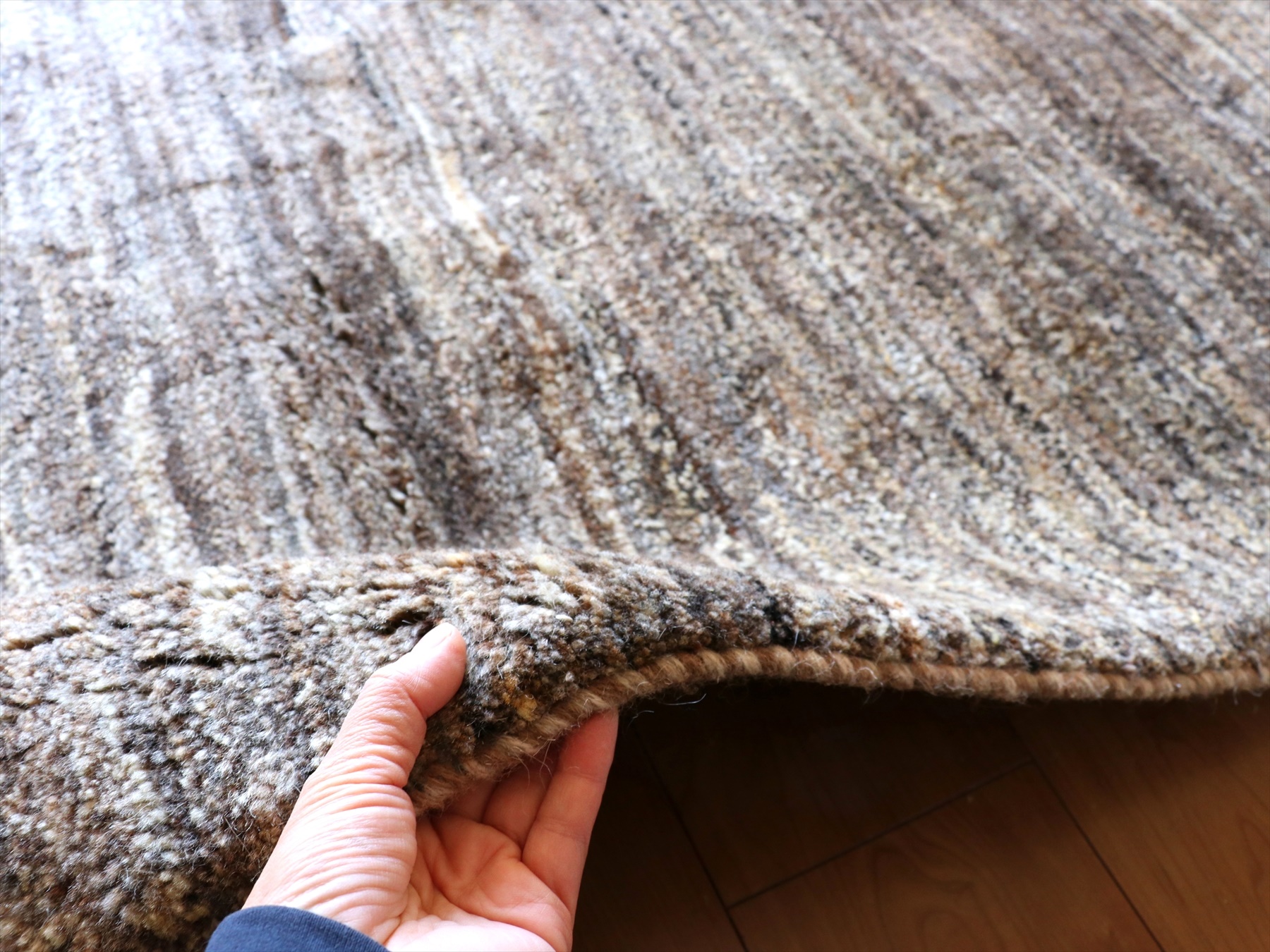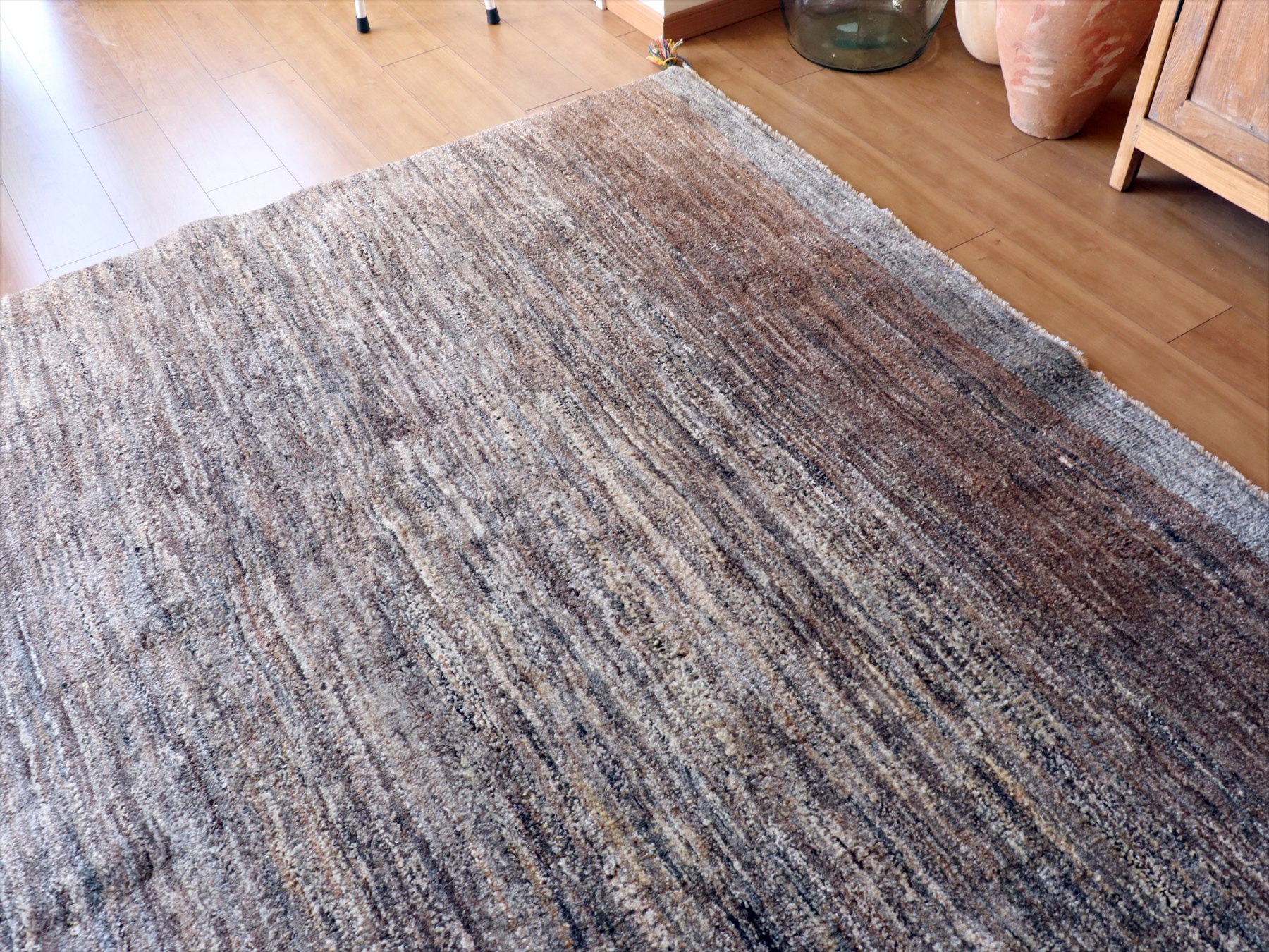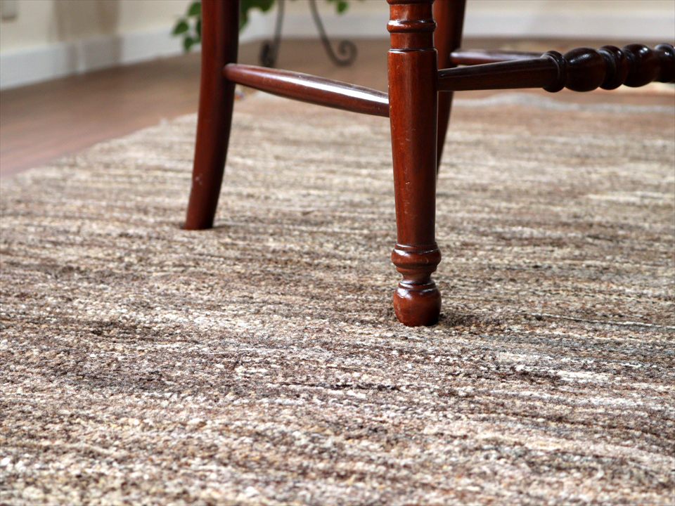 | モチーフのないシンプルでモダンな雰囲気で、羊毛の色合いが温かみある一枚です。ところどころ、同じく羊毛のグレーやアイボリーの毛が混ざっています。上部には、グレー、明るいブラウンが入り、アクセントになっています。 |