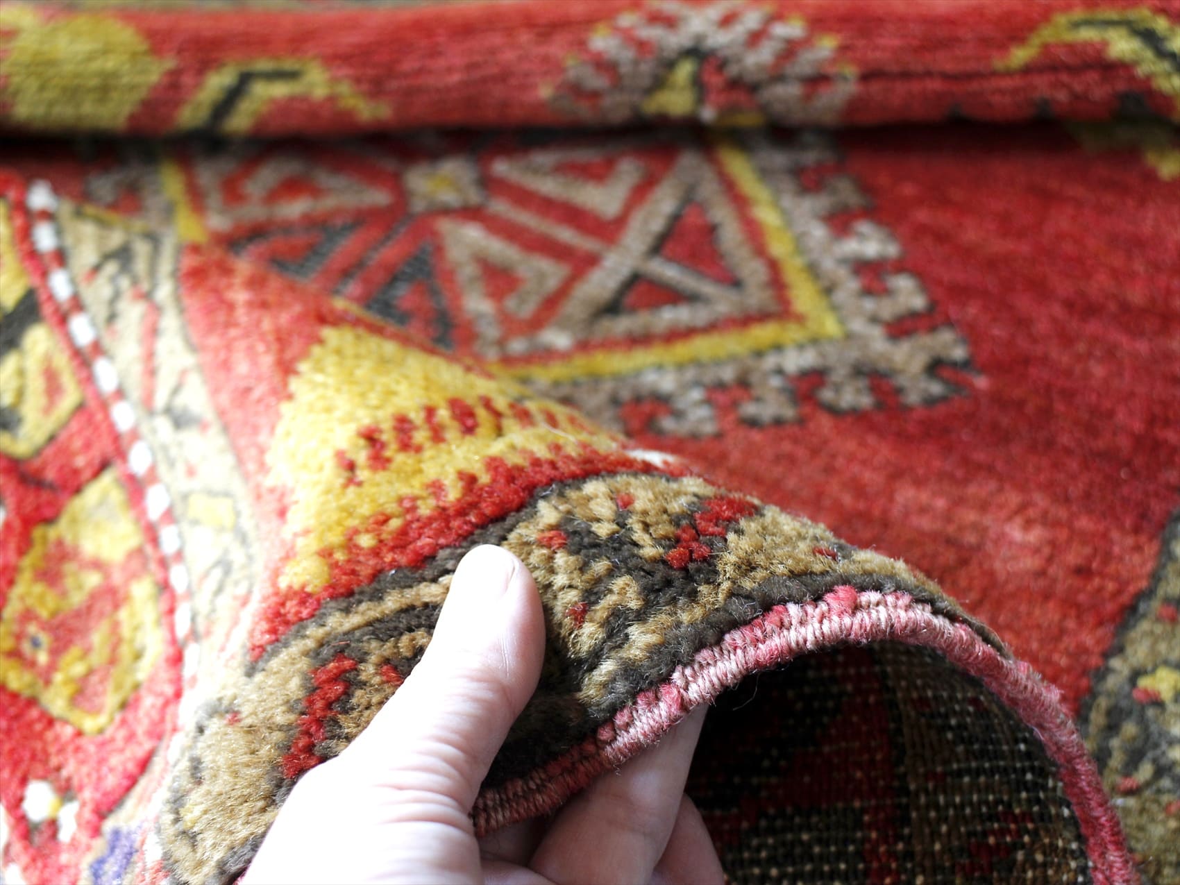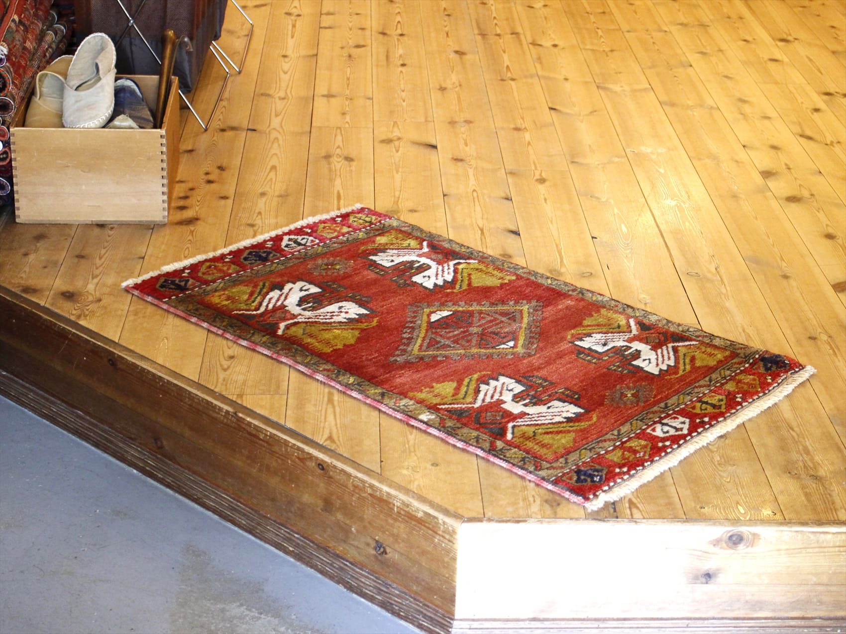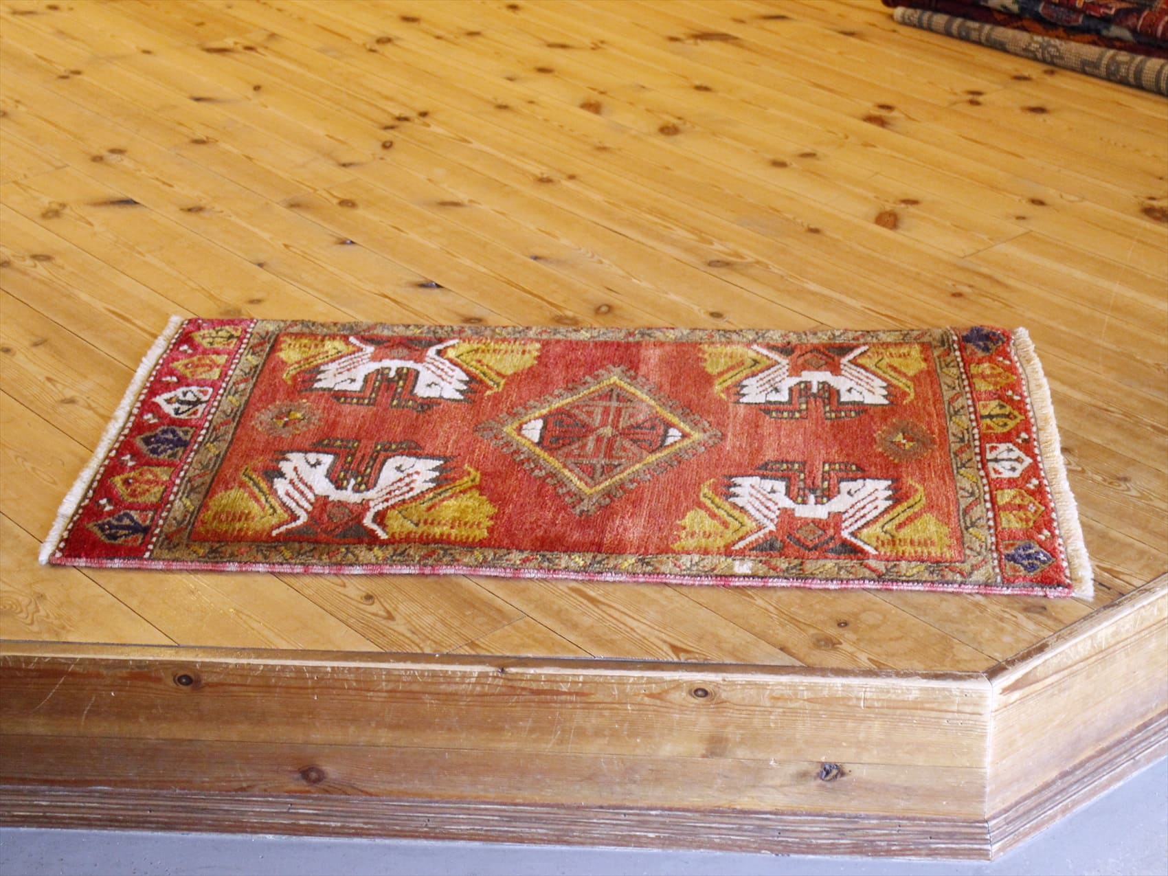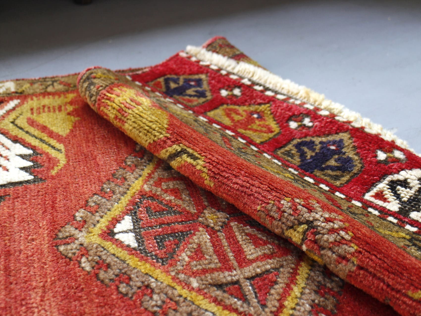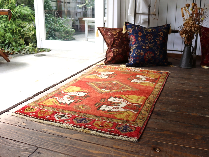 | パイルは整って、目が詰まっています。あまり日焼けせずきれいな色が残っています。 【ヤストゥク】アナトリア地方で、ヤストゥク(枕の意味)と呼ばれる細長いクッションとして使われていた袋状のじゅうたんのピースです。現状では裏面はとってしまって、一枚のカーペットになっています。お客様を迎えるサロンの窓際に、いくつものヤストゥクをクッションとして並べてくつろいでもらうための、おもてなしの気持ちの入ったカーペットです。小さいサイズながら、額縁のデザインにモチーフがバランスよく配置されているのも魅力です。 |