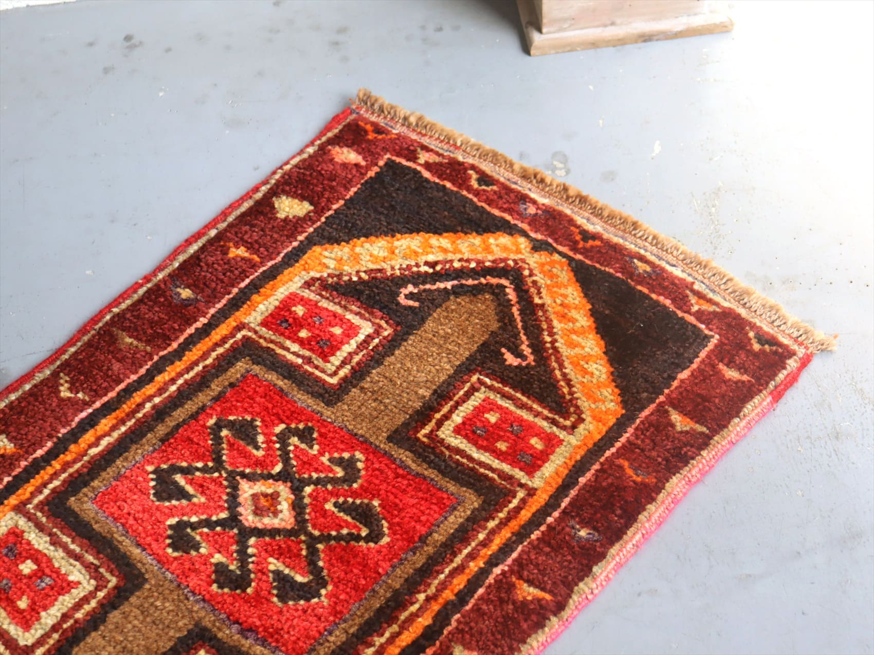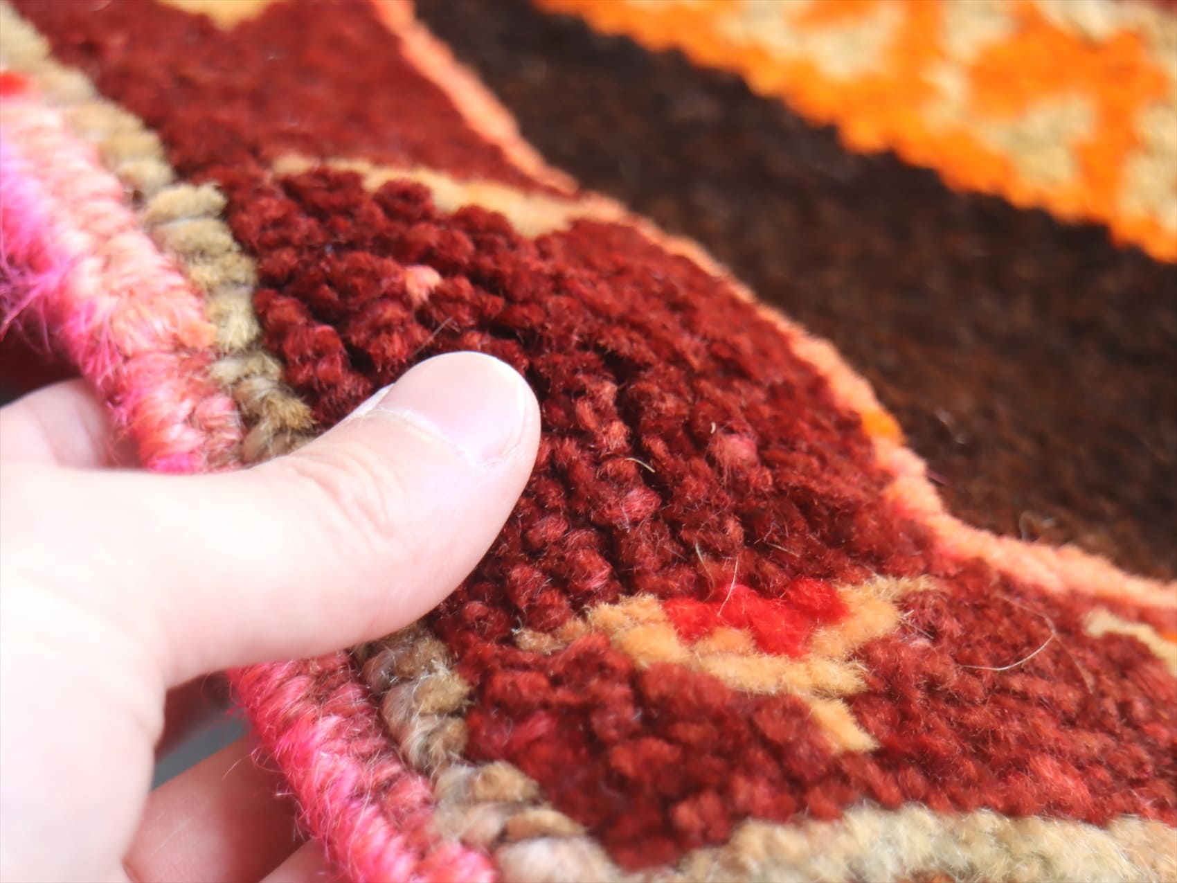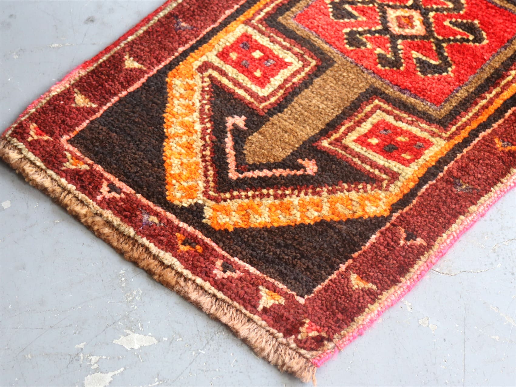 | 毛足はやや長めでふかふかした踏み心地。織りは(トルコ絨毯のなかでは)厚みがありやわらかくしなやか。大きなダメージはなく、きれいな状態です。 |
