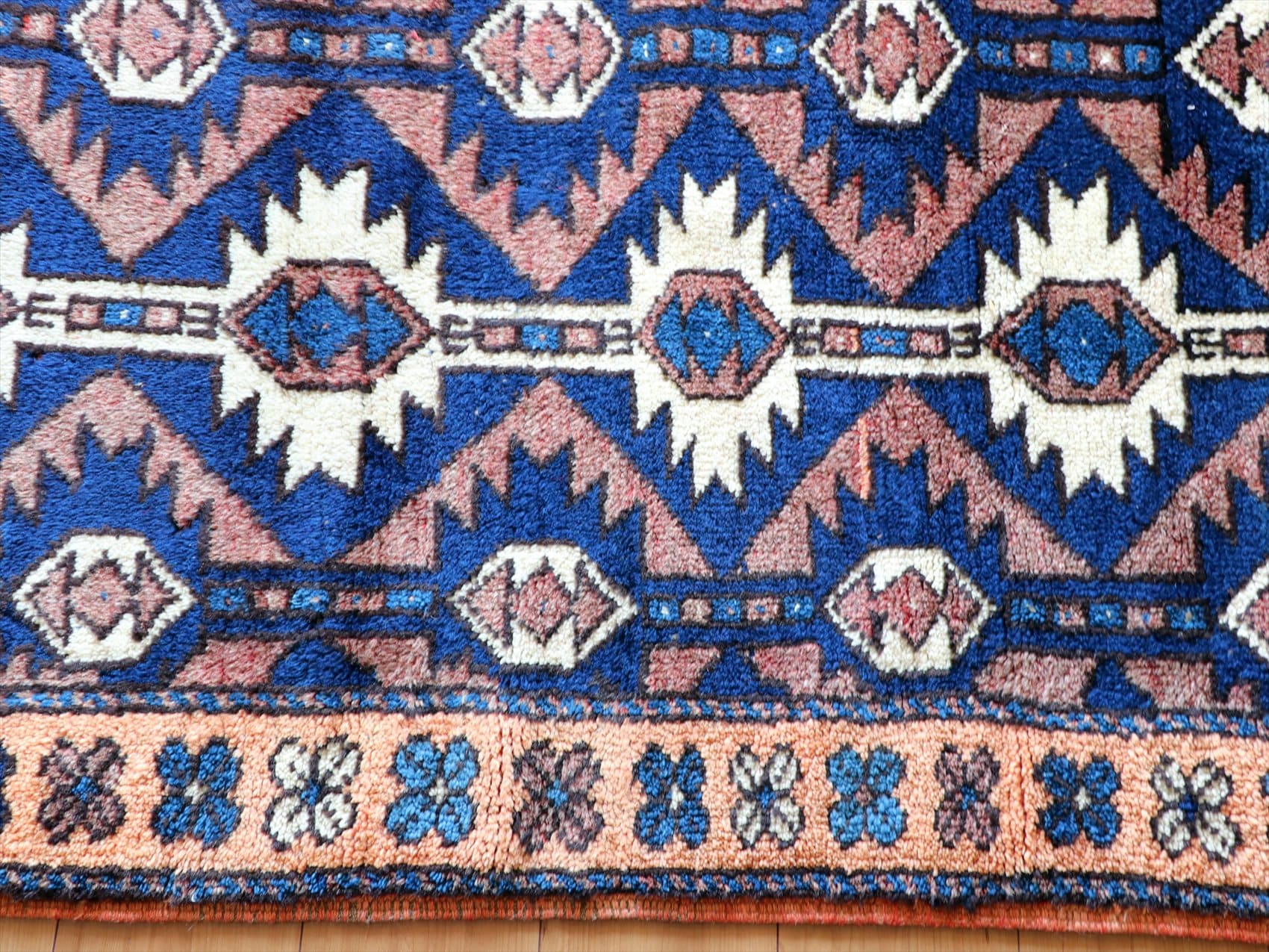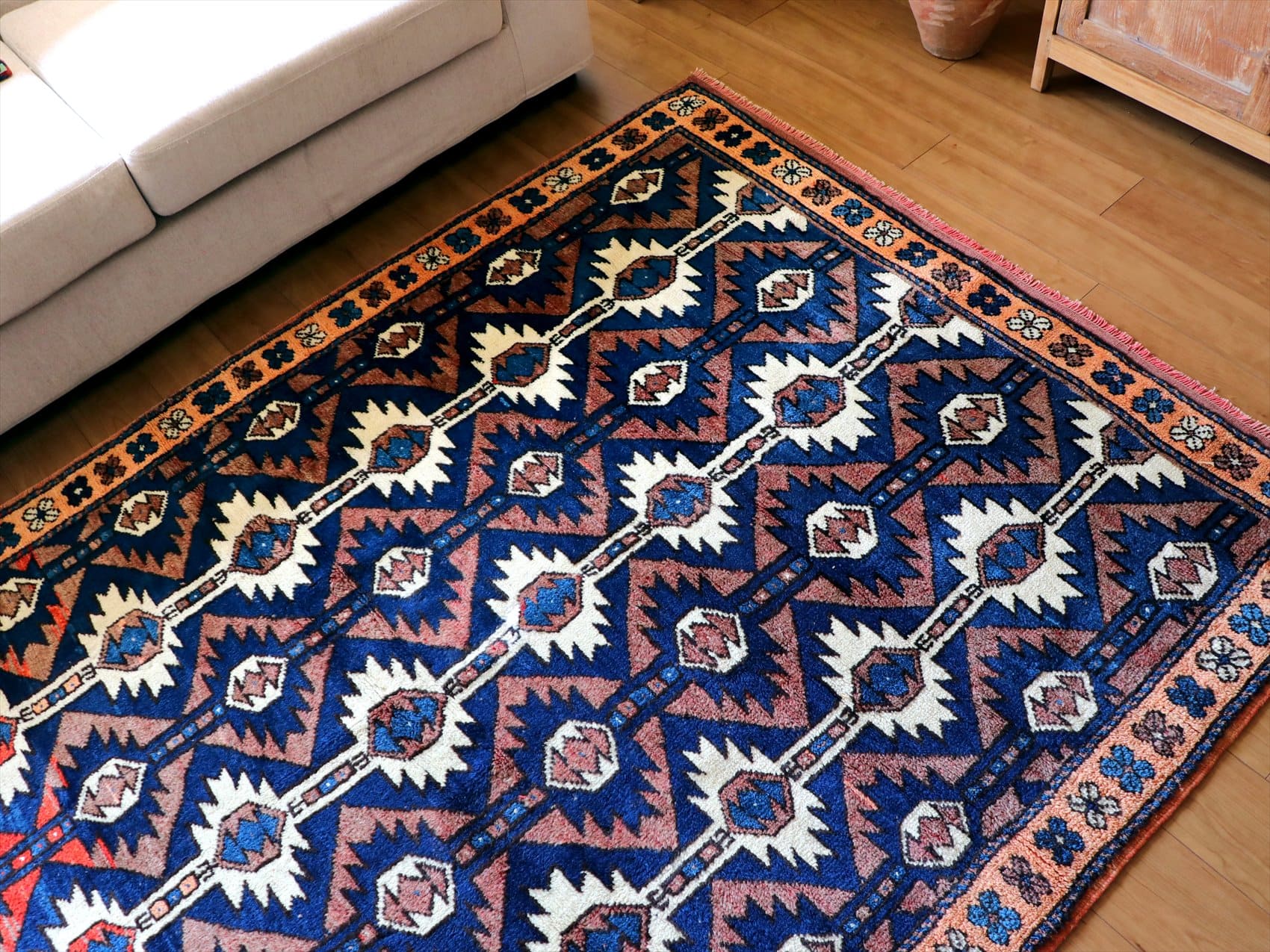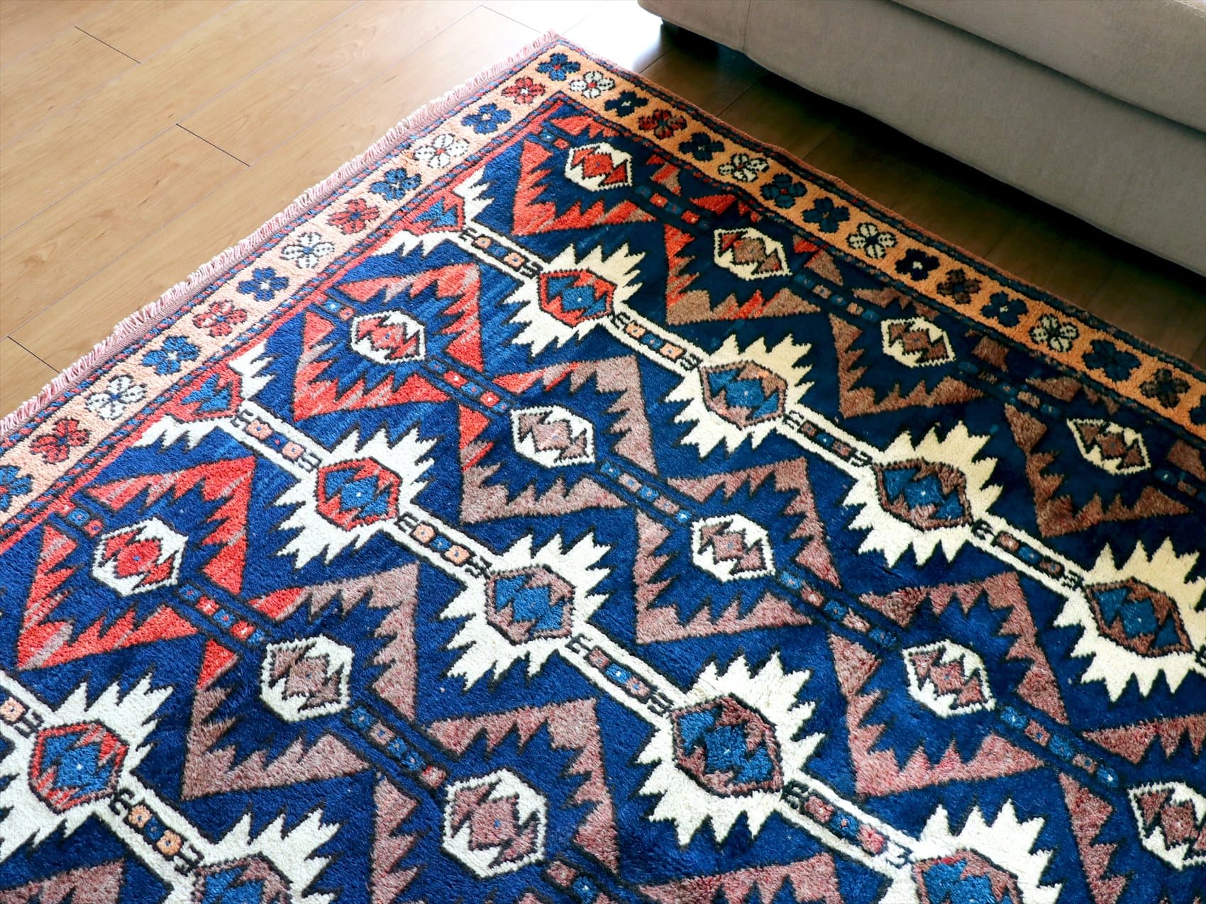 | 幾何学の連続模様がインパクト大!アールデコのタイル床を思わせるような、大胆なデザインです。(ちょっと和風にも見えるでしょうか。)赤と紺、アイボリーの伝統的な色使いで織られたバルケスィール地方のラグで、小目から見て下のほう4分の1ほどが、明るい赤に色変わりしているのがユニークです。 |