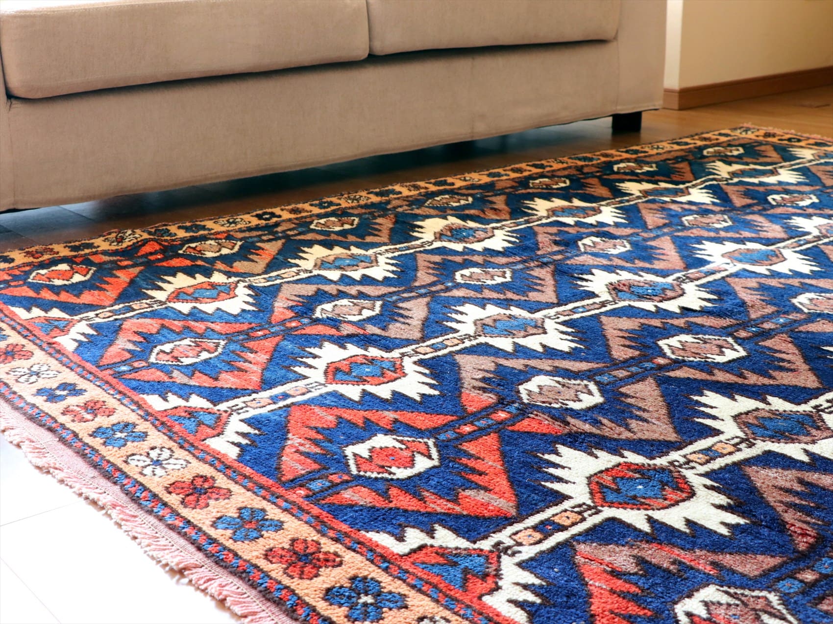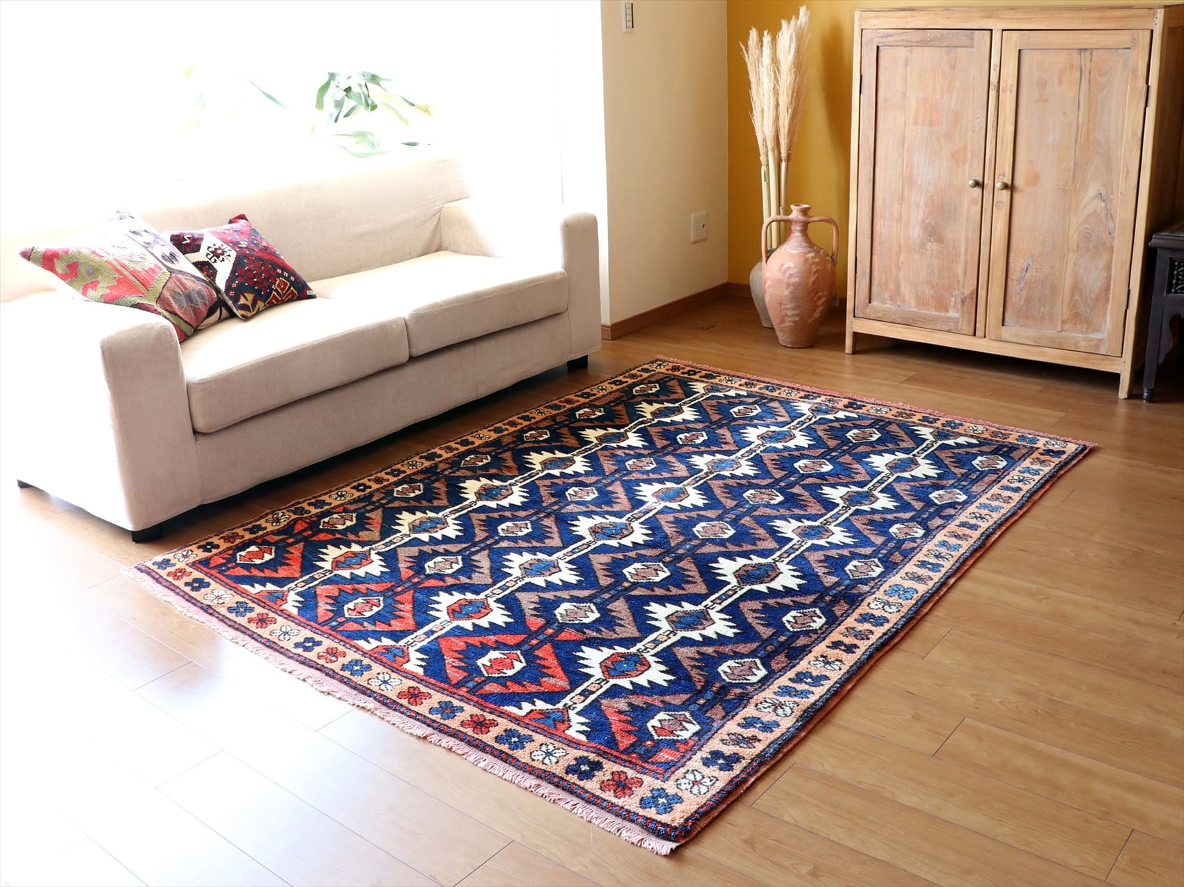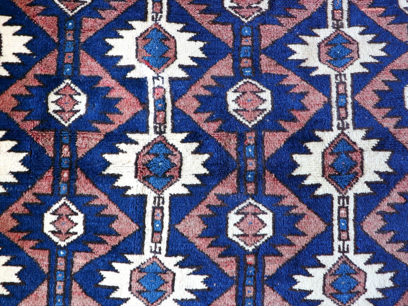 | 幾何学の連続模様がインパクト大!アールデコのタイル床を思わせるような、大胆なデザインです。(ちょっと和風にも見えるでしょうか。)赤と紺、アイボリーの伝統的な色使いで織られたバルケスィール地方のラグで、小目から見て下のほう4分の1ほどが、明るい赤に色変わりしているのがユニークです。 |