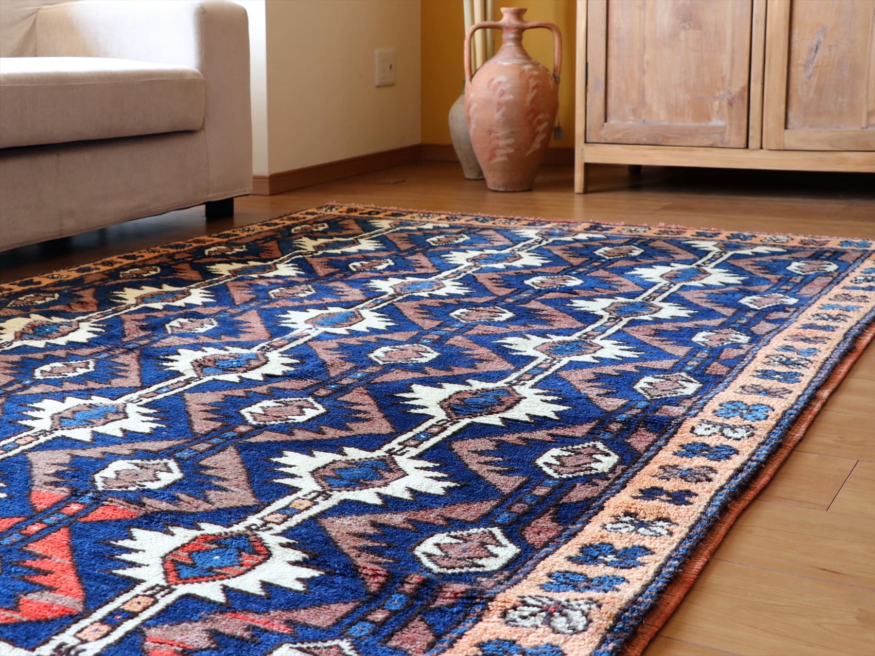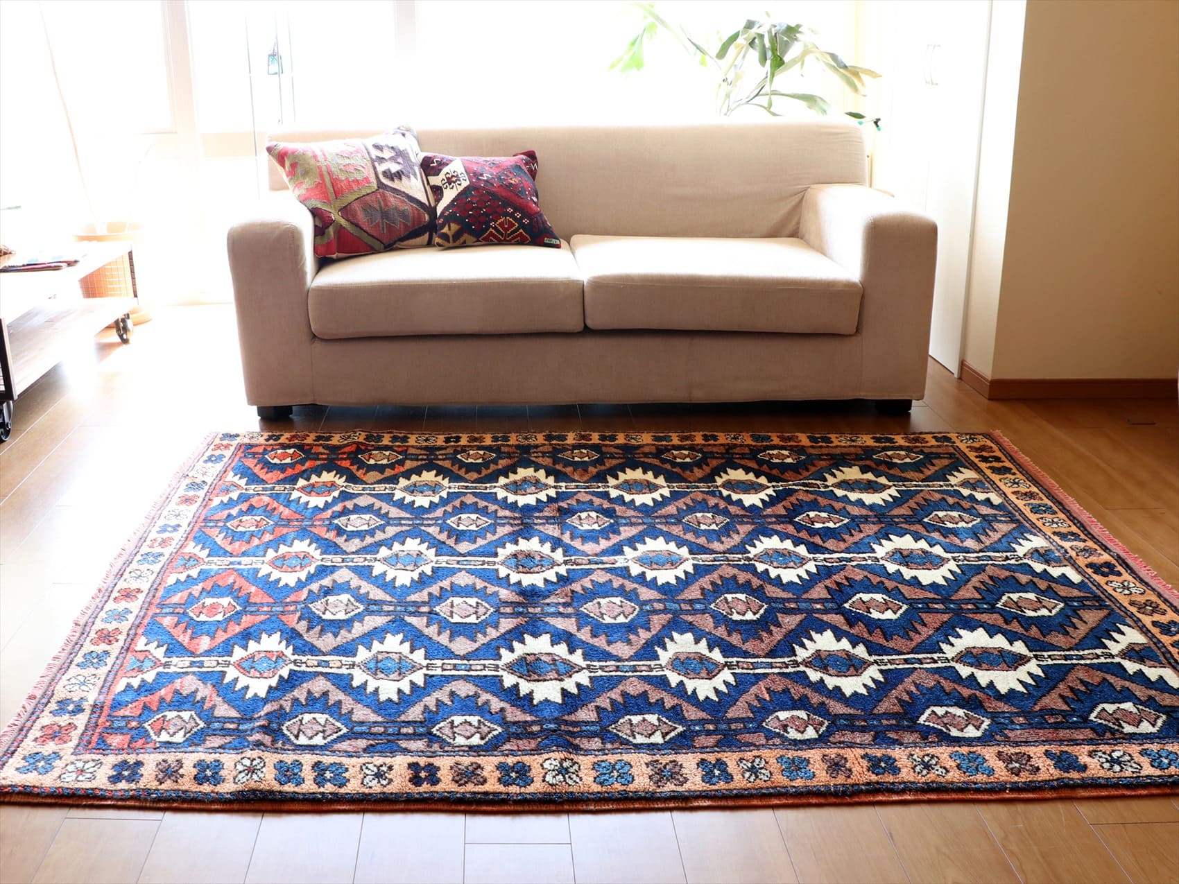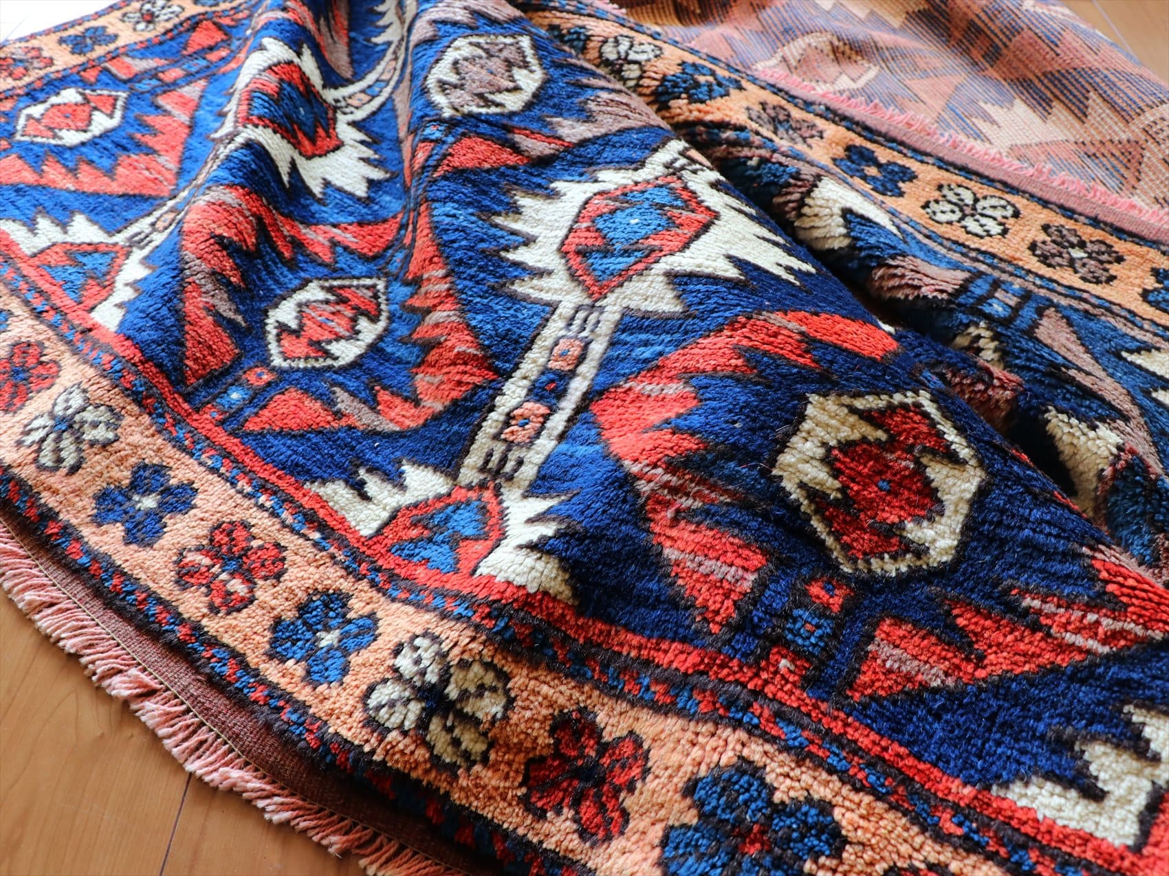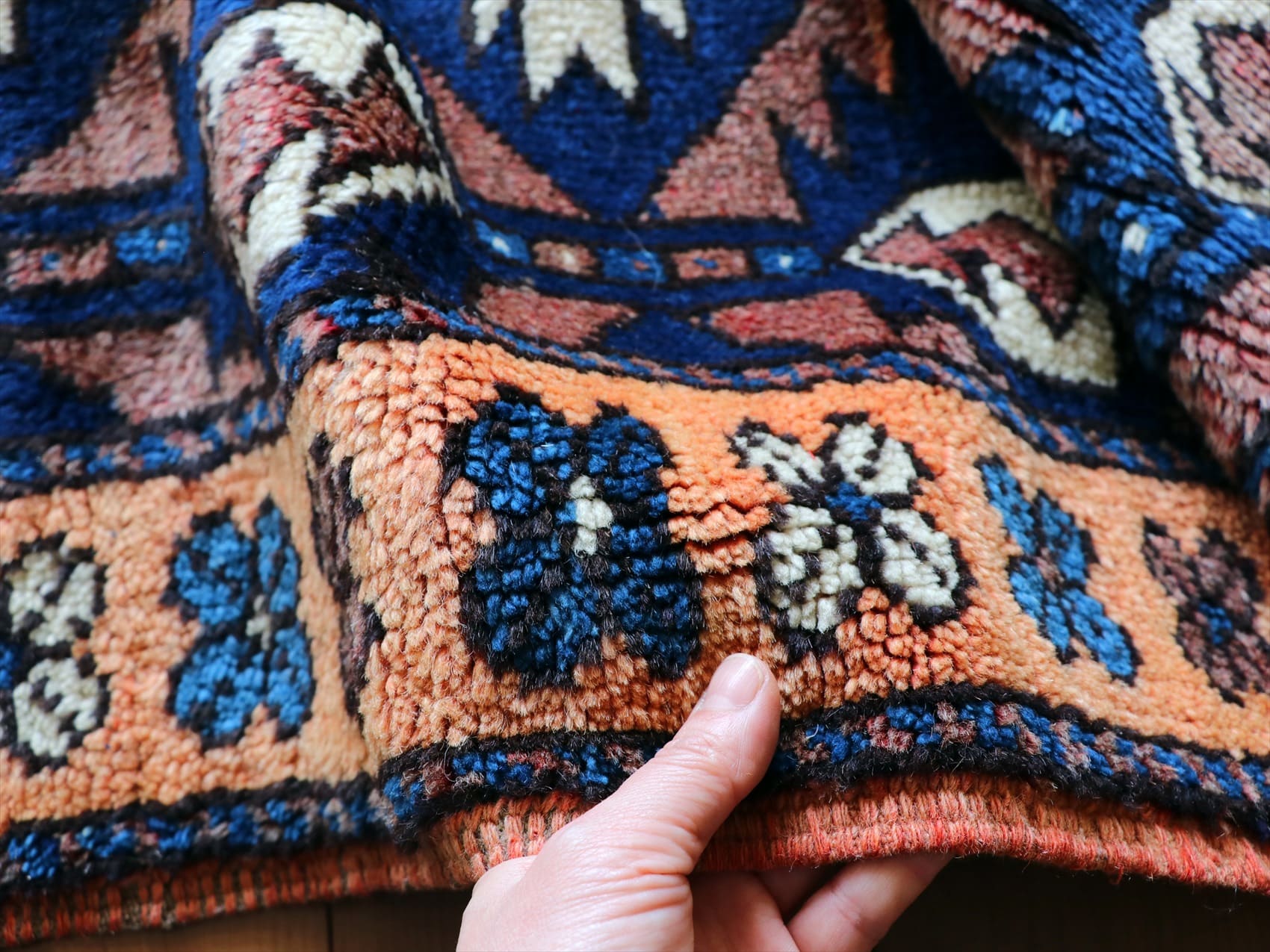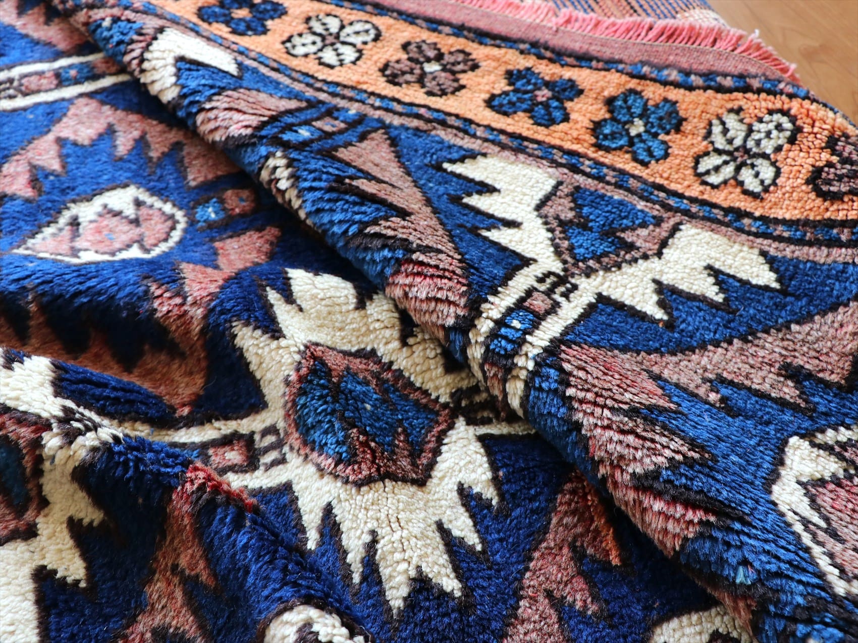 | ふっくらとしたパイルは、すり減ったところなどもなく、ほとんど使われずに保管されていたようです。パイル(毛足)を含めたラグ全体の厚みは1cm弱。表面はなめらかで、ツヤがあります。 |