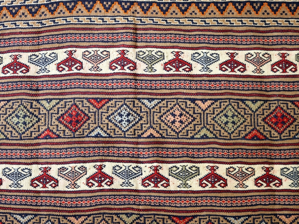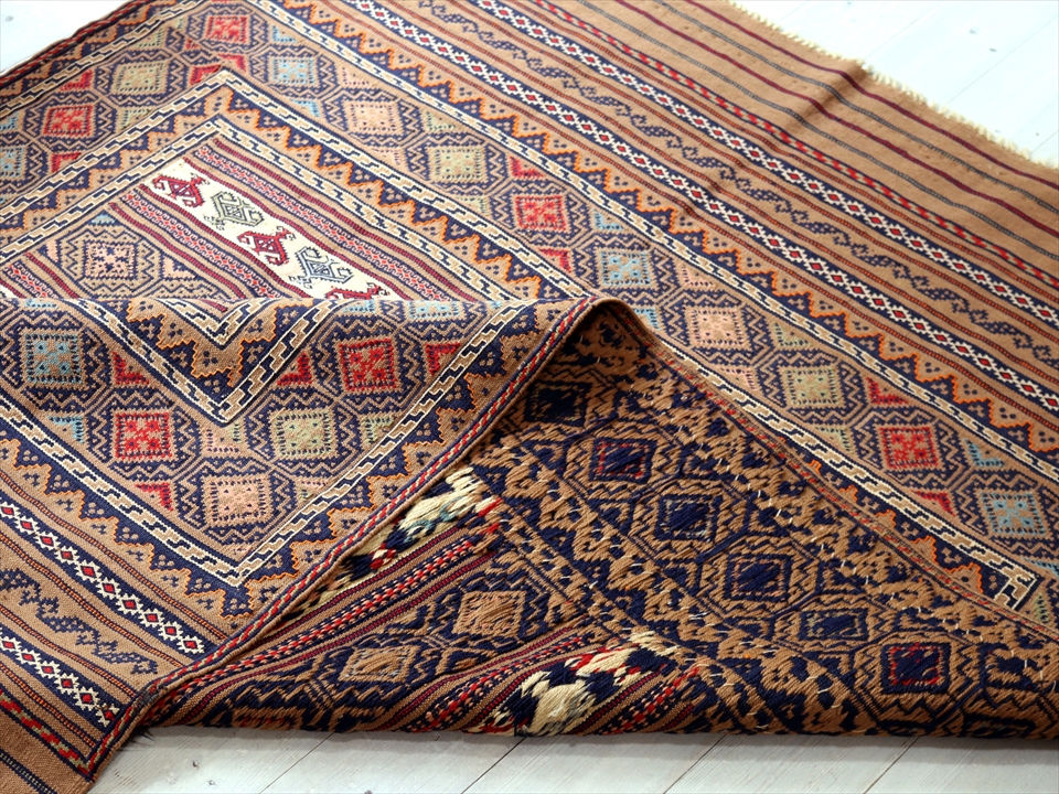 | 細かなスザンニ織りのキリム。表面にでていない糸を切らずに裏面に通して残しているので、スザンニ織りの部分は通常のキリムと比べると厚みがあります。 |
