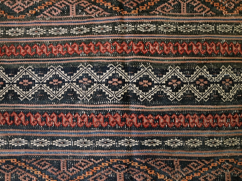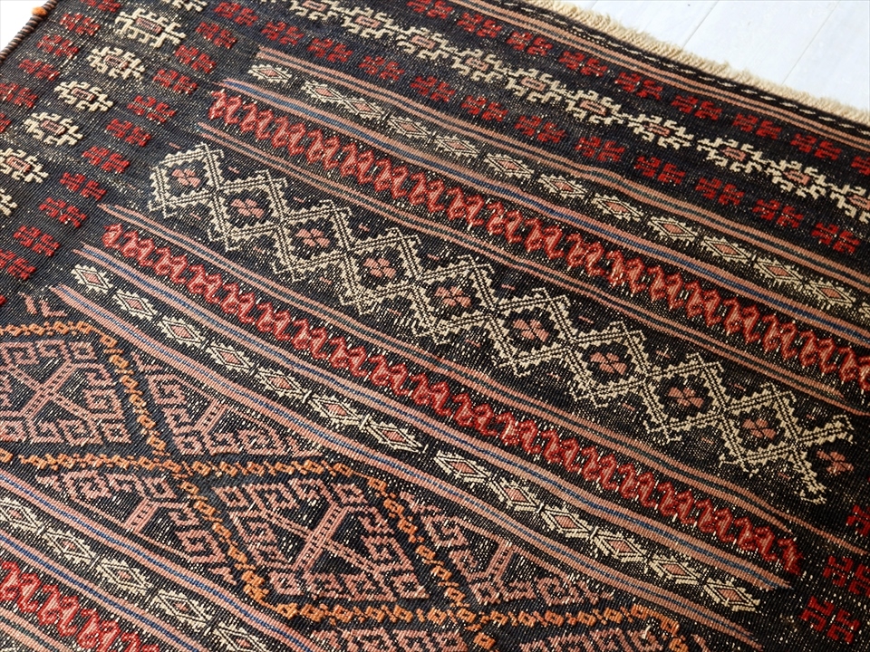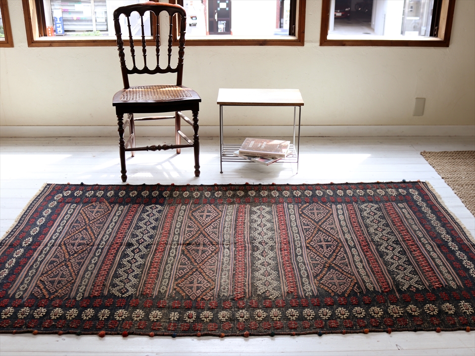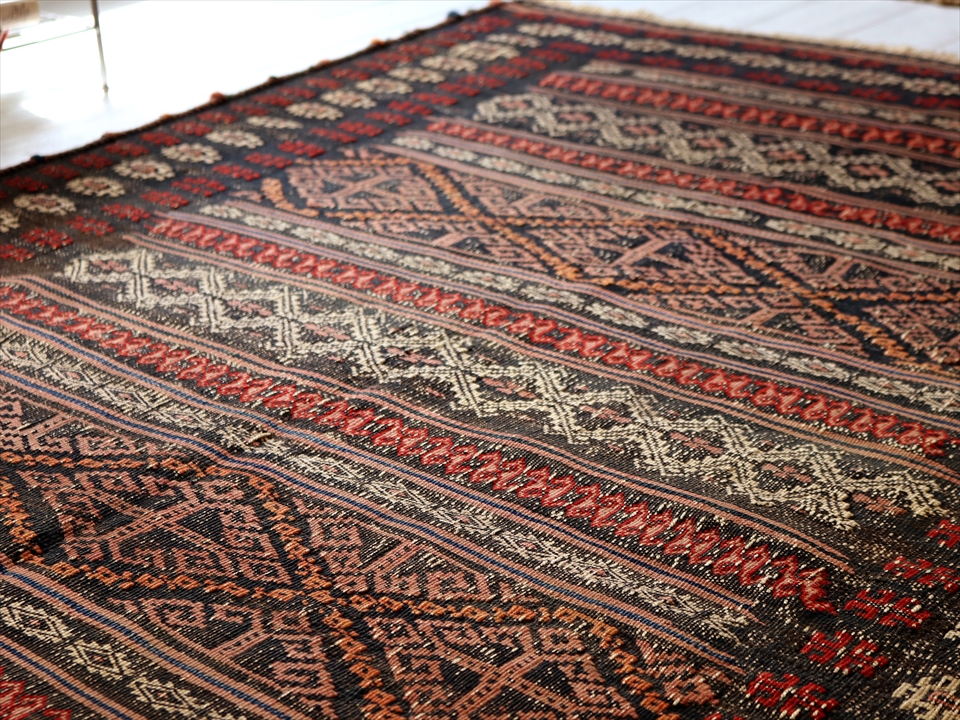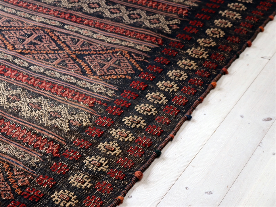 | 濃紺、赤、白色の渋い色合いのキリム。スザンニ織りという技法で織られています。表面にでていない糸を切らずに裏面に通して残しているので、一見平織りに見えますが、裏面を見ると横に色糸が通されていて、その分通常のキリムと比べると厚みがあります。 |
