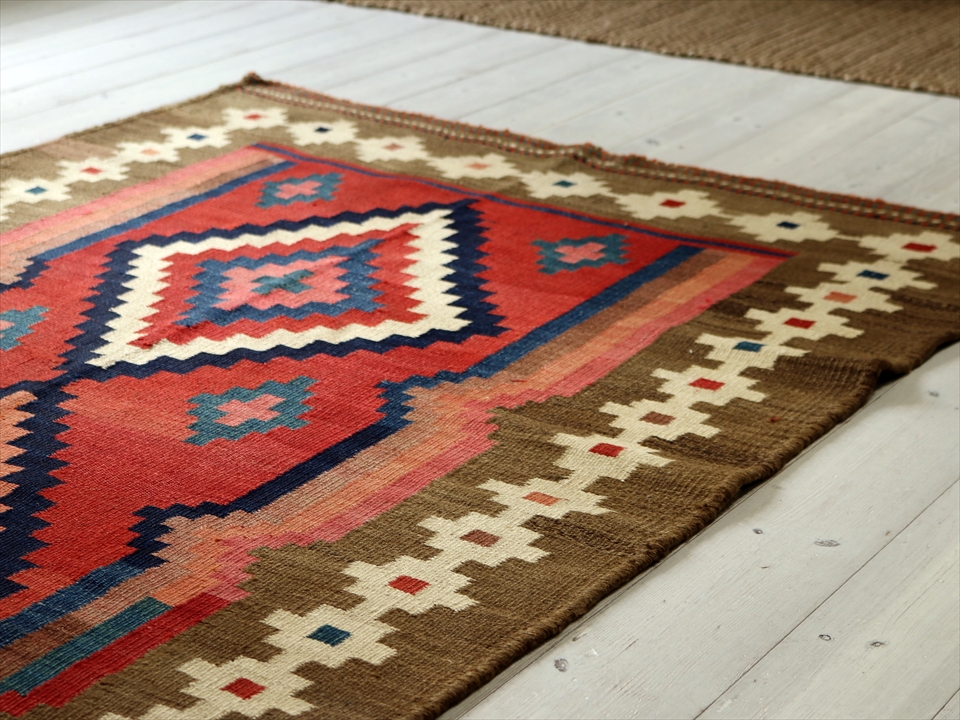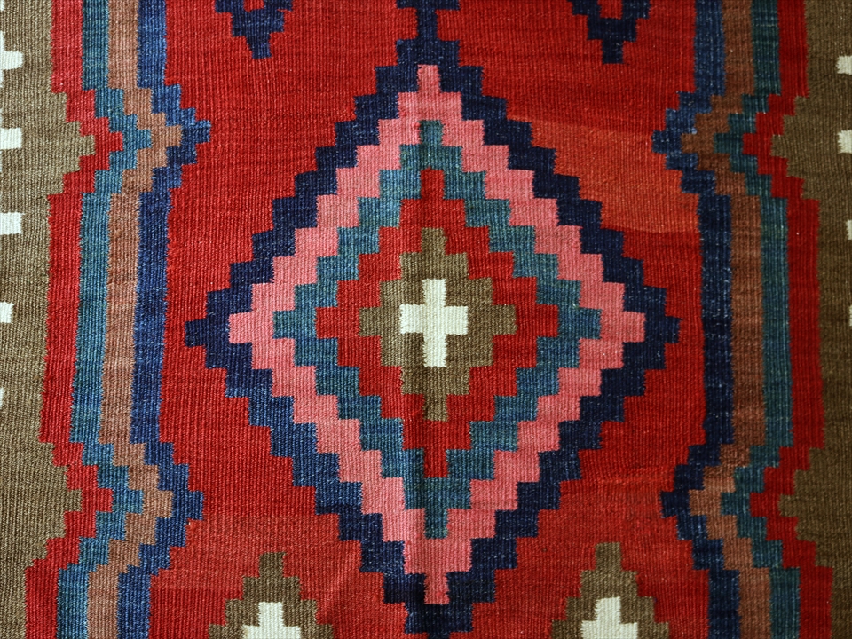 | モチーフがシンメトリーに配置された、イランのシラーズ地方で織られたキリム。ハムセ(Khamse)という遊牧民のデザインとされています。フィールドの赤色が途中で色が変わっているのはアブラッシュなのか、もともと同じ色だったものが経年変化で違いがでたのか定かではありませんけれども、遊び心があって素朴さを感じるキリムです。 草木染めの糸をつかって織られています。ボーダー(額縁)は染めてないナチュラルカラーです。 |