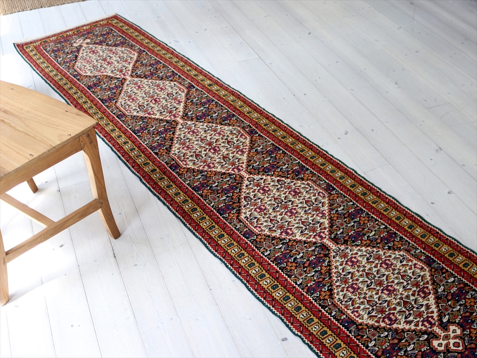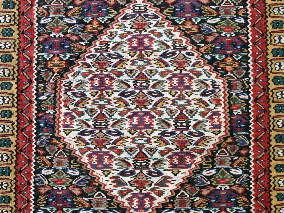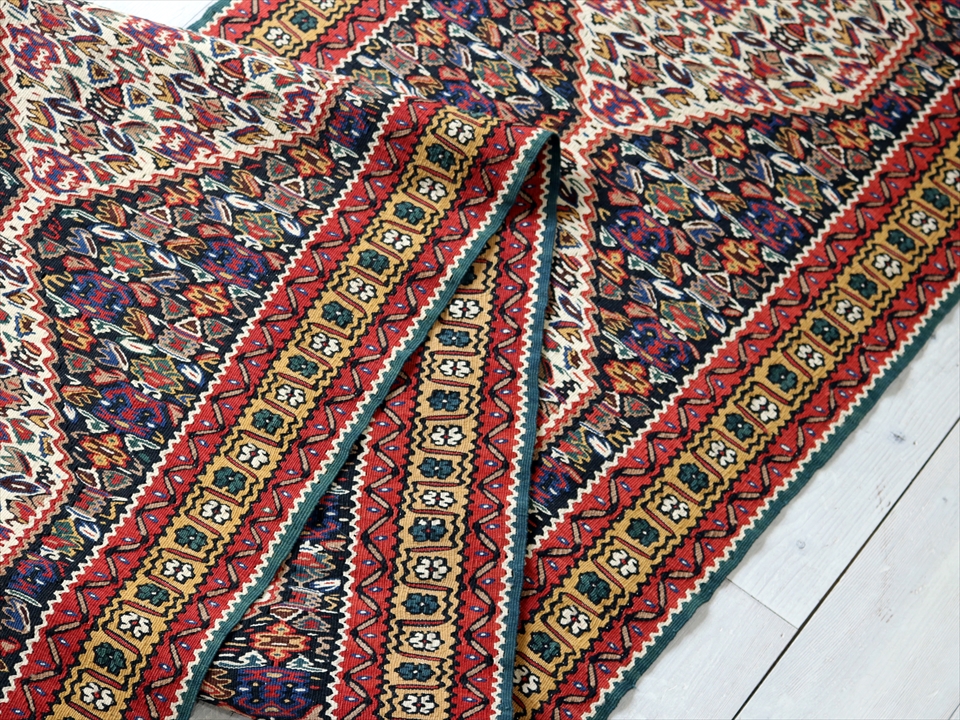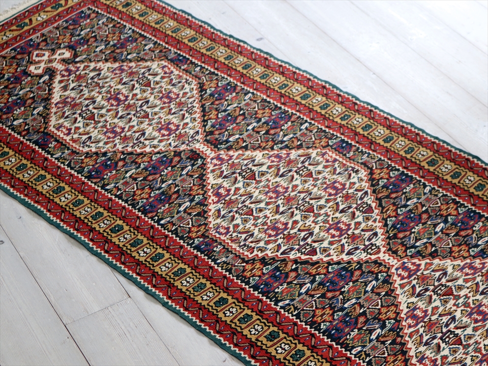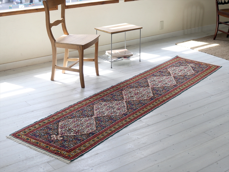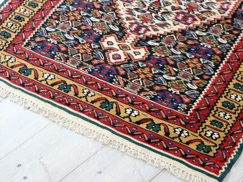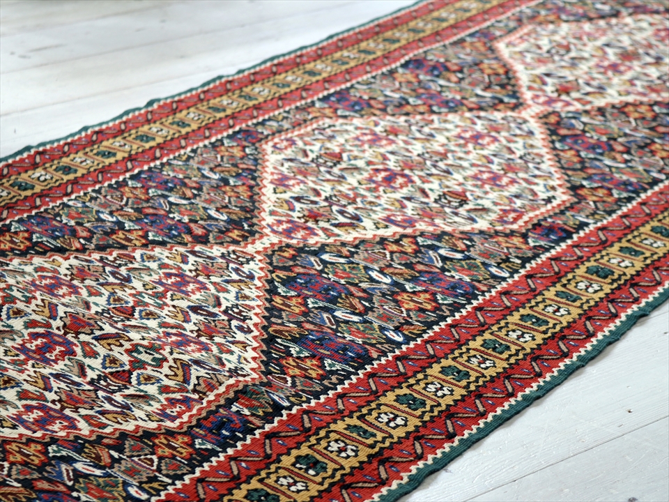 | イラン南西部、トルコとの国境に近いセネという町の特徴あるキリム。全面に隙間なく細かなモチーフが置かれているデザインはとても特徴的です。緻密で細かな織り、整ったモチーフ使いなど、交易品として織られたといわれる、セネ地方のキリムならではの特徴がよく出ています。 天然染料が使われており、はっきりとした美しい色あいです。 |