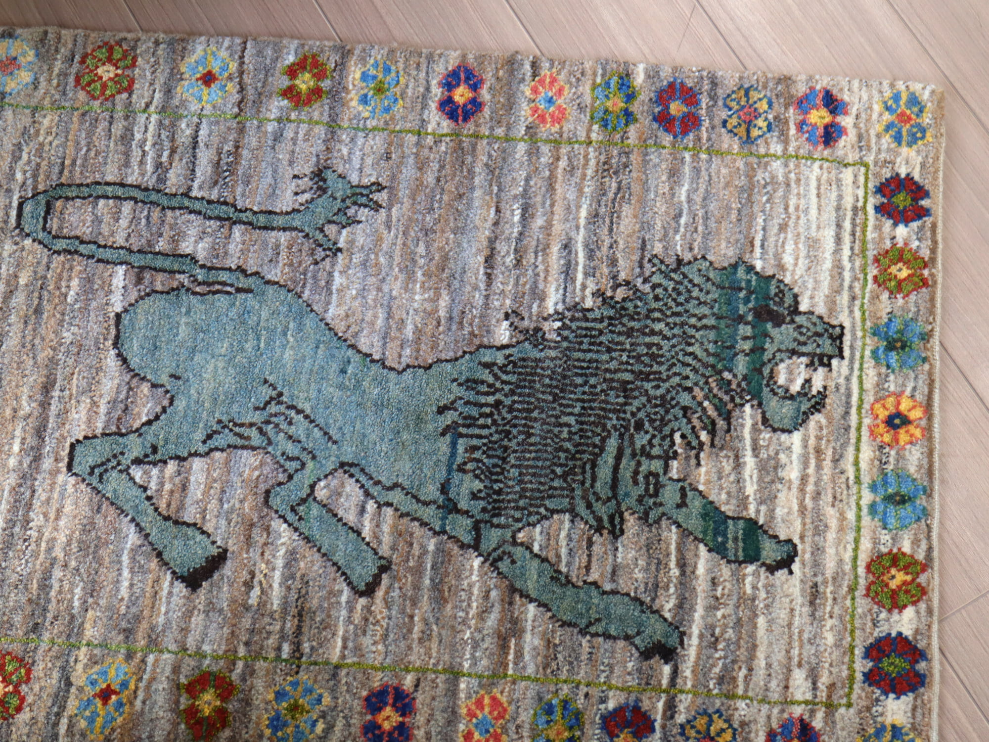 Key:Gabbeh, Lion rug, Tribal rug, ライオンギャッベ, ラグ, ギャッベ, ギャベ, 部族絨毯, トライバルラグ, コレクタブル, ウール製, イラン, ペルシャ, 手織り, じゅうたん, 絨毯, グレー, ブルーグリーン