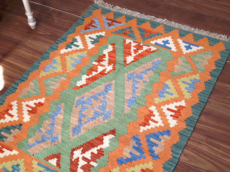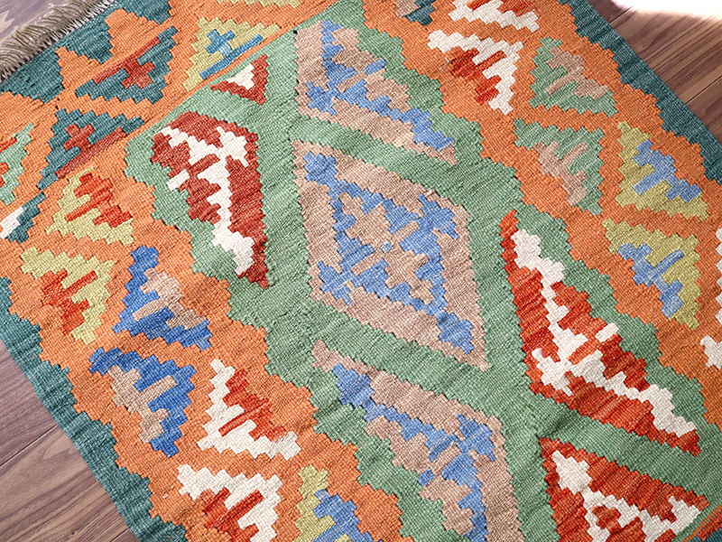 - イラン手織りキリム カシュカイキリム117×84cm グリーン&オレンジ