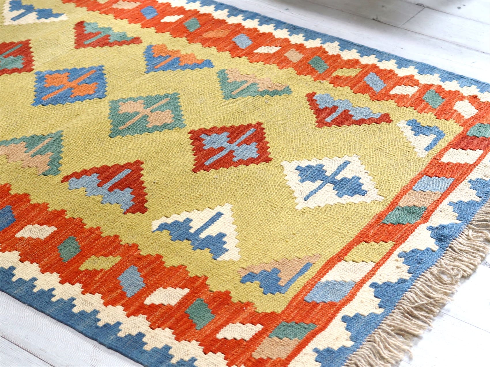 | ポップな明るい色使いの、手織りキリムです。イラン南部に暮らす遊牧民、カシュカイ族の伝統柄が織り込まれています。 |