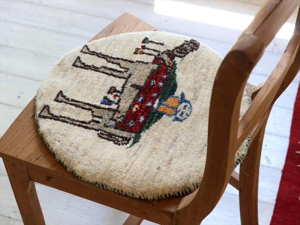 Key:Gabbeh, Shiraz, Carpet, Handmade, Hand weaven, Hand knotted, wool, Natural dye, Shiraz, Quashkai, ギャッベ, ギャベ, ラグ, まるい, 丸, 40cm, カシュカイ族, 細かい, 手織り絨毯, 草木染め, チェアパッド