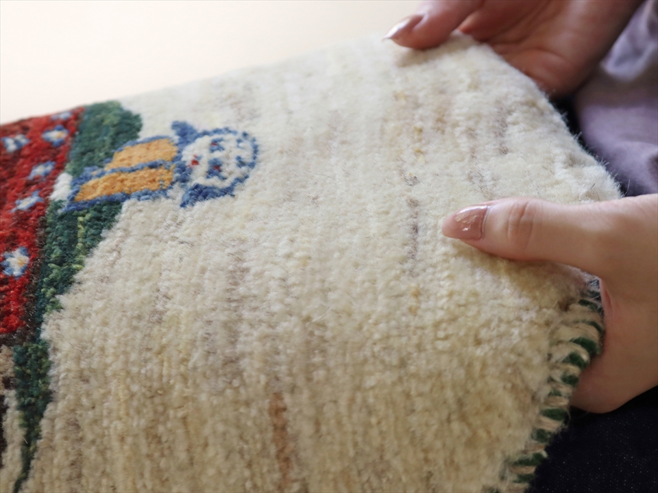 | 毛足は短く刈り込まれてすっきりとしています。 たくさんの時間をかけて、縦糸にひとつひとつ毛足を結びつけて織り上げていきます。ウールを紡ぐところから、全体を洗う作業、毛足の刈り込みや端の処理まで、全て手作業で行われています。 手織りの商品ですので、多少のゆがみ、大きさの違いなどございますことはご了承願います。 |