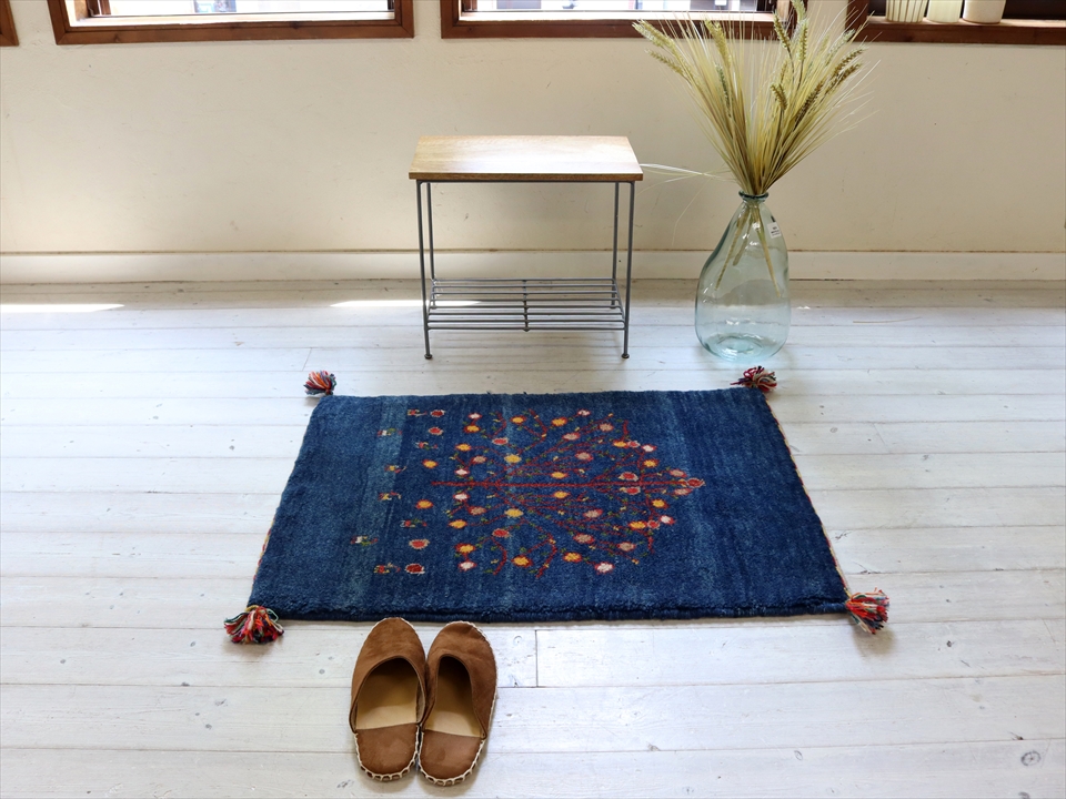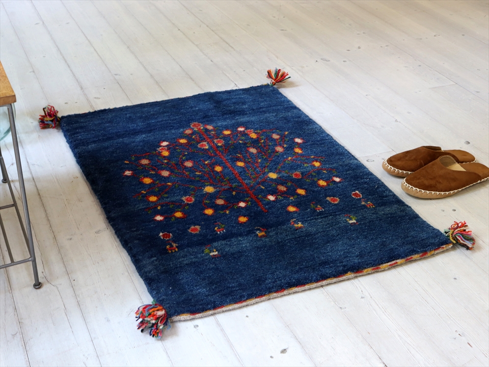 ギャッベ カシュカイ族の手織り90×65cm ネイビーブルー ザクロの樹