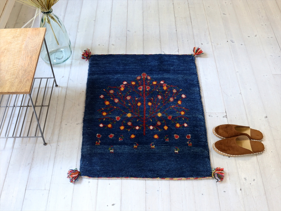 - ギャッベ カシュカイ族の手織り90×65cm ネイビーブルー ザクロの樹