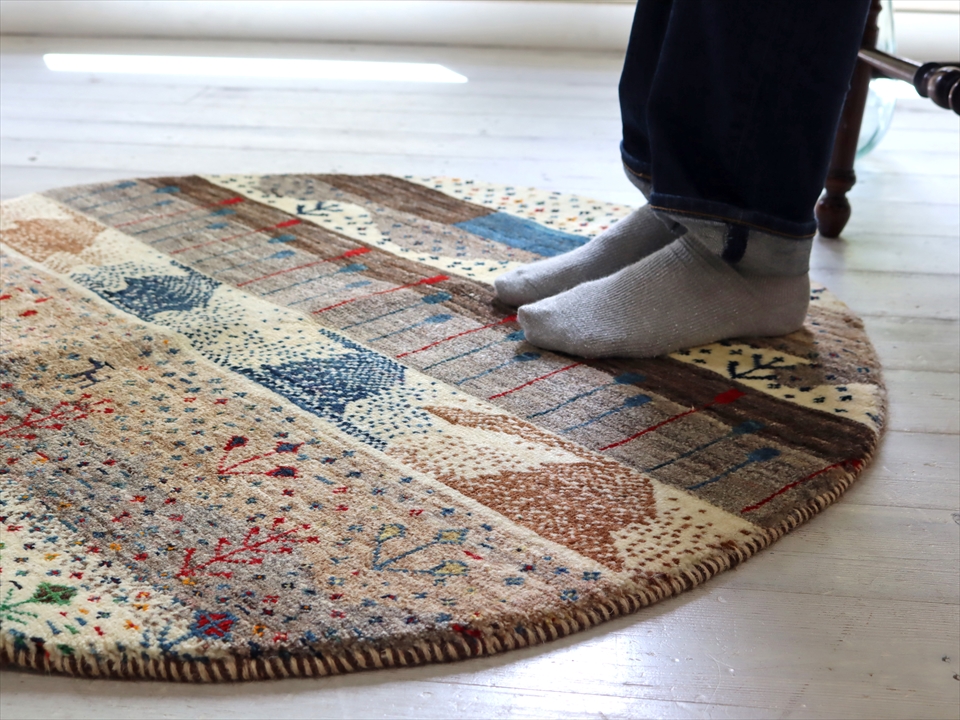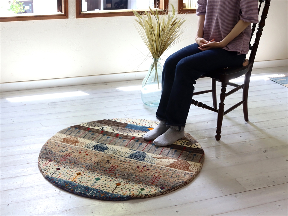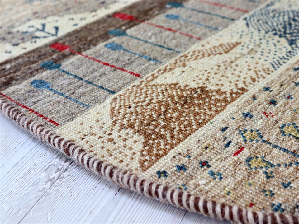 - ギャッベ 円形 直径91cm 羊毛のナチュラルカラー 自然の景色 生命の樹と太陽