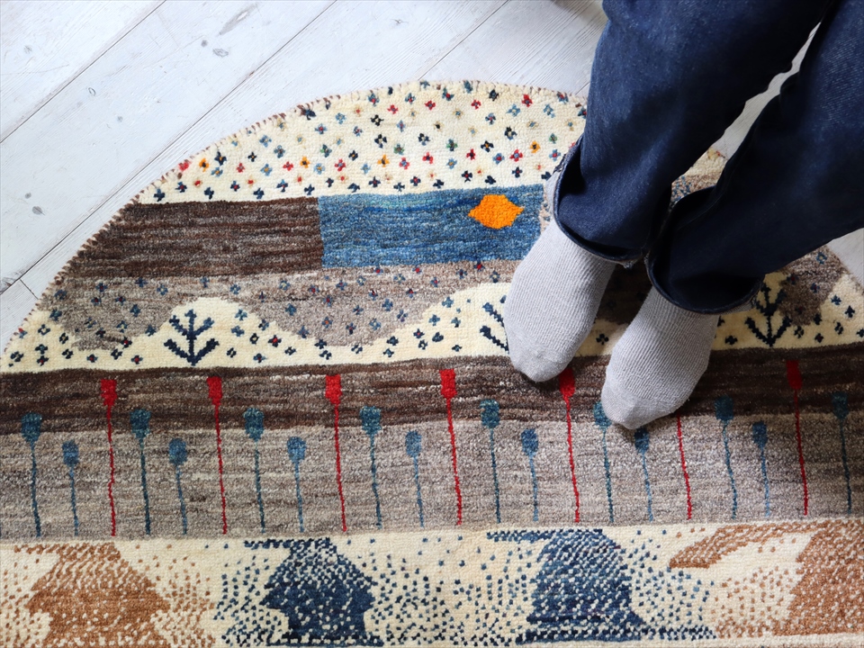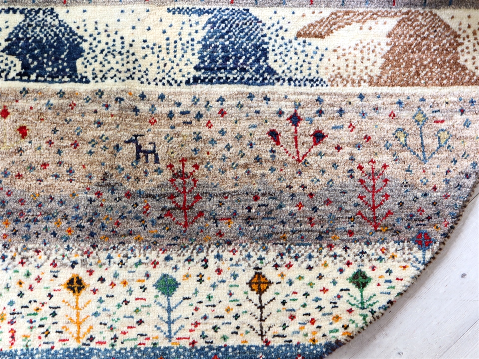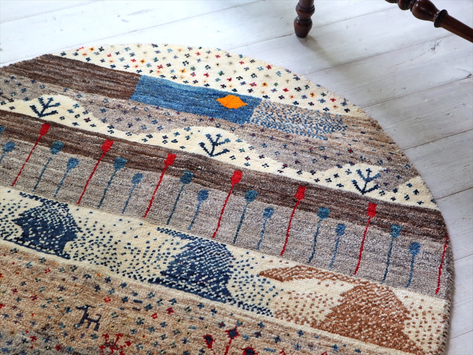 | 全体的に無染色の羊毛のアイボリーやベージュの色合いを使って明るく落ち着いた印象の円形ギャッベ。遠くに山と太陽の見える風景画で、全体に小花やドットが細かく織られいたり、変わったカタチの植物が織り込まれていたり、ユーモアが感じられます。 |