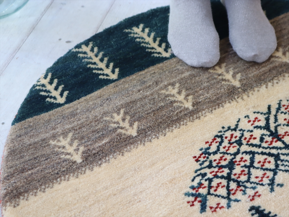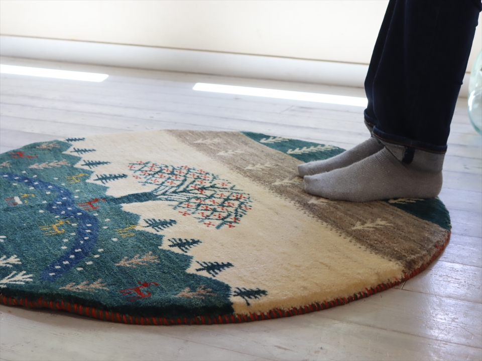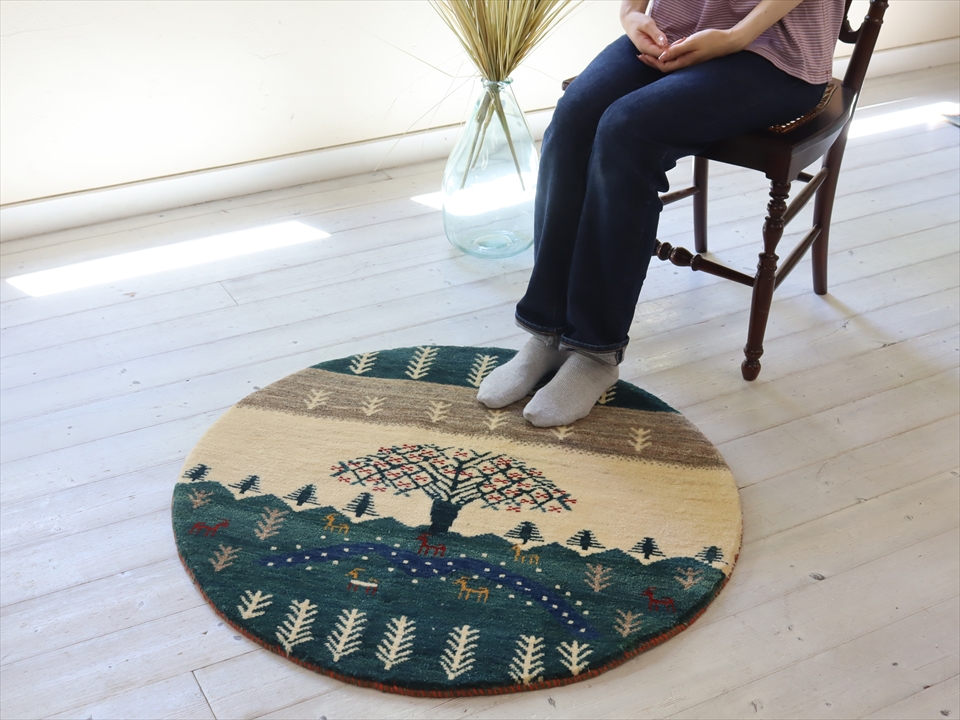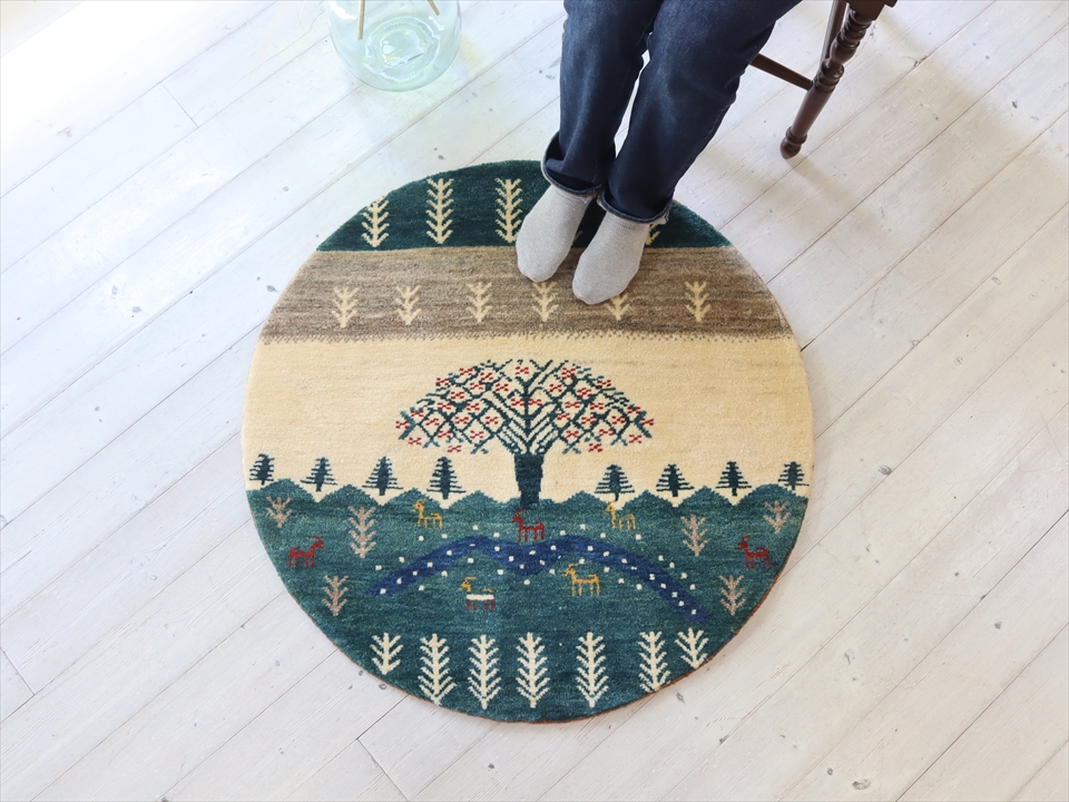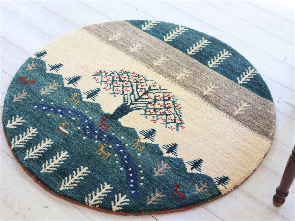 ギャッベ 円形 直径85cm ブルーグリーン&ナチュラルアイボリー 自然風景 生命の樹