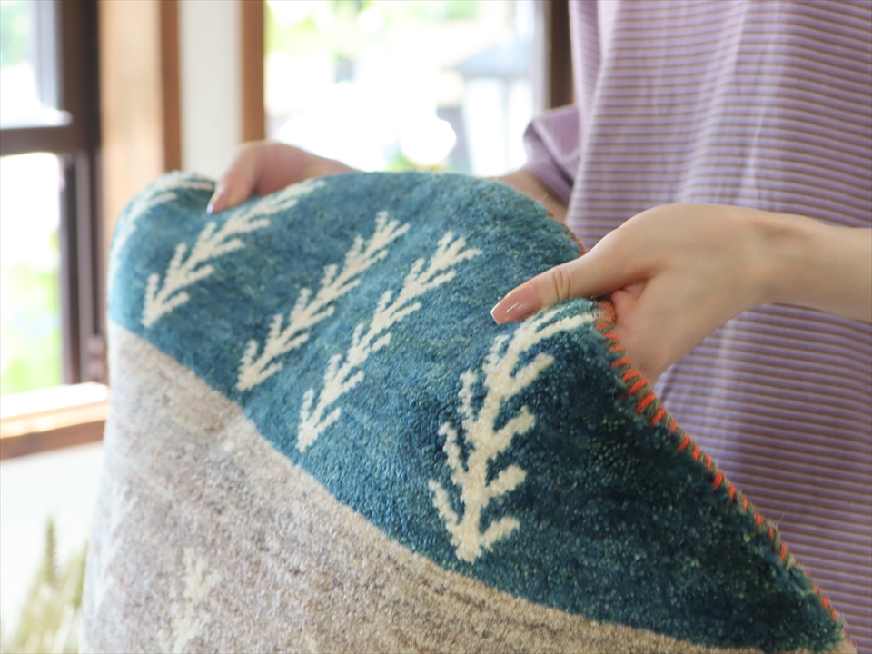 - ギャッベ 円形 直径85cm ブルーグリーン&ナチュラルアイボリー 自然風景 生命の樹