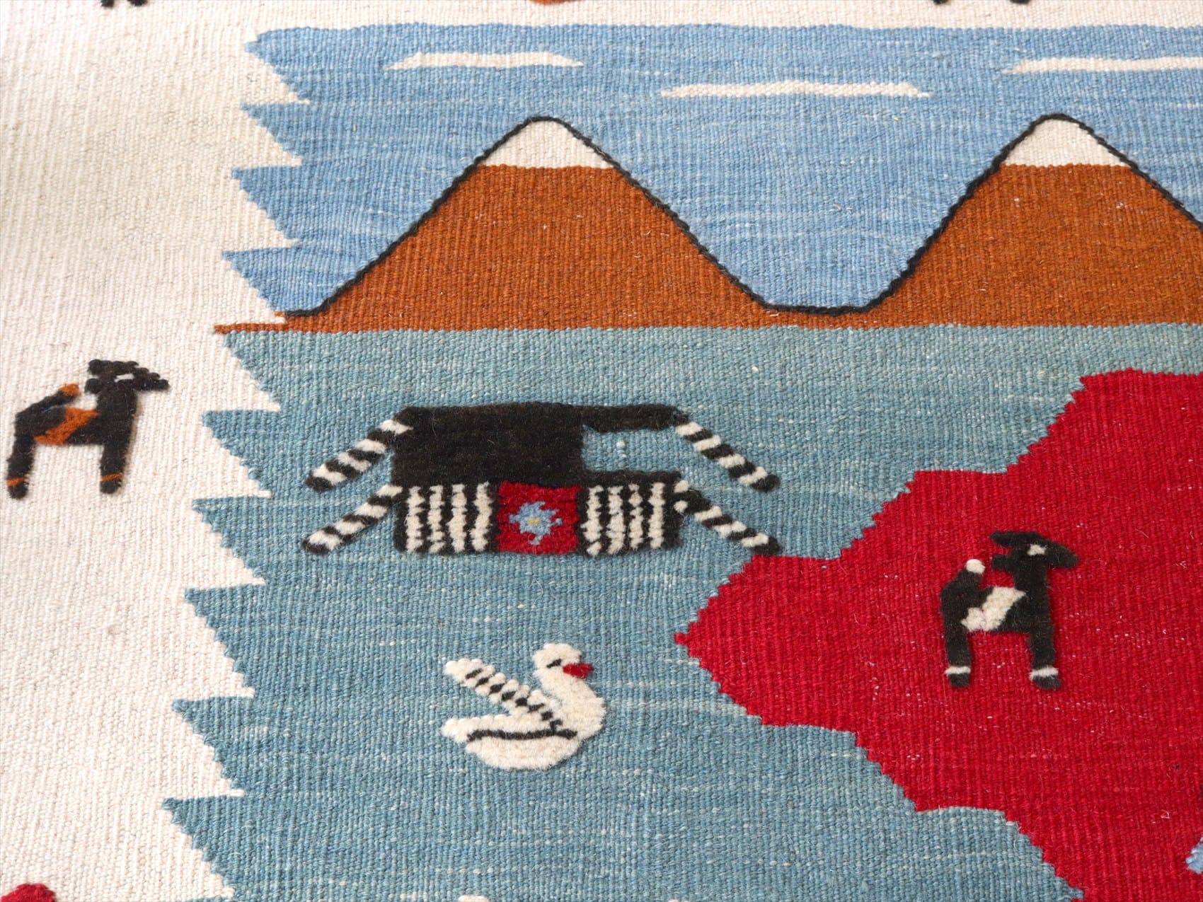 | イラン南西部、ザクロス山脈の麓に暮らすカシュカイ族の楽しいキリム。現在でも遊牧生活を続けているカシュカイ族の生活の様子とのどかな風景が描かれています。 それぞれのモチーフは、平織りのキリムの中に、パイル(毛足)のある立体的なカーペット織りで織り込まれていて、今にも動き出しそうに生き生きと描かれています。敷物として使うほか、タペストリーとして飾ってもユニークです。 |