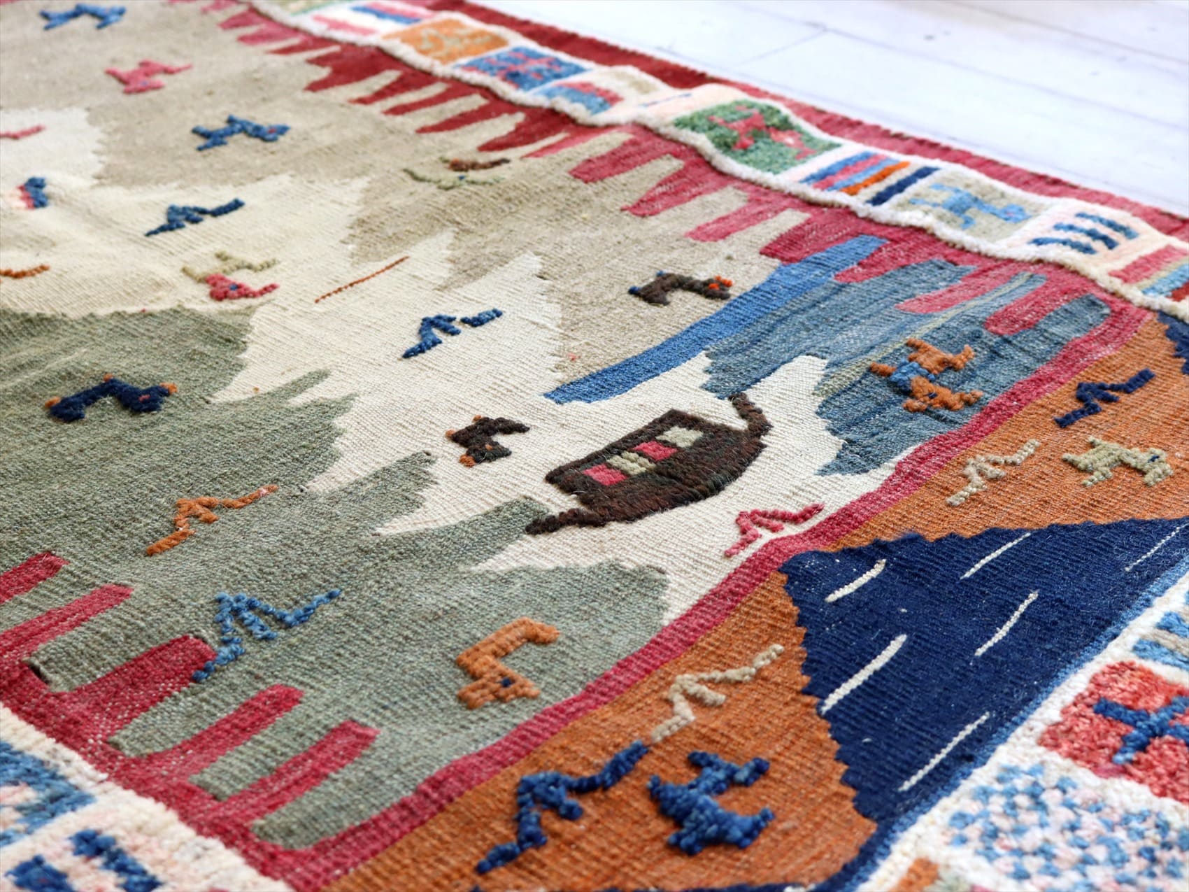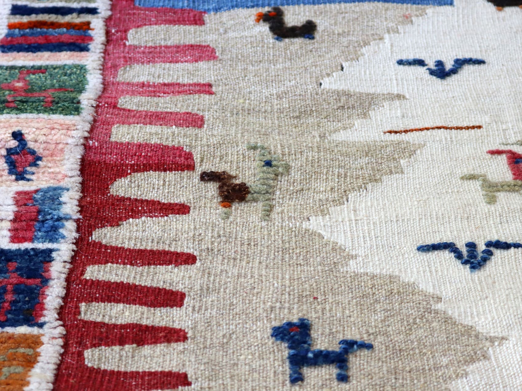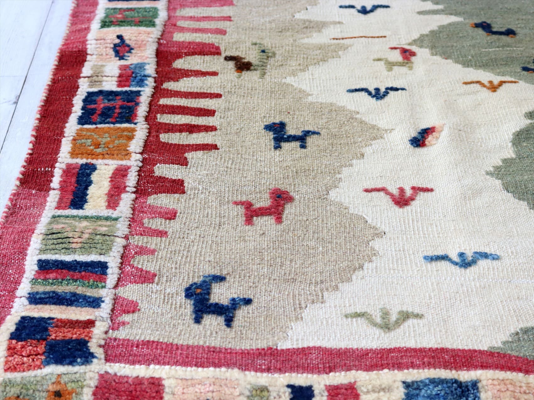 | イラン南西部、ザクロス山脈の麓に暮らすカシュカイ族の楽しいキリム。現在でも遊牧生活を続けているカシュカイ族の生活の様子とのどかな風景が描かれています。 それぞれのモチーフは、平織りのキリムの中に、パイル(毛足)のある立体的なカーペット織りで織り込まれていて、今にも動き出しそうに生き生きと描かれています。敷物として使うほか、タペストリーとして飾ってもユニークです。 |