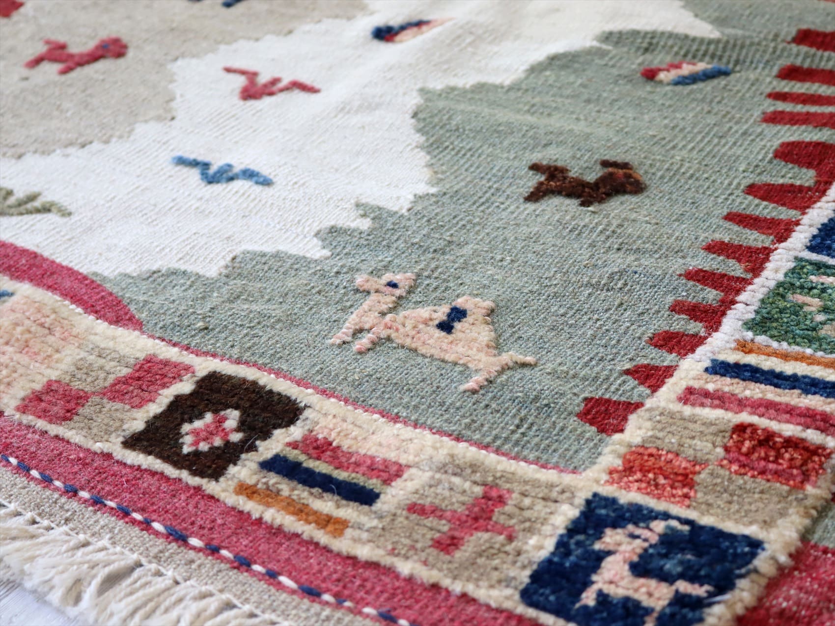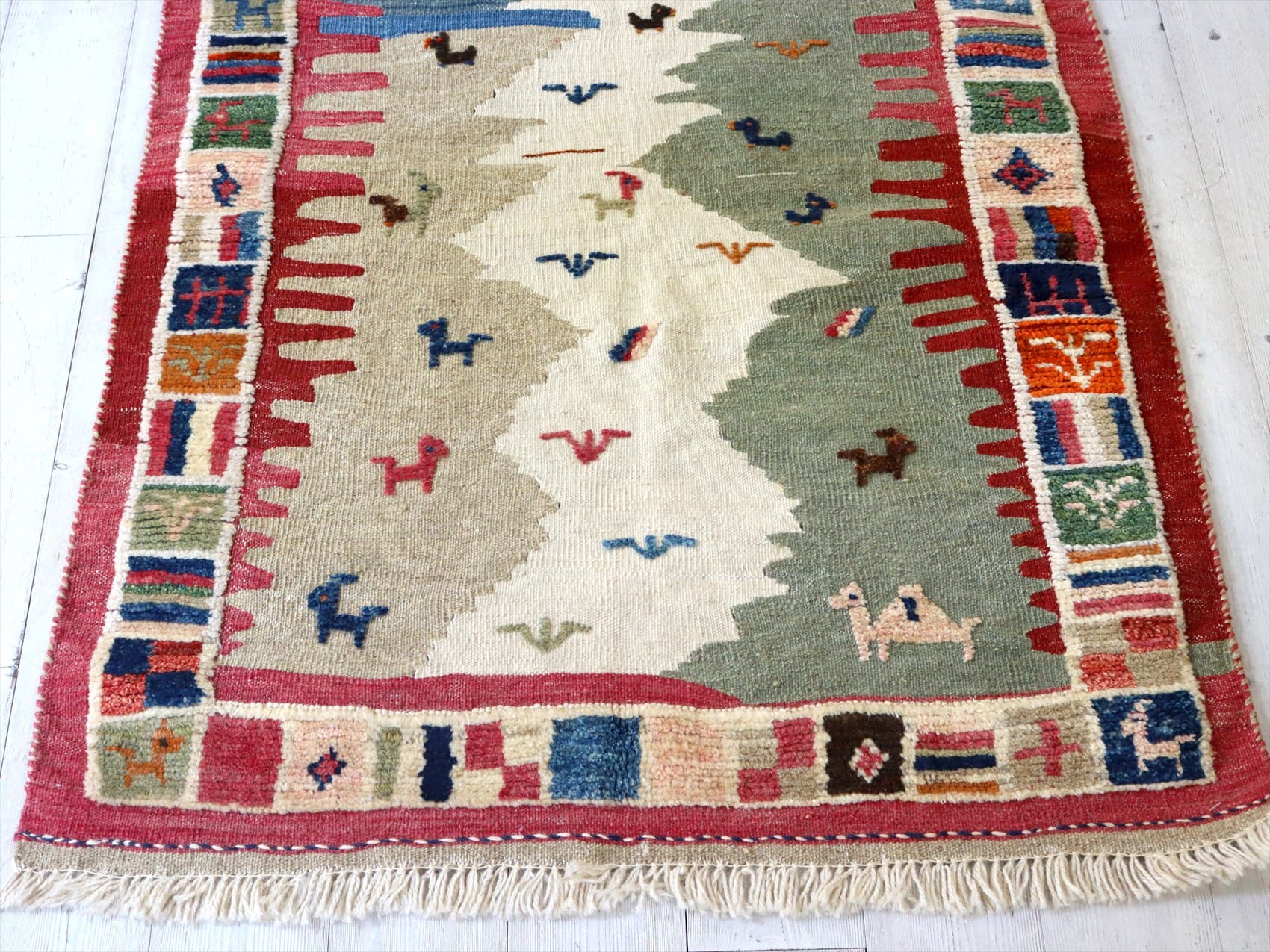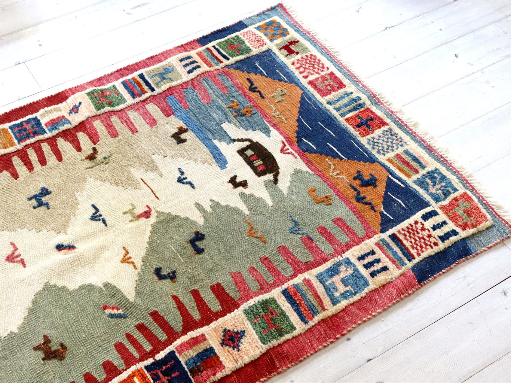 | イラン南西部、ザクロス山脈の麓に暮らすカシュカイ族の楽しいキリム。現在でも遊牧生活を続けているカシュカイ族の生活の様子とのどかな風景が描かれています。 それぞれのモチーフは、平織りのキリムの中に、パイル(毛足)のある立体的なカーペット織りで織り込まれていて、今にも動き出しそうに生き生きと描かれています。敷物として使うほか、タペストリーとして飾ってもユニークです。 |