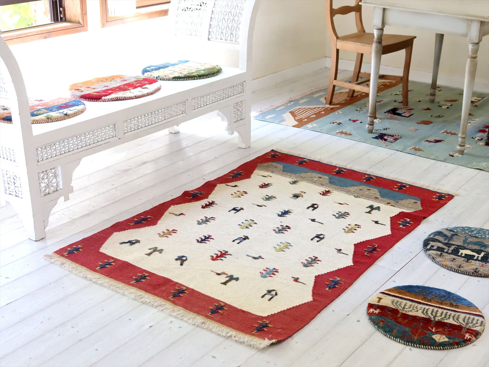 | イラン南西部、ザクロス山脈の麓に暮らすカシュカイ族の楽しいキリム。現在でも遊牧生活を続けているカシュカイ族の生活の様子とのどかな風景が描かれています。 それぞれのモチーフは、平織りのキリムの中に、パイル(毛足)のある立体的なカーペット織りで織り込まれていて、今にも動き出しそうに生き生きと描かれています。敷物として使うほか、タペストリーとして飾ってもユニークです。 |