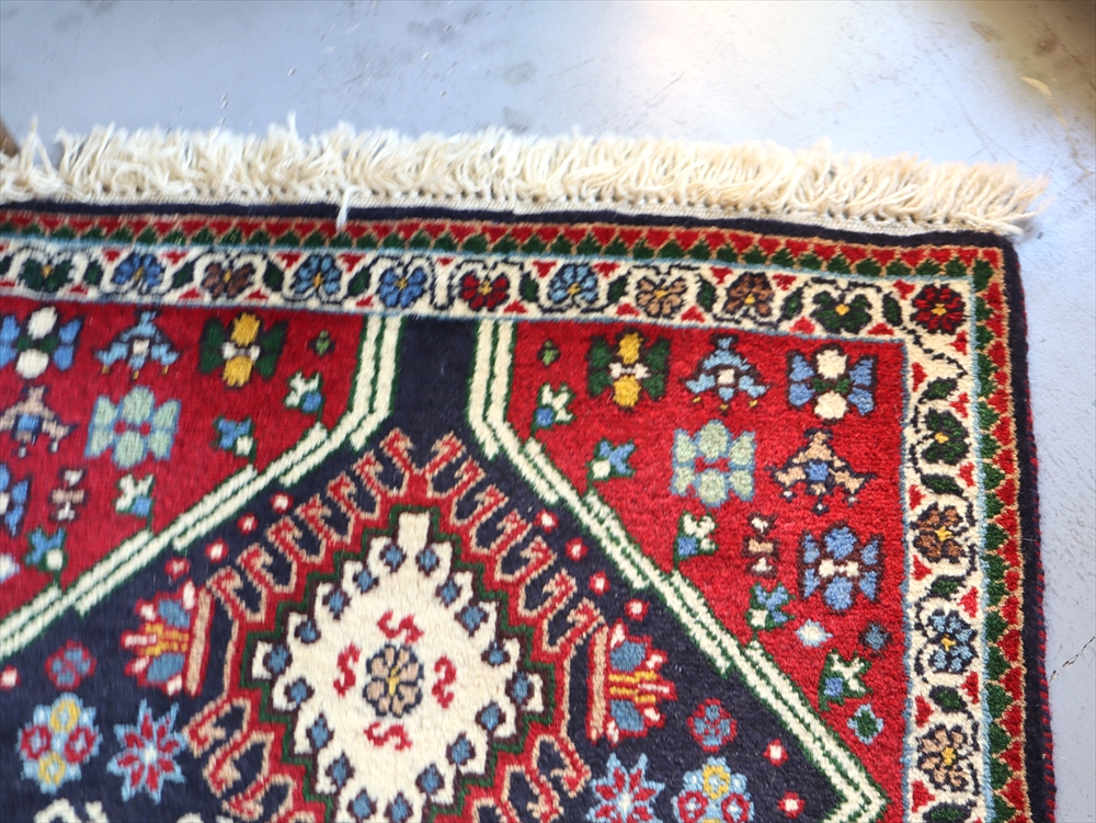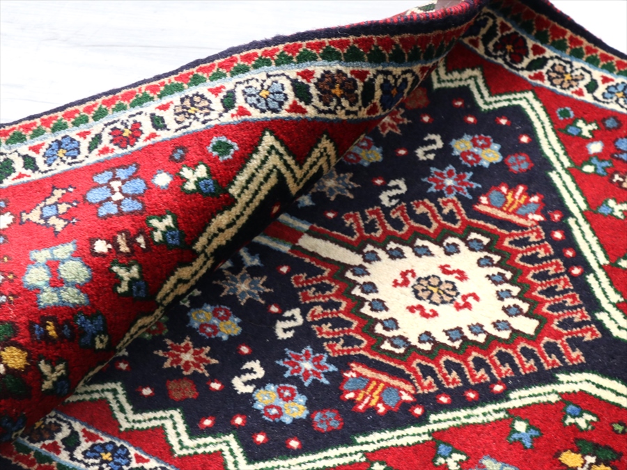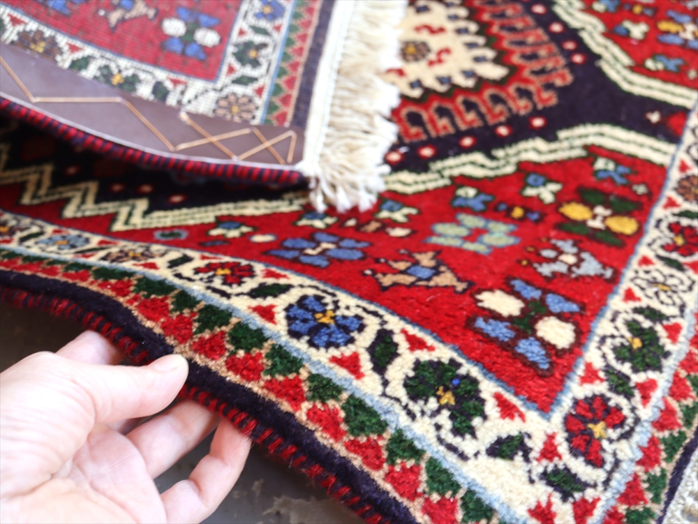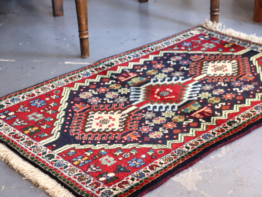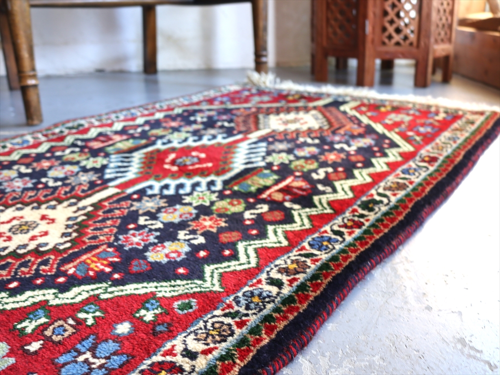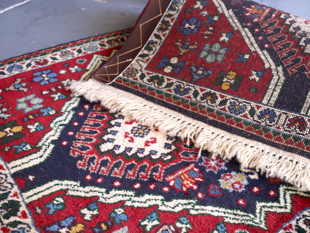 | 複雑に入り組んだドラゴンの爪をまとったひし形メダリオンの周りに花のモチーフが並べられたヤラメカーペット。 黒に見える部分は濃紺です。 ヤラメ(Yalameh)とは、ギャベを織るカシュカイ族の中でも早い段階で定住生活に入ったグループで、現在では古都イスファハンからシーラーズの間のエリアに点在して多く暮らしています。 トルコ語に近い言語を話し、じゅうたんのデザインもまたキリムに似た幾何学モチーフが使われています。 細かく整った模様、やわらかく光沢のある質感が特徴です。 |