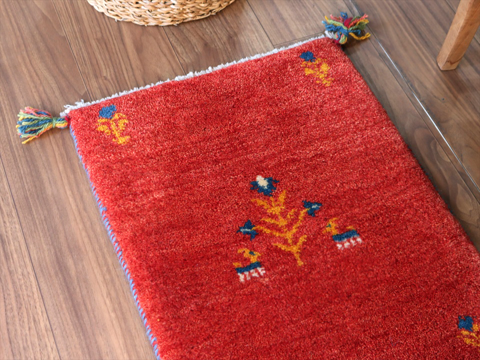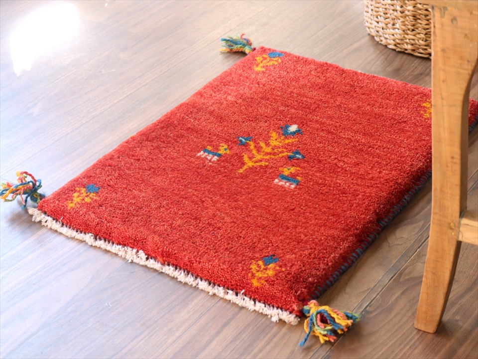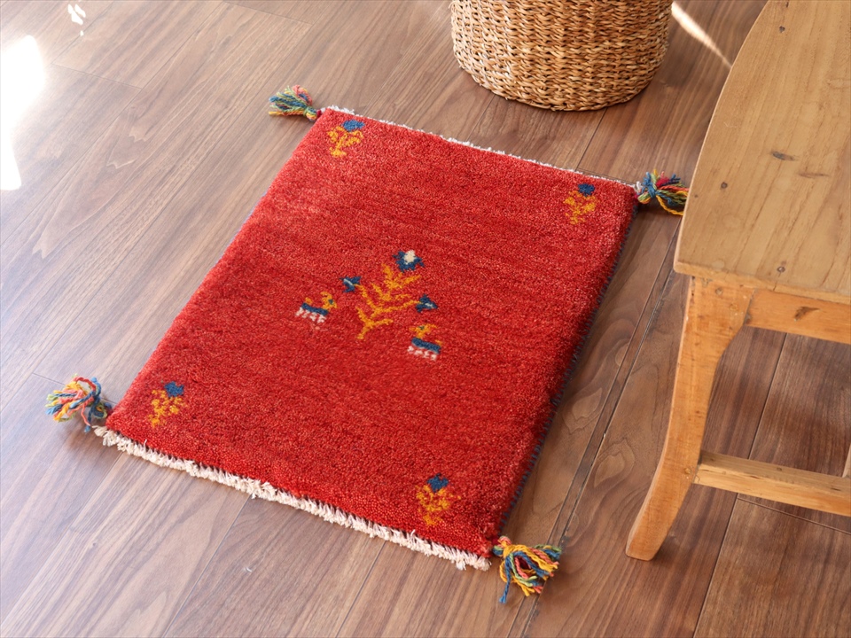 - ギャッベ イランの手織りラグ GABBEH58×45cm レッド 花咲く生命の樹とヤギ
