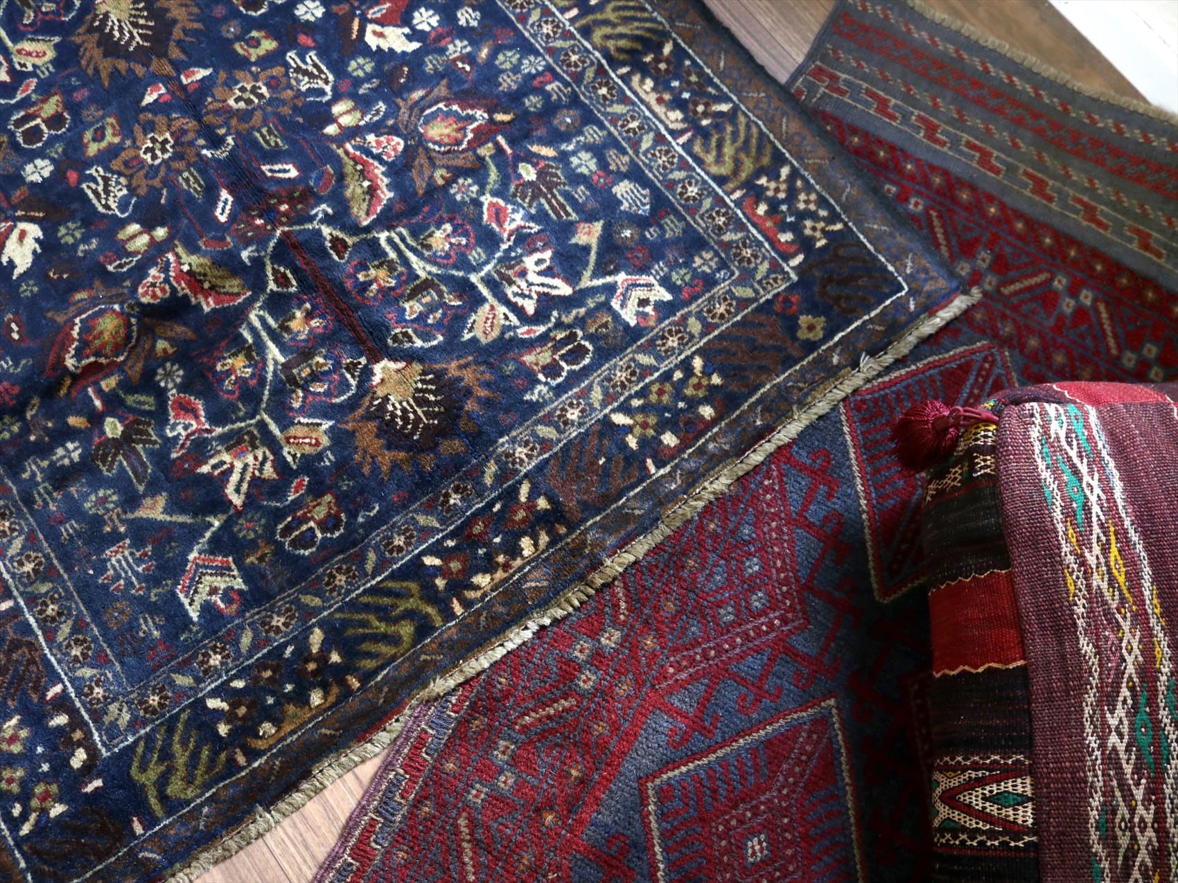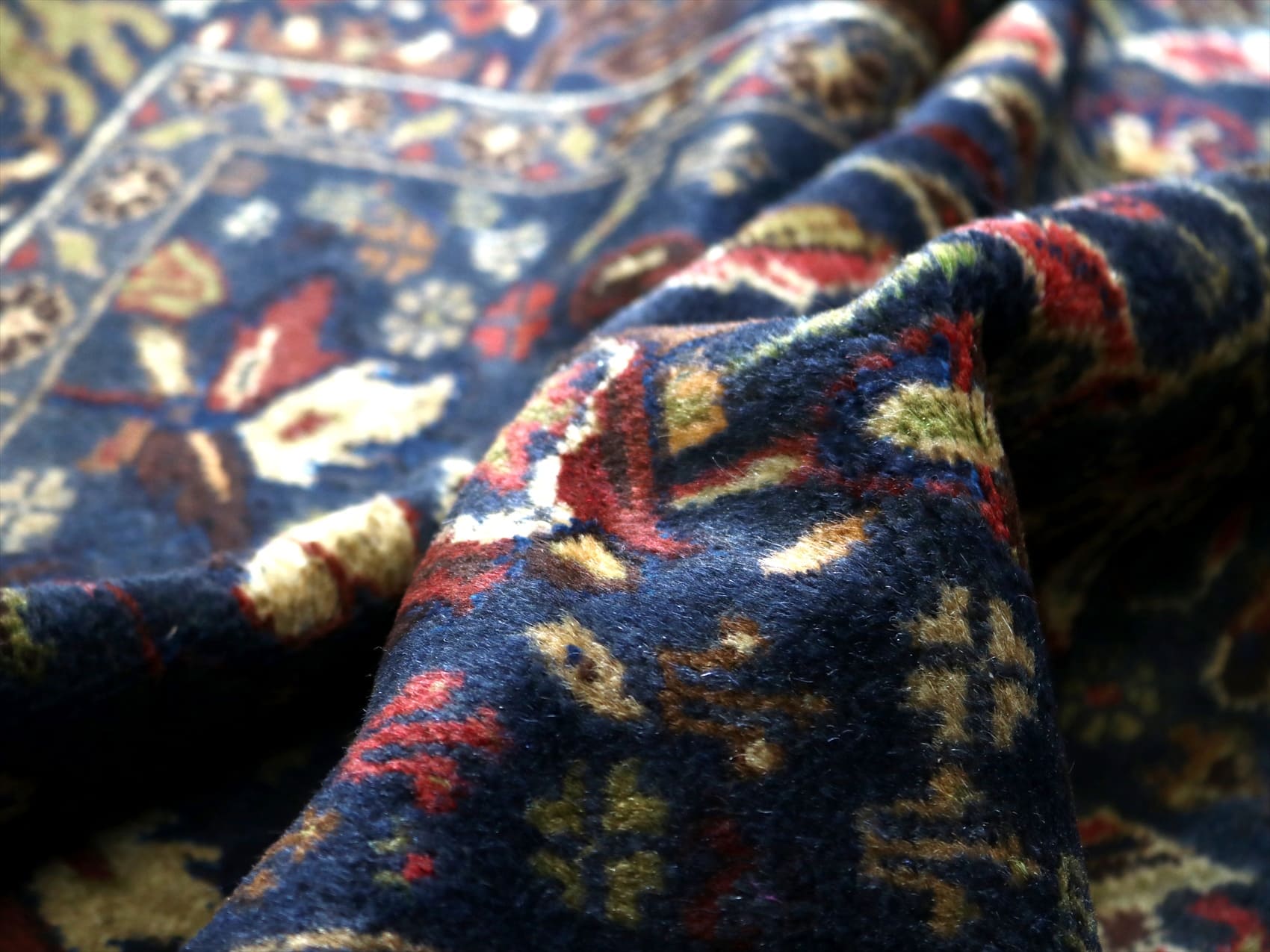 | 目が詰まって細かな織り。パイル(毛足)は短めで、ラグ全体の厚みは5-6mm程度。目立つダメージはありません。コンテナ到着直後の撮影の為、少し織りジワが残っていますが、しばらくするとフラットになりますのでご了承ください。 |
