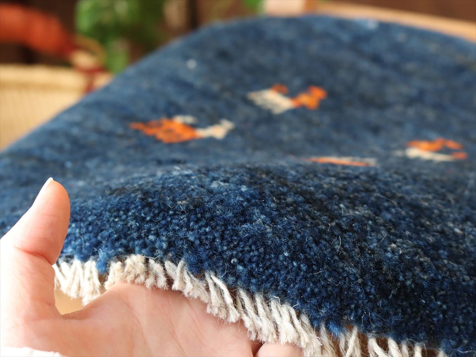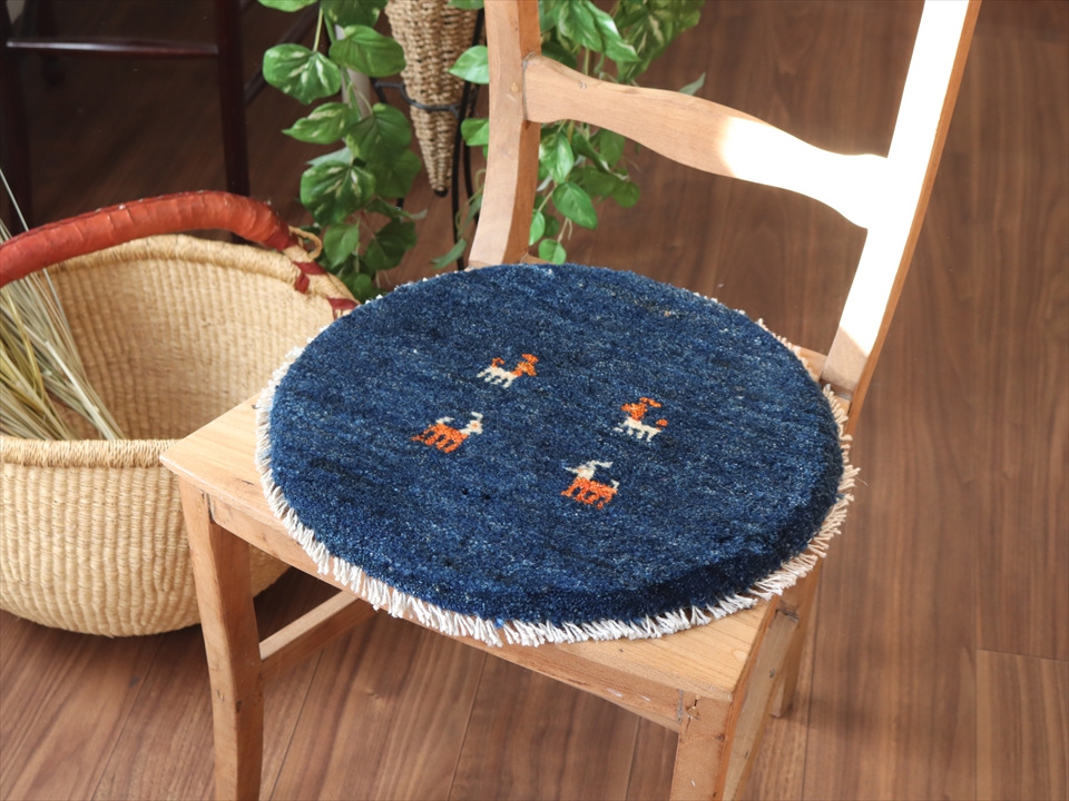 | 草木染めしたブルーの地に動物モチーフが入った円形のギャッベ。ふかふかした毛足(パイル)で、手触りが気持ちいい手織りラグ。座布団代わりに床や椅子に敷いたり、車の座席シートにもおすすめです。手織りならではの一枚一枚違ったテイストをお楽しみください。 |