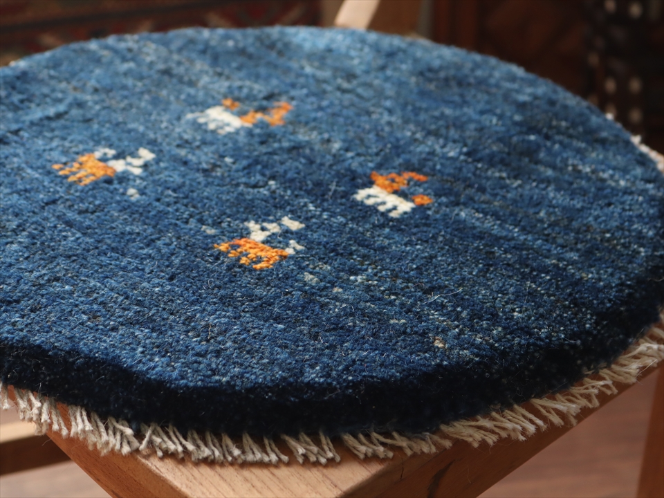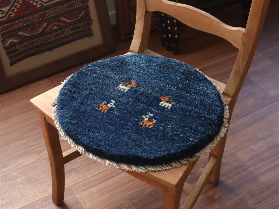 | 草木染めしたブルーの地に動物モチーフが入った円形のギャッベ。ふかふかした毛足(パイル)で、手触りが気持ちいい手織りラグ。座布団代わりに床や椅子に敷いたり、車の座席シートにもおすすめです。手織りならではの一枚一枚違ったテイストをお楽しみください。 |