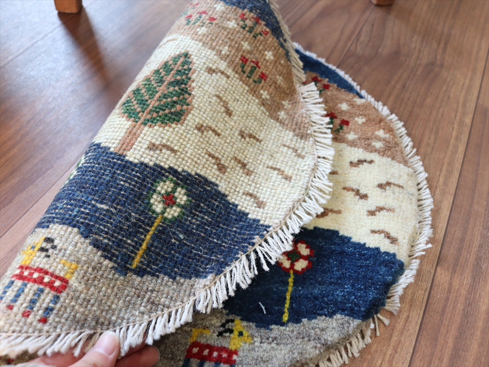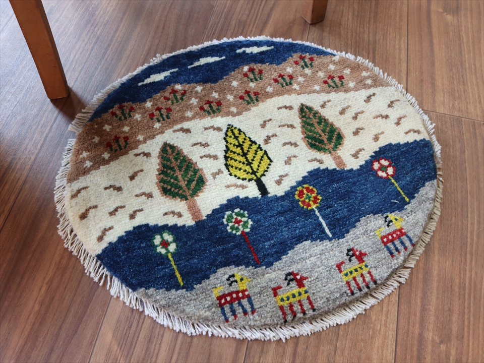 ギャッベ 円形 座布団サイズ41×46cm 色とりどりのボーダー 動物たちの暮らす自然風景
