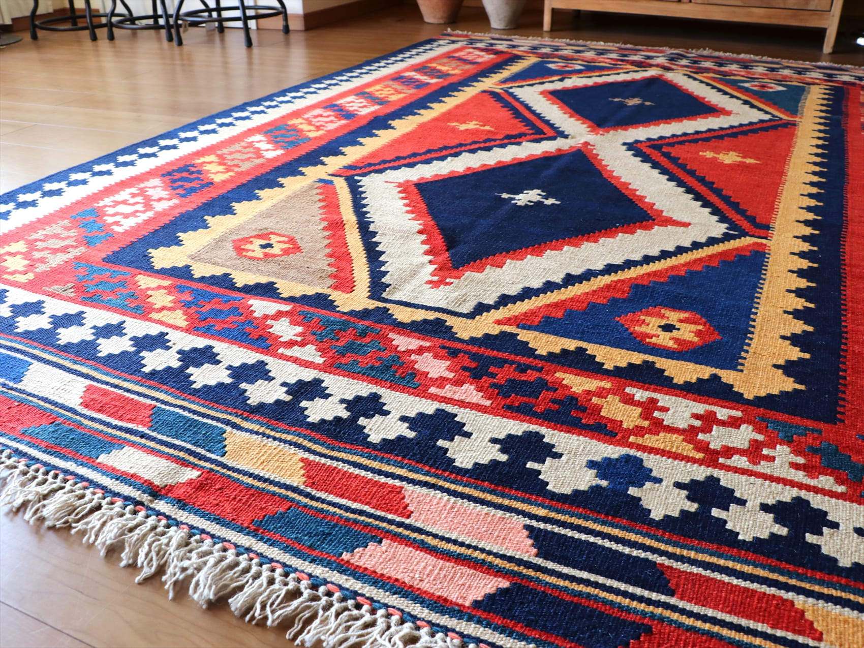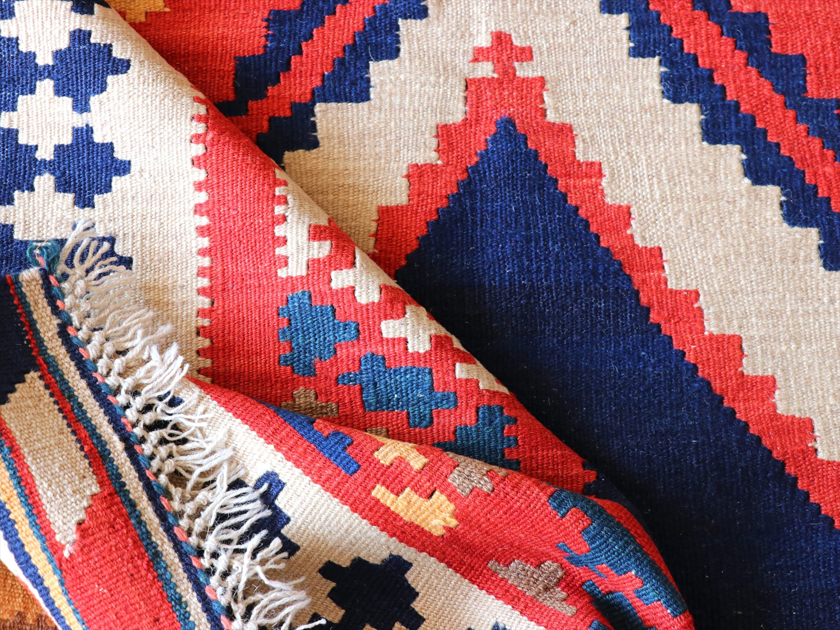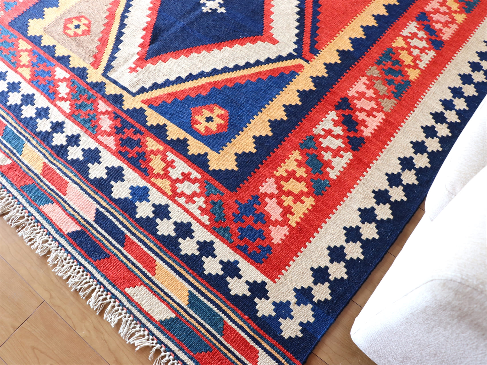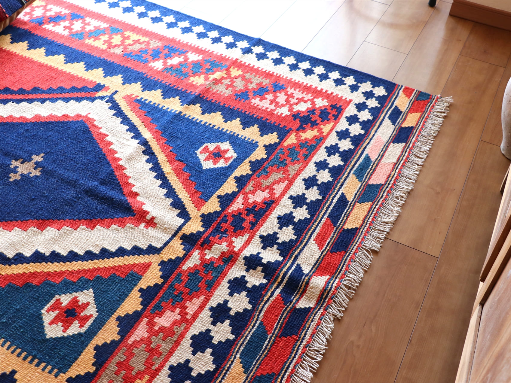| 明るい発色がきれいな、手織りキリム。ギャッベを織ることで知られる、イラン南部の遊牧民「カシュカイ」の人々が現在も織り続けている、伝統的なデザインのキリムです。新しく織っているということもあり、かなり整った仕上がりですが、よく見ると手織りならではの個性的な表情が一枚一枚にあり、温かみのある印象です。 |