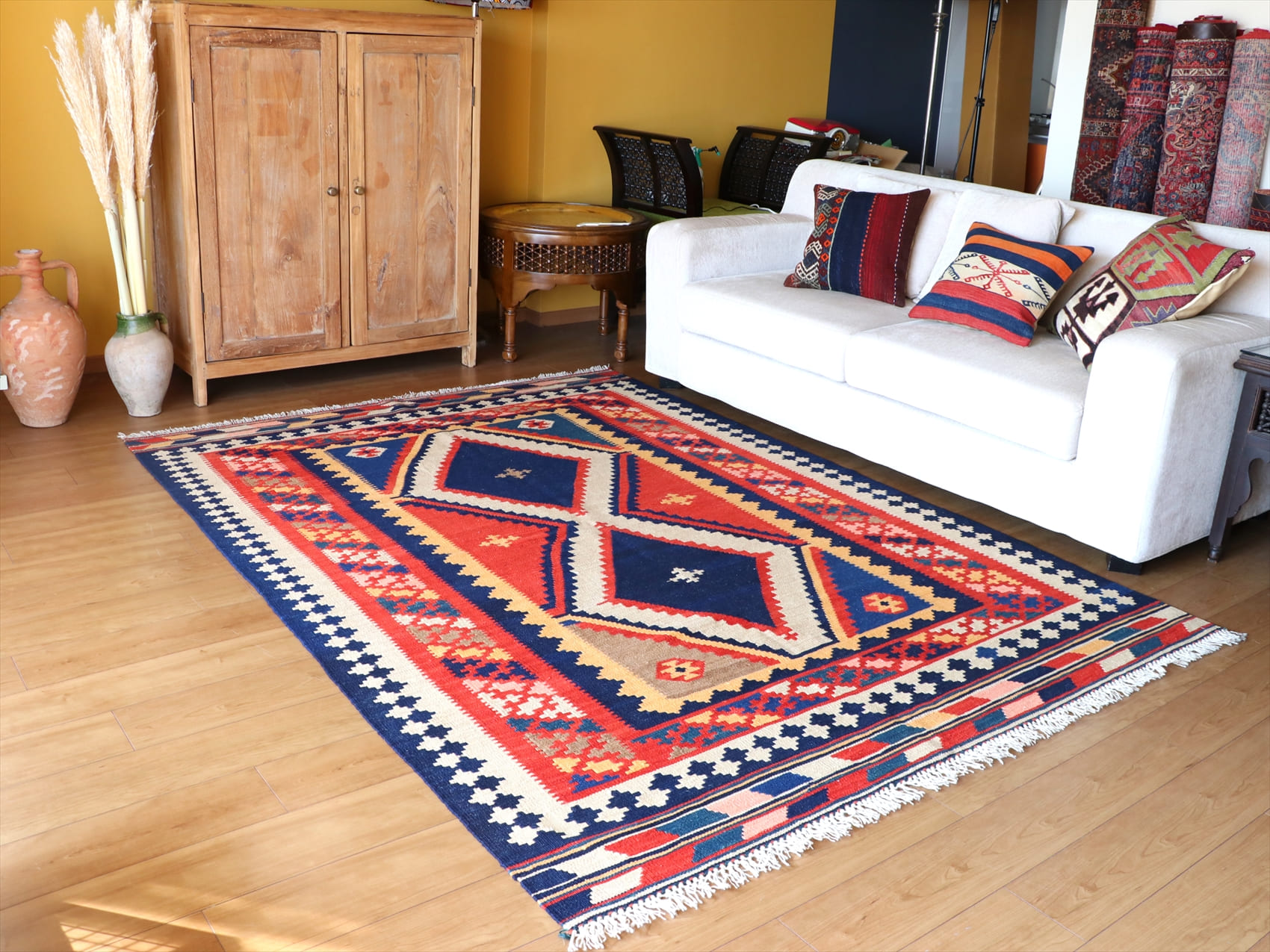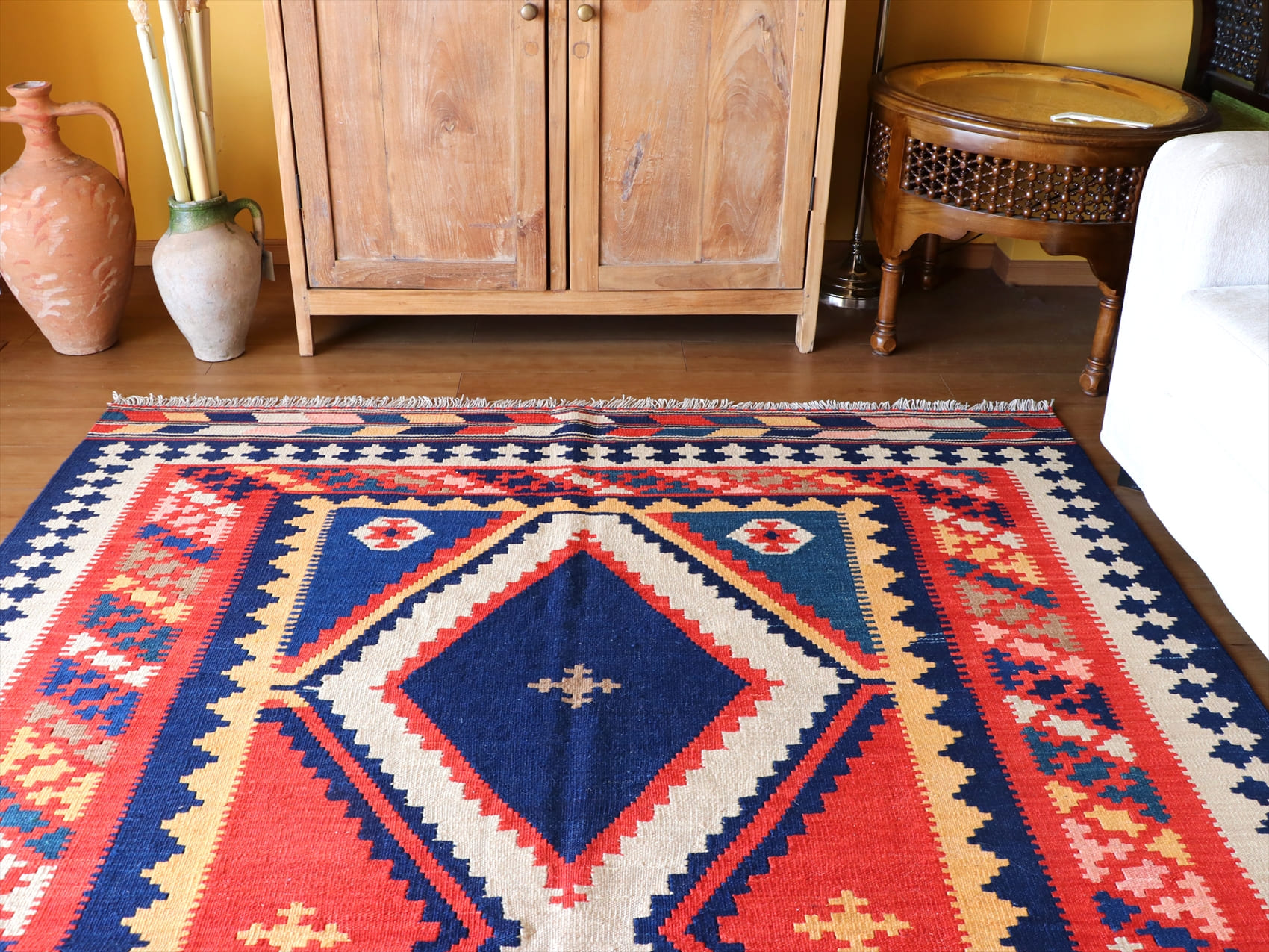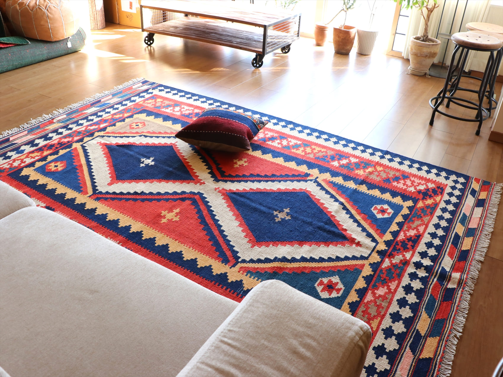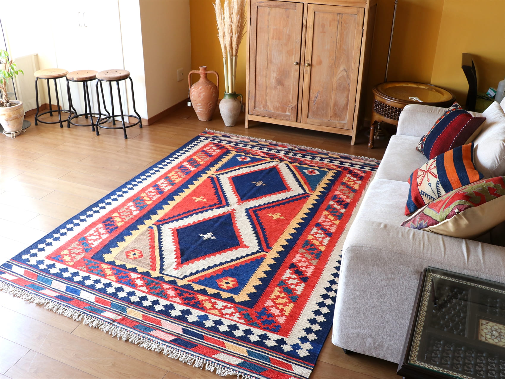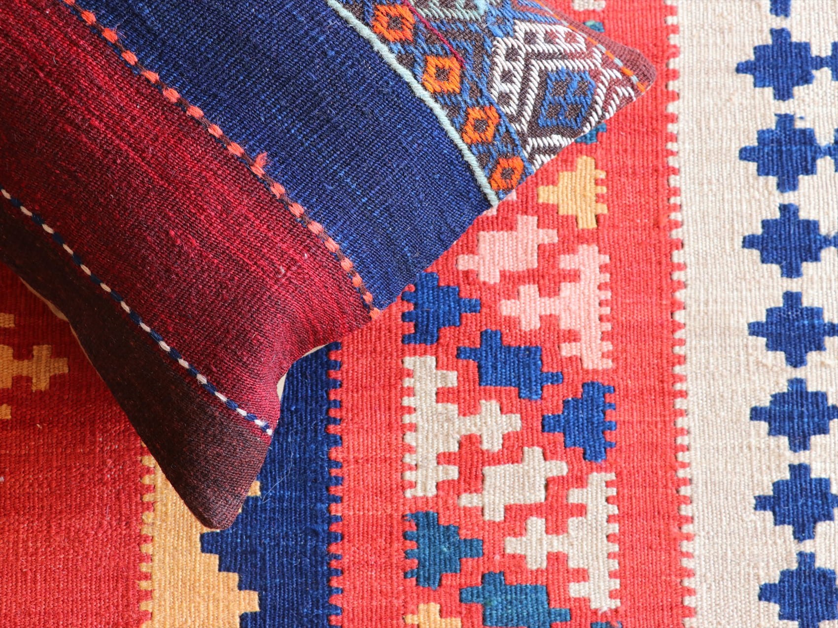 | 明るい発色がきれいな、手織りキリム。ギャッベを織ることで知られる、イラン南部の遊牧民「カシュカイ」の人々が現在も織り続けている、伝統的なデザインのキリムです。新しく織っているということもあり、かなり整った仕上がりですが、よく見ると手織りならではの個性的な表情が一枚一枚にあり、温かみのある印象です。 |