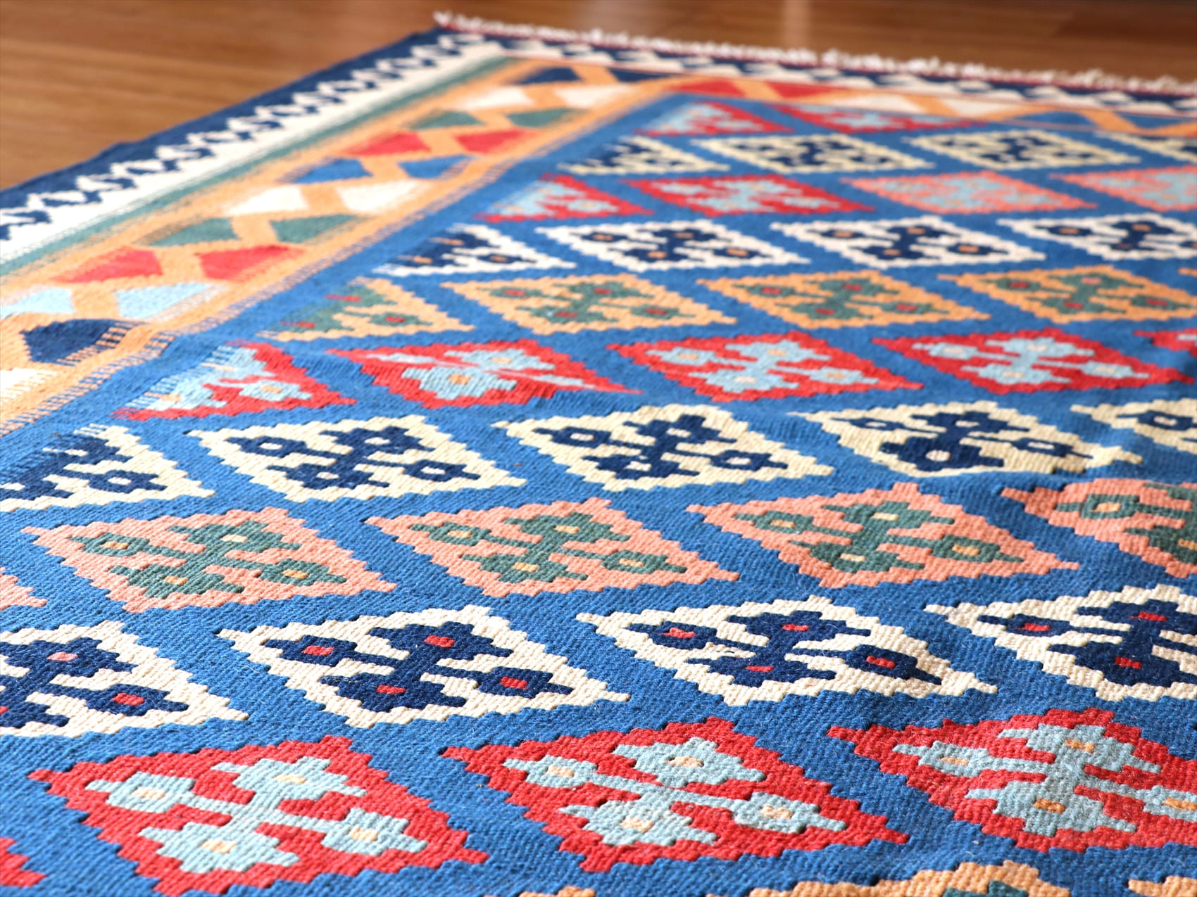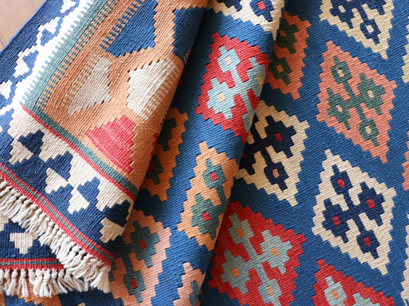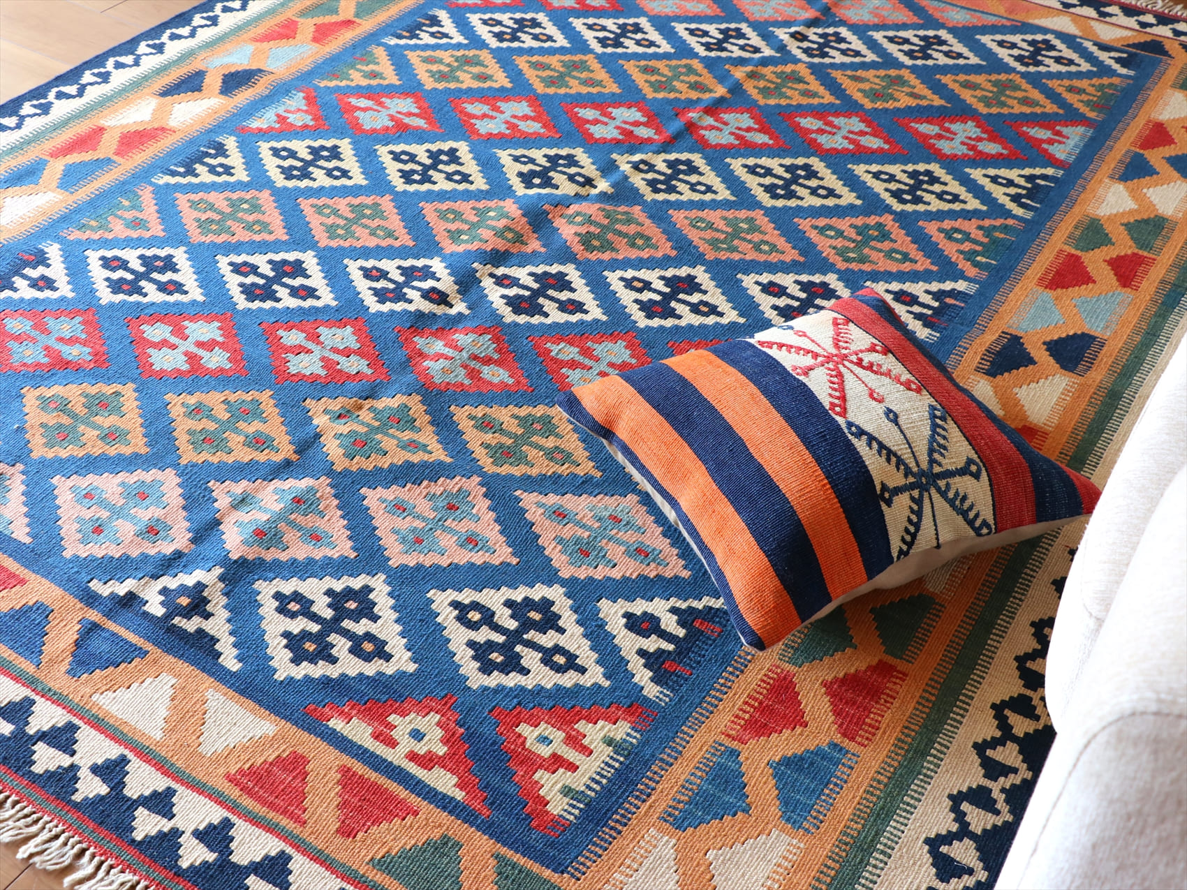 | 明るい発色がきれいな、手織りキリム。ギャッベを織ることで知られる、イラン南部の遊牧民「カシュカイ」の人々が現在も織り続けている、伝統的なデザインのキリムです。新しく織っているということもあり、かなり整った仕上がりですが、よく見ると手織りならではの個性的な表情が一枚一枚にあり、温かみのある印象です。 |