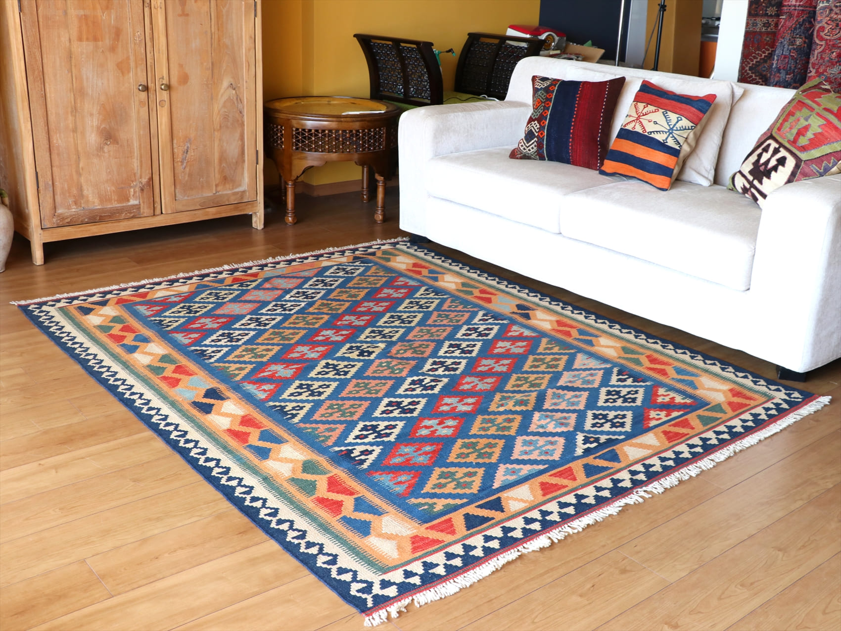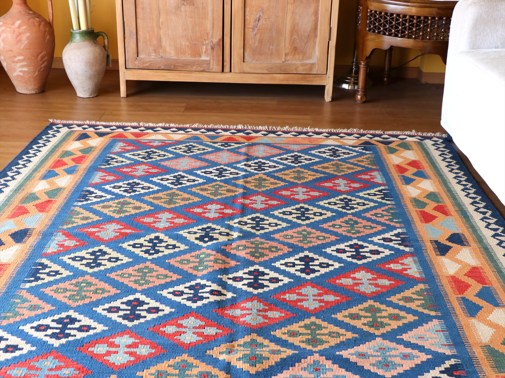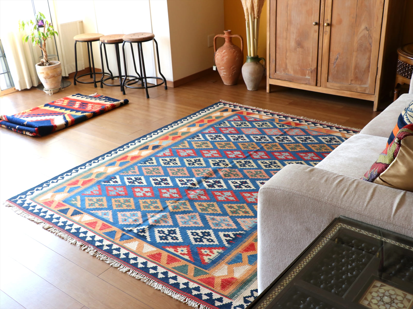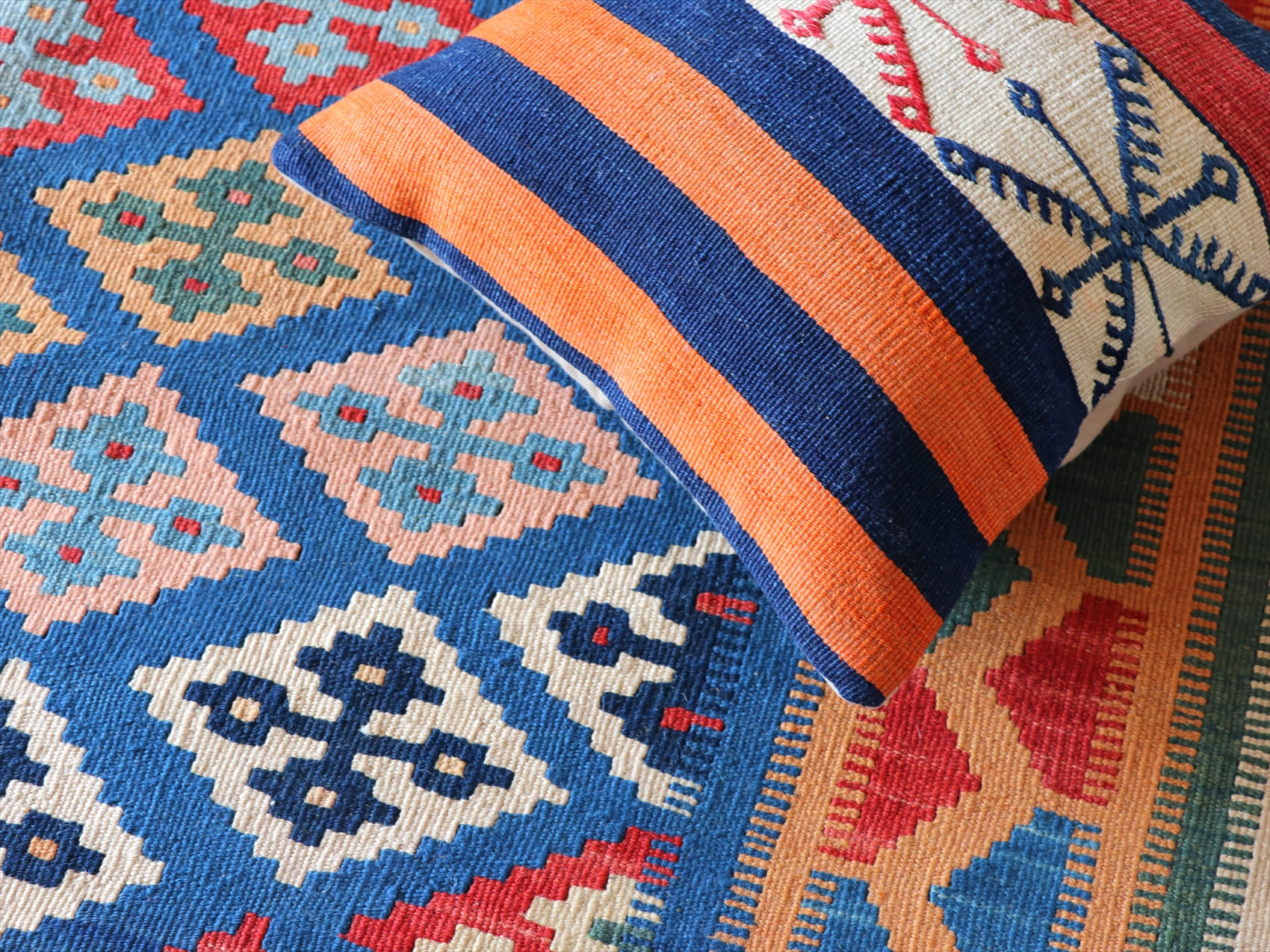 | 明るい発色がきれいな、手織りキリム。ギャッベを織ることで知られる、イラン南部の遊牧民「カシュカイ」の人々が現在も織り続けている、伝統的なデザインのキリムです。新しく織っているということもあり、かなり整った仕上がりですが、よく見ると手織りならではの個性的な表情が一枚一枚にあり、温かみのある印象です。 |