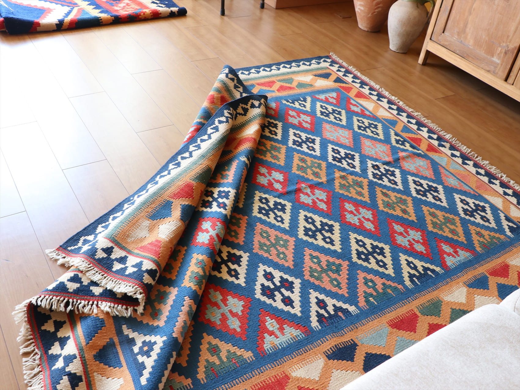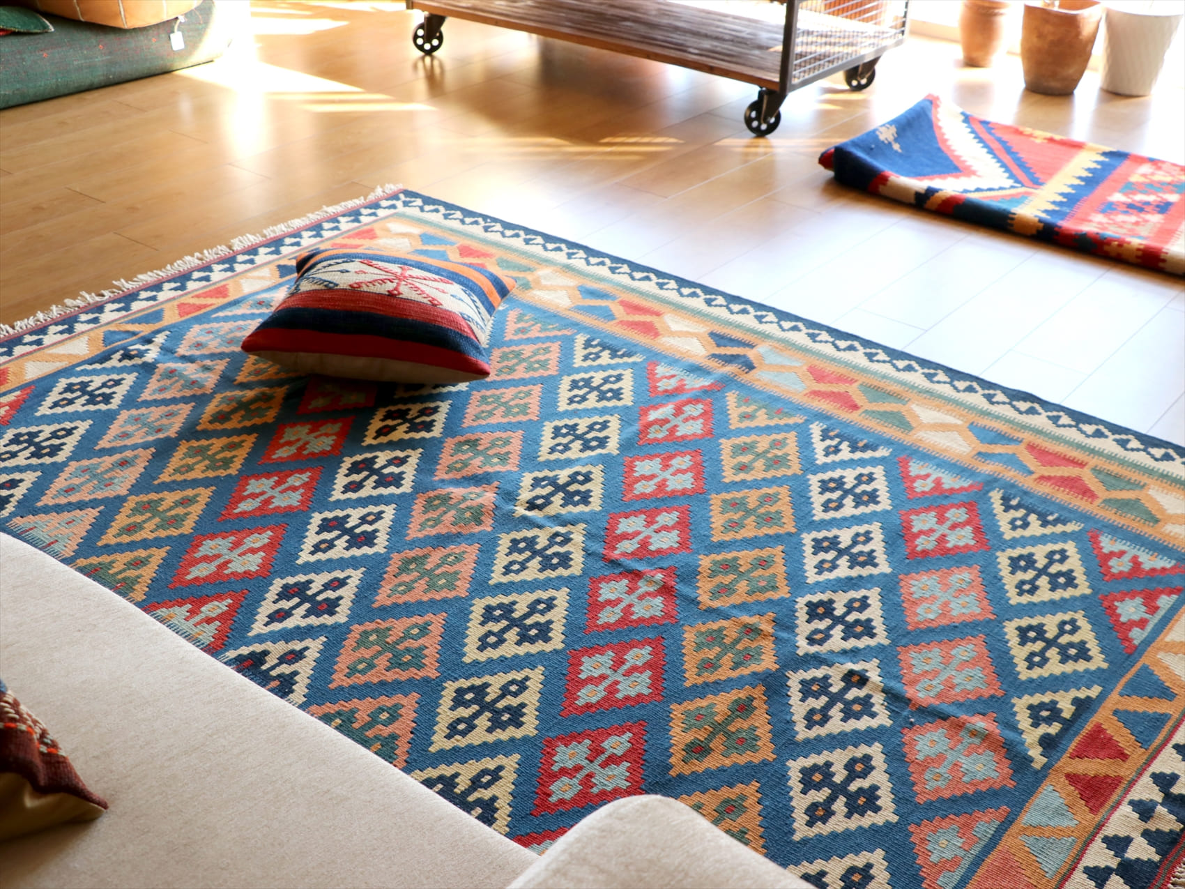 | スリット織りで、色の切り替え部分に隙間はあるものの、織り目は引き締まっているので、あまり気になりません。ダイニングテーブルの下に敷くなどにおすすめです。 |