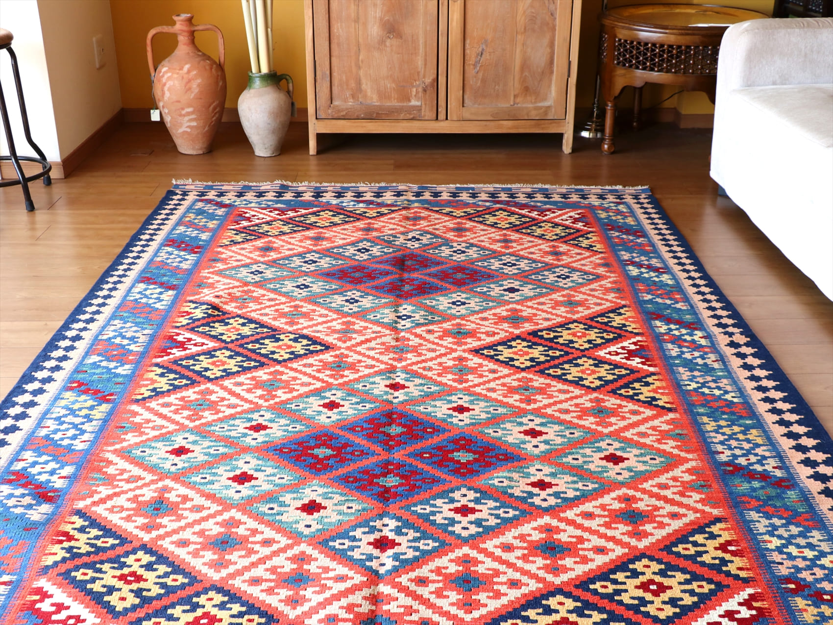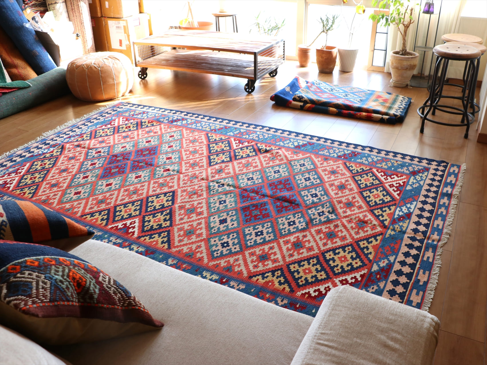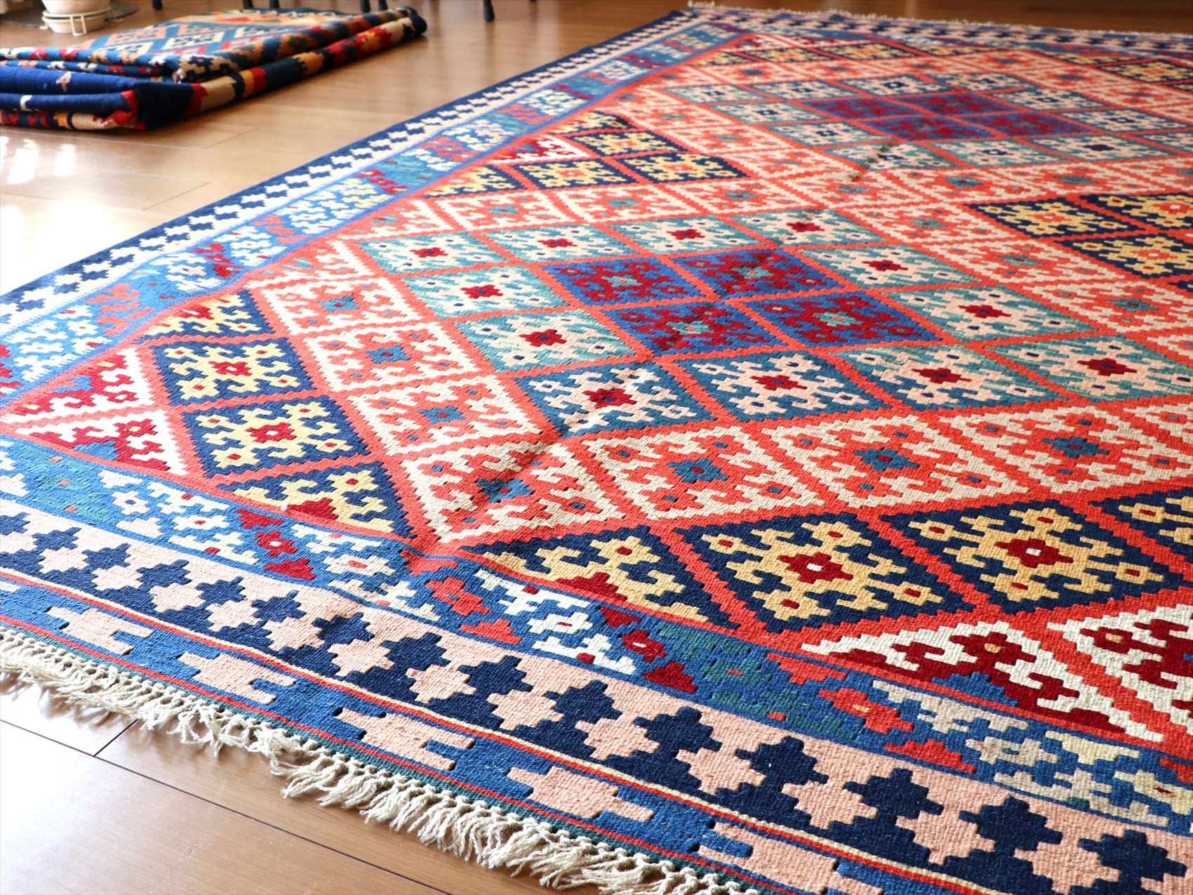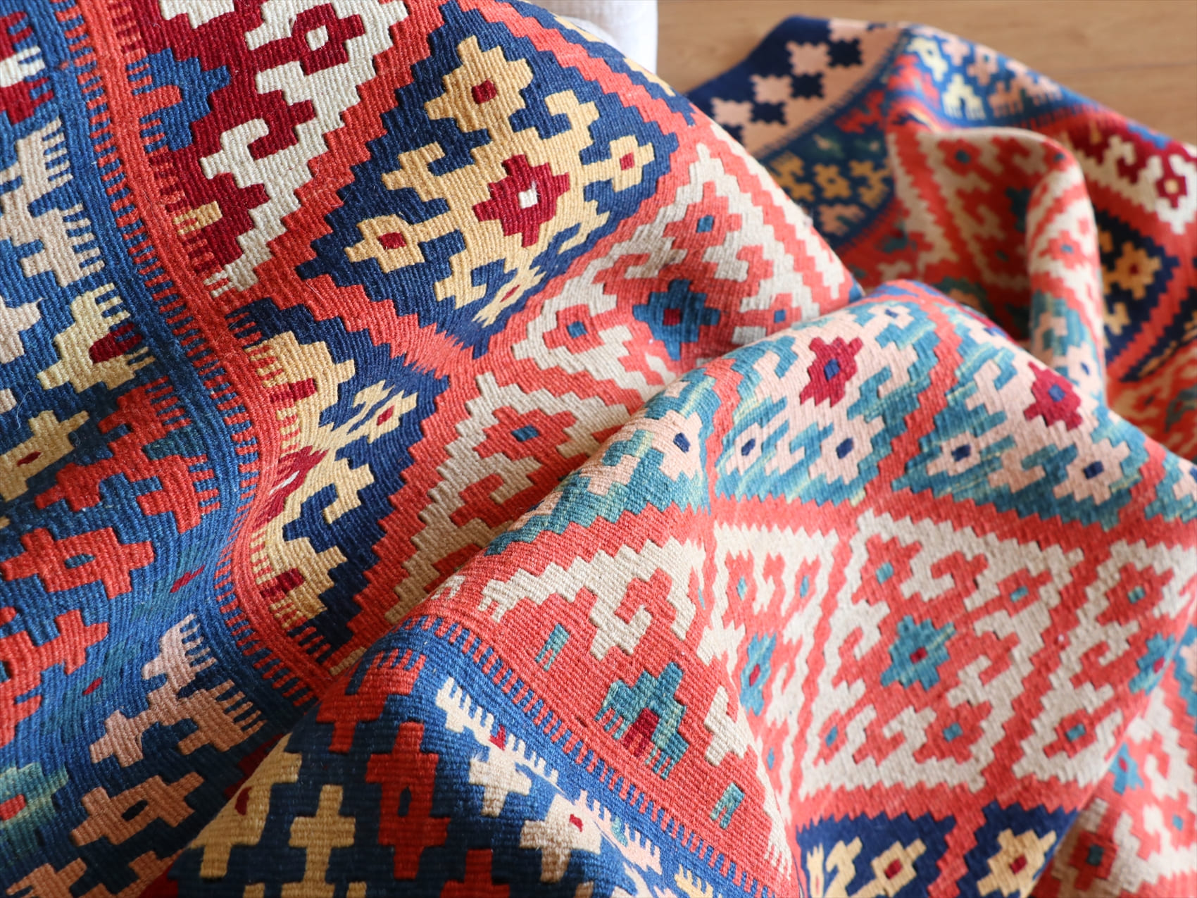 | 明るい発色がきれいな、手織りキリム。ギャッベを織ることで知られる、イラン南部の遊牧民「カシュカイ」の人々が現在も織り続けている、伝統的なデザインのキリムです。新しく織っているということもあり、かなり整った仕上がりですが、よく見ると手織りならではの個性的な表情が一枚一枚にあり、温かみのある印象です。 |